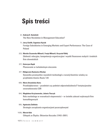 Spis treści 2 | Andrzej K. Koźmiński The New Revolution in Management Education? 7 | Jerzy Cieślik, Eugeniusz Kąciak Foreign Subsidiaries in Emerging Markets and Export Performance: The Case of Poland 23 | Mariola Ciszewska-Mlinarič, Franjo Mlinarič, Krzysztof Obłój Zdolność relacyjna, kompetencje organizacyjne i wyniki finansowe małych i średnich firm słoweńskich 37 | Katarzyna Rupik Planowanie w turbulentnym otoczeniu 47 | Małgorzata Runiewicz-Wardyn Dynamika przemysłów wysokich technologii a rozwój klastrów wiedzy na przykładzie klastra Route 128 69 | Marta Strumińska-Kutra Przedsiębiorstwo – przedmiot czy podmiot odpowiedzialności? Instytucjonalne uwarunkowania CSR 84 | Magdalena Krzyżanowska, Jolanta Tkaczyk Rola marketingu w warunkach niepewności – w świetle zaleceń wybranych firm konsultingowych 95 | Agnieszka Zielińska Strategie zarządzania organizacjami pozarządowymi 105 | Marcin Kula Chłopak ze Śląska. Oktawian Koczuba (1942–2001) 107 | I S S U E S U M M A R Y 2 | Artykuły | MBA 4/2011 | „Master of Business Administration” 4/2011 (111): s. 2–6, ISSN 1231-0328, Copyright by Akademia Leona Koźmińskiego The New Revolution in Management Education? Prof. Andrzej K. Kozminski | Kozminski University | [email protected] Thomas Jefferson believed that “every generation needs a new revolution”, My generation’s revolution in management education was set in motion in the late 50-ties by famous Ford & Carnegie Report. It produced “golden standard” of academic management education, which is still prevailing and looked upon as a model everybody should follow. Has the time come for a new revolution? Present financial and economic crisis and public outcry against the ways business is being done seem to substantiate positive answer to this question. Management education gets its share of the blame and need for a change follows. Key question is, however, whether the changes will be “cosmetic” or “revolutionary”? In order to address this question one has to take into consideration that important changes appeared in the environment of management education and in the markets for the services it delivers long time before the present crisis. Let me name just a few: • First, management education, which was originally conceived as an elite educational track dedicated exclusively to business (and more precisely to big corporations) found itself confronted with ever growing demand from millions of individuals seduced by promise of better future, or forced into entrepreneurship and management by evolution of the markets. Medical doctors, art historians, cooks, farmers and representatives of countless other professions, trades or positions are becoming entrepreneurs and managers almost without noticing. • Second, this unprecedented massification of demand is coupled with excessive market segmentation and proliferation of highly specific, or even “exotic”, market niches such as to name the few: show biz management, sports and arts management, wine industry management, hospitality management, public management, law enforcement management etc., etc. • Third, since the 70-ties management education is gaining global reach penetrating first Western Europe, and subsequently Latin America, Asia, Middle East, Africa and the post communist world. Business schools and management education institutions are mushrooming not only in affluent areas equipped with advanced academic institutions of international repute, but also in poor, developing countries, quite often under corrupt and authoritarian regimes. • Fourth, delivery costs of management education are skyrocketing in the most advanced top notch business schools in the US and Western Europe. Institutions located in less affluent parts of the world can not keep pace. Because of the cost factor management education map of the world can be divided into: core, close periphery, and distant periphery. MBA 4/2011 | Artykuły | 3 As a result of the evolution of the markets several important changes are already taking place in management education industry worldwide. Industry landscape is becoming increasingly diversified. Along with the classical American model of university business school several types of stand alone institutions emerged. Some of them are not for profit, some commercial. Management development market is successfully penetrated by for profit companies offering more flexibility and customer intimacy than traditional business schools. Some of the stand alone institutions (mostly European) are research driven, others limit their intellectual ambitions to applied research, and position themselves on the market either as high quality or as low cost providers. Product and price differentiation is reflected in branding rapidly gaining importance in management education. Almost none of the institutions is capable of serving all the needs of the market. This can be only accomplished through resource sharing, networks, alliances, mergers and acquisitions. Differentiation and fragmentation of the industry is coupled with strong consolidation drive and increasingly important cooperation ties. Since 20 years or so dominating American model of the business school is being challenged in different parts of the world, partially because of the simple fact that others can not afford it. One could ask a question whether a series of changes already taking place should and could be accelerated and radicalized as a result of the present crisis? This question applies in particular to the US management education, where “golden standard” has been achieved several decades ago, and basically unchanged, remains the most influential worldwide. Nevertheless several alternatives appear. I am impressed by Howard Gardner’s idea of “the five minds for the future” (Gardner 2008) to be followed by educational systems in order to enable young people to cope with the challenges of the world for their own s