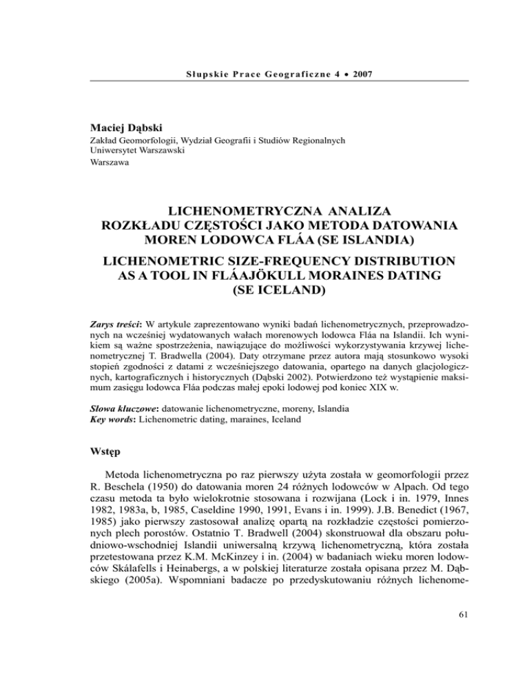 S ł u p s ki e P r a c e G e o g r a f i c z ne 4 • 2007 Maciej Dąbski Zakład Geomorfologii, Wydział Geografii i Studiów Regionalnych Uniwersytet Warszawski Warszawa LICHENOMETRYCZNA ANALIZA ROZKŁADU CZĘSTOŚCI JAKO METODA DATOWANIA MOREN LODOWCA FLÁA (SE ISLANDIA) LICHENOMETRIC SIZE-FREQUENCY DISTRIBUTION AS A TOOL IN FLÁAJÖKULL MORAINES DATING (SE ICELAND) Zarys treści: W artykule zaprezentowano wyniki badań lichenometrycznych, przeprowadzonych na wcześniej wydatowanych wałach morenowych lodowca Fláa na Islandii. Ich wynikiem są waŜne spostrzeŜenia, nawiązujące do moŜliwości wykorzystywania krzywej lichenometrycznej T. Bradwella (2004). Daty otrzymane przez autora mają stosunkowo wysoki stopień zgodności z datami z wcześniejszego datowania, opartego na danych glacjologicznych, kartograficznych i historycznych (Dąbski 2002). Potwierdzono teŜ wystąpienie maksimum zasięgu lodowca Fláa podczas małej epoki lodowej pod koniec XIX w. Słowa kluczowe: datowanie lichenometryczne, moreny, Islandia Key words: Lichenometric dating, maraines, Iceland Wstęp Metoda lichenometryczna po raz pierwszy uŜyta została w geomorfologii przez R. Beschela (1950) do datowania moren 24 róŜnych lodowców w Alpach. Od tego czasu metoda ta było wielokrotnie stosowana i rozwijana (Lock i in. 1979, Innes 1982, 1983a, b, 1985, Caseldine 1990, 1991, Evans i in. 1999). J.B. Benedict (1967, 1985) jako pierwszy zastosował analizę opartą na rozkładzie częstości pomierzonych plech porostów. Ostatnio T. Bradwell (2004) skonstruował dla obszaru południowo-wschodniej Islandii uniwersalną krzywą lichenometryczną, która została przetestowana przez K.M. McKinzey i in. (2004) w badaniach wieku moren lodowców Skálafells i Heinabergs, a w polskiej literaturze została opisana przez M. Dąbskiego (2005a). Wspomniani badacze po przedyskutowaniu róŜnych lichenome- 61 trycznych metod stosowanych wcześniej doszli do wniosku, Ŝe najlepsze wyniki osiąga się, stosując zarówno metodę wykorzystującą analizę największych plech porostów (metoda tradycyjna), jak i metodę opartą na analizie gradientu rozkładu częstości pomierzonej populacji porostów. W Polsce lichenometrię stosuje się do datowania tatrzańskich piargów i spływów gruzowych (Kotarba 1988, 2001, 2004) oraz beskidzkich osuwisk (Bajgier 1992; Bajgier-Kowalska 2002, 2003). Niewiele miejsca poświęca się jednak na dyskusję nad samą metodą lichenometryczną. Na temat wieku moren lodowca Fláa (SE Islandia) wypowiadali się: K. Jaksch (1975), S. Snorrason (1984), M. Dąbski i in. (1998) oraz M. Dąbski (2002). W ostatniej z wymienionych prac zawarto wniosek, Ŝe lichenometryczne datowanie moŜe być Ryc. 1 PołoŜenie strefy marginalnej lodowca Fláa w SE Islandii. A – szkic geomorfologiczny na podstawie zdjęcia lotniczego z 1989 r. (Dąbski i in. 1998). B – przybliŜony zasięg zalewu powstałego wskutek otwarcia się nowej bramy lodowcowej na wiosnę 2001 r. Fig. 1. Location of the Fláajökull marginal zone in SE Iceland. A – geomorphological sketch based on an aerial photographs from 1989 (Dąbski et al. 1998), B – rough range of flooded area after opening of a new glacier gate in spring 2001 62 obarczone znacznym błędem wynikającym z niepewności co do tempa wzrostu porostów oraz z niestabilnych warunków środowiskowych. W pracy M. Dąbskiego (2002) znajduje się porównanie danych glacjologicznych, kartograficznych i historycznych z datami lichenometrycznymi otrzymanymi przez uśrednianie 5 największych plech porostu Rhizocarpon, zgodnie z metodą stosowaną przez D.J.A. Evansa i in. (1999), który w ten sposób datował moreny sąsiednich lodowców. Celem tej pracy jest przedstawienie i przedyskutowanie wyników nowego lichenometrycznego datowania moren lodowca Fláa z zastosowaniem analizy gradientu rozkładu częstości plech z rodzaju Rhizocarpon, pomierzonych latem 2005 r. Dodatkowo przedstawiono zróŜnicowanie populacji porostów w zaleŜności od ekspozycji powierzchni kamieni, na których występują plechy. Teren badań Lodowiec Fláa (Fláajökull) wypływa na południe z czaszy lodowej Vatna (Vatnajökull), a jego strefa marginalna wraz z morenami znajduje się na wysokości 50-80 m n.p.m. (ryc. 1). Wschodni lob tego lodowca usypał wyraźne wały czołowomorenowe, które od strony zachodniej sąsiadują z morenami lodowców Heinabergs (Heinabergsjökull) i Skalafells (Skalafellsjökull). Lodowce te w latach 1860-1870 tworzyły wraz z Fláajökull jedną wspólną stopę piedmontową (Evans i in. 1999). Rycina 1 (A i B) pokazuje sytuację przed otwarciem i po otwarciu się na wiosnę 2001 r. nowej bramy lodowcowej, która przyczyniła się do usypania grobli i zatopienia znacznej części strefy marginalnej lodowca. Metody badań Pomiary porostów z rodzaju Rhizocarpon odbyły się latem 2005 r. z zastosowaniem następujących reguł: 1) mierzono jedynie najdłuŜsze osie (średnice okręgów opisanych) izolowanych plech o względnie okrągłych kształtach; 2) pomiary dokonywane były z uŜyciem linijki z dokładnością do 1 mm; 3) pola, w których mierzono porosty, wyznaczono wzdłuŜ grzbietów 5 róŜnowiekowych wałów morenowych; kaŜde z pól miało powierzchnię 6000 m² (20 x 300 m); 4) mierzono tylko względnie największe napotkane plechy i równocześnie odnotowywano ekspozycję powierzchni kamienia, na której porost występował: powierzchnia dolodowcowa (N), odlodowcowa (S) lub górna (ryc. 2); 5) pomiarów dokonywano na wszystkich typach skał, głównie na bazaltach, dolerytach i diabazach. Na kaŜdym wale pomierzono od 497 do 942 plech porostów, a całkowita liczba pomiarów wyniosła 3877. Procedura przetwarzania danych była taka, jaką stosowali T. Bradwell (2004) oraz K.M. McKinzey i in. (2004). Plechy podzielono na klasy co 3 mm i wykreślono histogramy rozkładu częstości dla kaŜdej populacji. Następnie obliczono logarytm (u podstawy 10) z war