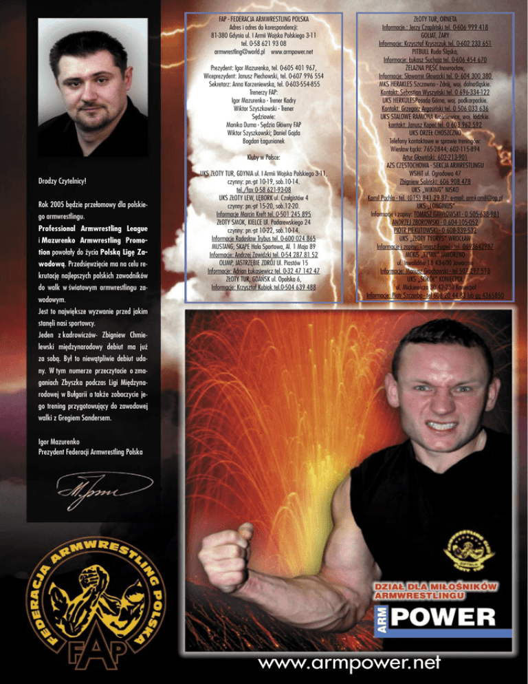 FAP - FEDERACJA ARMWRESTLING POLSKA Adres i adres do korespondencji: 81-380 Gdynia ul. I Armii Wojska Polskiego 3-11 tel. 0-58 621 93 08 [email protected] www.armpower.net Prezydent: Igor Mazurenko, tel. 0-605 401 967, Wiceprezydent: Janusz Piechowski, tel. 0-607 996 554 Sekretarz: Anna Korzeniewska, tel. 0-603-554-855 Trenerzy FAP: Igor Mazurenko - Trener Kadry Wiktor Szyszkowski - Trener Sędziowie: Monika Duma - Sędzia Główny FAP Wiktor Szyszkowski; Daniel Gajda Bogdan Łagunionek Kluby w Polsce: Drodzy Czytelnicy! Rok 2005 będzie przełomowy dla polskiego armwrestlingu. Professional Armwrestling League i Mazurenko Armwrestling Promotion powołały do życia Polską Ligę Zawodową. Przedsięwzięcie ma na celu rekrutację najlepszych polskich zawodników do walk w światowym armwrestlingu zawodowym. UKS ZŁOTY TUR, GDYNIA ul. I Armii Wojska Polskiego 3-11, czynny: pn.-pt 10-19, sob.10-14. tel./fax 0-58 621-93-08 UKS ZŁOTY LEW, LĘBORK ul. Czołgistów 4 czynny: pn.-pt 15-20, sob.12-20. Informacje Marcin Kreft tel. 0-501 245 895 ZŁOTY SMOK, KIELCE Ul. Padarewskiego 24 czynny: pn.-pt 10-22, sob.10-14. Informacje Radosław Trybus tel. 0-600 024 865 MUSTANG, SKĄPE Hala Sportowa, Al. 1 Maja 89 Informacje: Andrzej Zawidzki tel. 0-54 287 81 52 OLIMP, JASTRZĘBIE ZDRÓJ Ul. Piastów 15 Informacje: Adrian Łukasiewicz tel. 0-32 47 142 47 ZŁOTY TUR, GDAŃSK ul. Opolska 6, Informacje: Krzysztof Kubiak tel.0-504 639 488 ZŁOTY TUR, ORNETA Informacje.: Jerzy Czapliński tel. 0-606 999 418 GOLIAT, ŻARY Informacje: Krzysztof Kryszczuk tel. 0-602 233 651 PITBULL Ruda Śląska, Informacje: Łukasz Suchaja tel. 0-606 454 670 ŻELAZNA PIĘŚĆ Inowrocław, Informacje: Sławomir Głowacki tel. 0- 604 300 380 MKS HERAKLES Szczawno - Zdrój, woj. dolnośląskie. Kontakt: Sebastian Wyszyński tel. 0 696-334-122 UKS HERKULESPosada Górna, woj. podkarpackie. Kontakt: Grzegorz Argasiński tel. 0 506 033 636 UKS STALOWE RAMIONA Krośniewice, woj. łódzkie. kontakt: Janusz Kopeć tel. 0 603 962 592 UKS ORZEŁ CHOSZCZNO Telefony kontaktowe w sprawie treningów: Wiesław Łącki: 765-2844; 602-115-894 Artur Głowiński: 602-213-901 AZS CZĘSTOCHOWA - SEKCJA ARMRESTLINGU WSHiT ul. Ogrodowa 47 Zbigniew Soliński: 606 908 478 UKS „WIKING” NISKO Kamil Pachla - tel. (015) 841 29 87; e-mail: [email protected] UKS „LONGINUS” Informacje i zapisy: TOMASZ GAWŁOWSKI - 0 505-638-981 ANDRZEJ ZBOROWSKI - 0 604-105-052 PIOTR PIEKUTOWSKI - 0 608-339-532 UKS „ZŁOTY TYGRYS” WROCŁAW Informacje i zapisy: Tomasz Fugiel - tel. 0693642987 MCKiS „TYTAN” JAWORZNO ul. Inwalidów 18 43-600 Jaworzno Informacje: Mariusz Grochowski - tel 507 297 513 UKS „SOKÓŁ” KONIECPOL ul. Mickiewicza 30 42-230 Koniecpol Informacje: Piotr Szczerba - tel 608 20 44 83 lub gg 4365850 Jest to największe wyzwanie przed jakim stanęli nasi sportowcy. Jeden z kadrowiczów- Zbigniew Chmielewski międzynarodowy debiut ma już za sobą. Był to niewątpliwie debiut udany. W tym numerze przeczytacie o zmaganiach Zbyszka podczas Ligi Międzynarodowej w Bułgarii a także zobaczycie jego trening przygotowujący do zawodowej walki z Gregiem Sandersem. Igor Mazurenko Prezydent Federacji Armwrestling Polska www.armpower.net Długo oczekiwany „V Puchar Polski – Galaktyka Cup” niespodziewanie okazał się sukcesem sportowym. Tegoroczna edycja zaskoczyła zarówno organizatorów, jak i samych zawodników. Poziom wszystkich sportowców był naprawdę wysoki. Od razu widać było, że wszyscy bardzo dobrze przygotowali się do bezpośrednich zmagań przy profesjonalnym stole armwrestlerskim. Nic w tym dziwnego, gdyż Puchar Polski w Siłowaniu na Ręce to druga co do wielkości (obok Mistrzostw Polski) impreza armwrestlingowa w Polsce. Ponad 140 armwrestlerów z terenu całego kraju 11 grudnia br. przyjechało do Klubu Muzycznego Galaktyka w Luzinie, by walczyć na prawą i lewą rękę w 23 kategoriach wagowych. Cały turniej zakończył się najbardziej widowiskową kategorią OPEN kobiet i mężczyzn. Niepokonanymi i najlepszymi w tej kategorii wagowej okazali się wychowankowie Klubu Sportowego Złoty Tur Gdynia: Walentyna Zaklicka oraz Zbigniew Chmielewski. To Ci zawodnicy wywalczyli sobie tytuł: najsilniejszego siłacza na rękę i tym samym zostaną wpisani do „Polskiej Księgi Rekordów i Osobliwości” roku 2004. Walentyna Zaklicka – to młoda, bardzo utalentowana zawodniczka. Pomimo, że ma dopiero 17 lat, to w swoim dorobku ma już niejeden tytuł mistrzowski, w tym zdobyty na arenie międzynarodowej. Podczas V Pucharu Polski, zarówno w kategorii juniorskiej, jak i seniorskiej nie miała sobie równych. Po zaciętych pojedynkach, czasami do granic wytrzymałości, wywalczyła sobie tytuł najlepszej armwrestlerki roku 2004. Tym właśnie sposobem Walentyna pokazała, że drzwi do dalszej kariery sportowej w siłowaniu na ręce stoją przed nią otworem. Magdalena Wensierska (n.z Kieszkowo) vs Katarzyna Banach ( UKS 16 Koszalin) Wiktor Zaklicki (Złoty Tur Gdynia) Zdobył złoto i srebro w kategorii juniorów. Konrad Gaca (nz Bydgoszcz) zajął pierwsze miejsce w kategorii do 95 kg na lewą rękę. Juniorki do 60kg, lewa ręka. I miejsce- Walentyna Zaklicka (Złoty Tur Gdynia), II miejsce- Seniorki open, prawa ręka. Mariusz Grochowski (MCKS Jaworzno) zajął trzecie miejsce w kategorii open. Małgorzata Ostrowska ( SK Ostry), III miejsce- Magdalena Gutteter (Złoty Tur Gdynia) I miejsce- Walentyna Zaklicka (Złoty Tur Gdynia),II miejsce- Anna Kijewska ( Złoty Lew Lębork), III miejsce- Magdalena Wensierska (n.z Kieszkowo) Zbigniew Chmielewski – to doświadczony zawodnik, na co dzień również walczący w zawodowym armwrestlingu. Choć jego waga startowa to 78kg, to podobnie jak jego młodsza koleżanka po fachu, w swojej kategorii wagowej, zarówno na lewą jak i na prawą rękę nie miał sobie równych. Pojedynki z innymi sportowcami nie sprawiały mu żadnego problemu. Tak Najlepszym zawodnikiem z klubu Złoty D