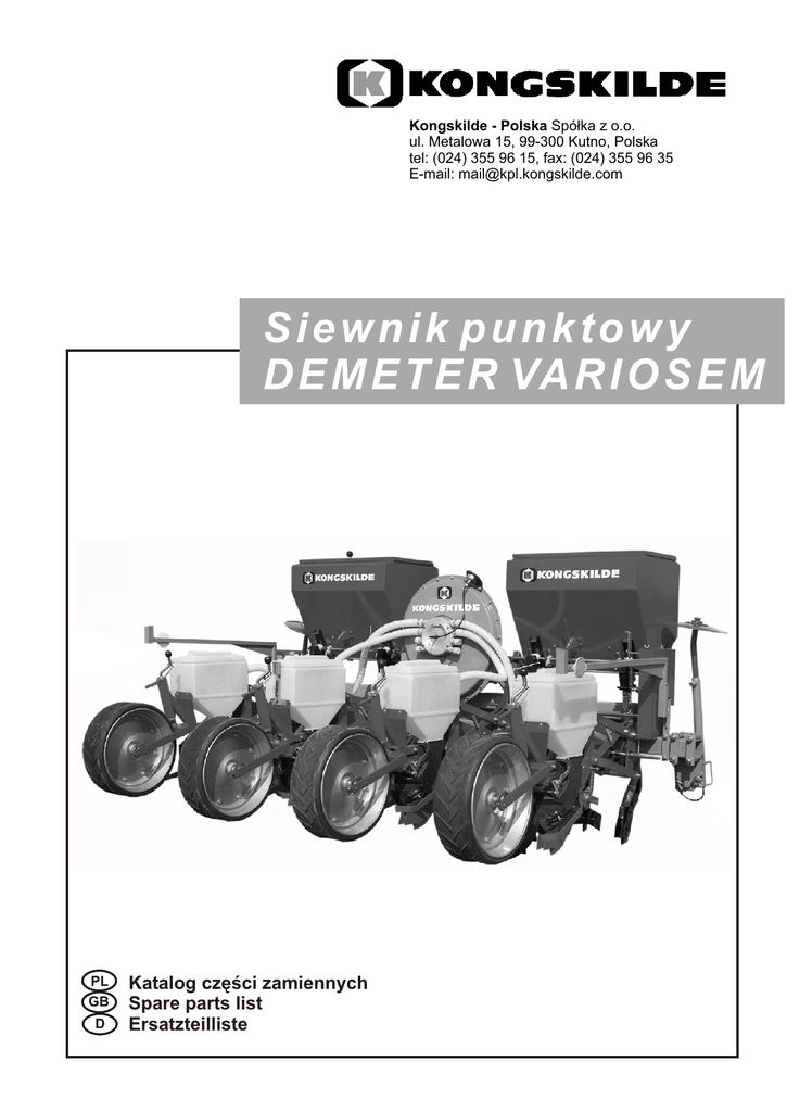 Kongskilde - Polska Spó³ka z o.o. ul. Metalowa 15, 99-300 Kutno, Polska tel: (024) 355 96 15, fax: (024) 355 96 35 E-mail: [email protected] Siewnik punktowy D E M E T E R VA R I O S E M PL GB D Katalog czêœci zamiennych Spare parts list Ersatzteilliste Tab. 1 2 Spare parts list / VARIOSEM Date: 2007.01 Fig. Serial no. Part no. Pieces Tab. 1 Notes 1 2 3 4 5 300 316 036 300 332 038 300 304 188 300 071 689 300 304 141 Nakrêtka motylk Podk³adka zw Œruba pods WskaŸnik Œruba d gw butterfly nut washer screw indicator hex bolt Flügelmutter U-Scheibe Flachrundschraube Zeiger Sechskantschr. M5 6,5/13 x 1 M 6x25 6 7 8 9 10 300 316 026 300 304 133 300 071 585 300 062 211 300 323 034 Nakrêtka sam Œruba k gw Klapka Sprê¿yna skrêtna Ko³ek spr lock nut hex bolt flap torsion spring tension pin Sicherungsmutter Sechskantschraube Klappe Drehfeder Spannhülse 11 12 13 14 15 300 316 026 300 071 584 300 071 587 300 407 004 300 736 822 Nakrêtka sam Korpus plastikowy Okienko inspekcyjne Pierœcieñ, os spr Zgarniacz look nut inlet inspection window lock washer scraper Sechskantmutter Einlaufteil Sichtfenster Sicherungsring Abstreifer 16 17 18 19 20 300 736 823 300 072 456 100 311 000 300 308 007 300 044 094 Zgarniacz Palec zgarniaj¹cy Œruba pods Wkrêt, do bl Szczotka wlotu scraper pivot pin screw delf taping screw brush Abstreifer Gewindebolzen Flachrundschraube LinsenSlechschr. Bürste 21 22 23 25 26 300 072 271 300 736 436 300 071 676 300 334 025 300 071 675 Blacha Œcianka dzia³owa Zbiornik Nit zryw Pokrywa sheet metal partition hopper blank rivet lid Blech Trennwand Behälter Blindniet Deckel 27 28 29 30 31 300 071 669 300 011 368 300 071 705 300 332 020 300 736 377 Blacha Sprê¿yna pokrywy K¹townik Podk³adka spr Rama sheet metal Tension spring angle Spring washer frame Biech Zugfeder Winkel Scheibe Rahmen 32 33 34 35 36 300 304 040 300 316 020 300 071 621 300 332 002 300 736 378 Œruba k gw M10x65 Nakrêtka sam Wk³adka dystansowa Podk³adka Ciêgno górne hex bolt lock nut spacer washer upper link Sechskantschr. Sicherungsmutter Distanzstùck U-Scheibe Oberlenker M 10x65 M 10 20/10x9,5 11/34x3 37 38 39 40 41 300 304 034 300 304 035 300 061 704 300 071 622 300 071 619 Œruba d gw Œruba d gw Tulejka dystansowa Szpilka Tulejka hex bolt hex bolt spacer bolt washer Sechskantschraube Sechskartschraube Distanzbuchse schraube Stufenscheibe M 10x30 M 10x35 16x2,5x9,5 M 10x230 42 43 44 45 46 300 736 372 300 304 090 300 044 497 300 316 023 300 304 153 Zacisk Œruba k gw P³askownik Nakrêtka sam Œruba d gw M8x20 Clamp hex bolt flat bar hex nut hex bolt Klemme Sechskantschraube Flachstahl Sechskantm. Sechskantschraube 47 48 49 50 51 300 071 666 300 070 977 300 045 747 300 091 985 300 736 373 Tarczka stopniowa Sprê¿yna Chwyt docisku Sprê¿yna Zapadka washer tension spring handle tension spring Arm Stufenscheibe Zugfeder Griff Zugfeder Sperre 52 53 54 56 57 300 736 379 300 304 036 300 071 620 300 071 684 300 071 665 Ciêgno dolne Œruba Tulejka dystansowa Pierœcieñ dystansowy Rolka napinacza lower link hex bolt spacer Spacer excentric washer Unterlenker Sechskantschraube Distanzstück Distanzstück Exzenterscheibe 58 59 59 60 61 300 332 027 300 736 500 300 736 522 300 071 674 300 323 025 Podk³adka zw Tarcza wys. - kukurydza Tarcza wys. - burak Wa³ek Ko³ek spr. Washer seed disk Seed disk axle tension pin U-Scheibe Säscheibe Säscheibe Welle Spannhülse 5x30 62 63 64 65 66 300 071 580 300 071 682 300 401 009 100 407 011 300 304 155 Pierœcieñ œlizgowy Korpus ¿eliwny obrabiany £o¿ysko, kulk poprz Pierœcieñ Œruba d gw Ring housing Bearing lock washer Hex bolt Gleitring Gehäuse Rillenkugellager Sicherungsring Sechskantschr. 6004 2RS A 20X1,2 M 8X25 67 68 69 70 300 071 995 300 071 706 300 736 442 300 304 036 Nak³adka P³askownik Os³ona kpl. Œruba k gw M10x40 lock flat bar guard screw Riegel Flachstahl Schutzblech Flachrundschr. M 10x40 M 6x30 M6 M 5x70 8x30 M6 A 10 x 1 Z3 Z4 M 6x16 B 3,5x13 4.8x16 Z 6,1 M 16x160 M 16 M 8x20 M 10x40 20/10x21 20/11x22,5 60 10,5/30x1,5 30x5,0 25x2,0 3 Tab. 1 4 Spare parts list / VARIOSEM Date: 2007.01 Fig. Serial no. Part no. Pieces Tab. 1 Notes 71 72 73 74 76 300 071 664 300 407 004 300 083 347 300 401 010 300 071 573/1 Rolka napinacza 40 Pierœcieñ, os spr Podk³adka 10/16x0.5 £o¿ysko, kulk poprz Ko³o zêbate excentric washer Shim washer bearing sprocket Exzenterscheibe Passcheibe U-Scheibe Rillenkugellager Kettenrad 40 10/16x0,3 8,4/17X1,6 6005 2RS 1/2x5/16 Z18 77 78 79 80 81 300 071 996 300 420 009 300 083 024 300 411 018 300 071 574/1 Przewê¿ka Opaska £añcuch Ogniwo proste 08B Ko³o zêbate reducer-piece hose clamp chain spring lock sprocket Reduzierstück Schlauchklemme Rollenkette FederverschluBgl. Kettenrad 32-50 mm 1/2x5/16 86links 1/2x5/16 1/2x5/16 Z 18 82 83 84 85 86 300 000 112 300 072 100 300 000 113 300 323 045 300 071 672 Tulejka Ko³ek bezpiecznikow. Podkladka Przetyczka z pier. zab. Os³ona bush share bolt washer flap bolt guard Buchse Abscherstifte Scheibe Klappstecker Schutzblech 87 88 88 89 90 300 316 027 300 736 652 300 736 653 300 736 404 300 071 670 Nakrêtka sam Os³ona - kukurydza Os³ona - burak Ko³o ³añcuchowe Os³ona lock nut guard guard sprocket guard Sicherungsmutter Schutzblech Schutzblech Kettenrad Schutzblech M8 maize sugar beet 1/2x5/16 Z 28 91 94 97 98 99 300 304 150 300 010 748 300 411 021 300 736 444 300 736 654 Œruba d gw Rolka napinacza Ogniwo wygiête 08B Wlot kpl. Chwyt ze sprê¿yn¹ hex.bolt roller cranked link inlet handle with spring Sechskantschr. Rolle GekröpftesKettengl. Einlauf Griff mit Feder M 8X12 100 101 102 103 104 300 401 008 300 421 007 300 316 021 300 000 114 300 736 435 £o¿ysko, kulk poprz Zaœlepka Nakrêtka sam Wa³ek Obudowa kpl. bearing closer lock nut pivot pin Housing cpl. Rillenkugellager blende Sicherungsmutter Bolzen Gehause cpl. 105 106 107 108 109 300 001 071 300 736 483 300 315 017 300 332 038 300 332 073 Os³ona gumowa Pokrywa kpl. Nakrêtka zw Podk³adka zw Podk