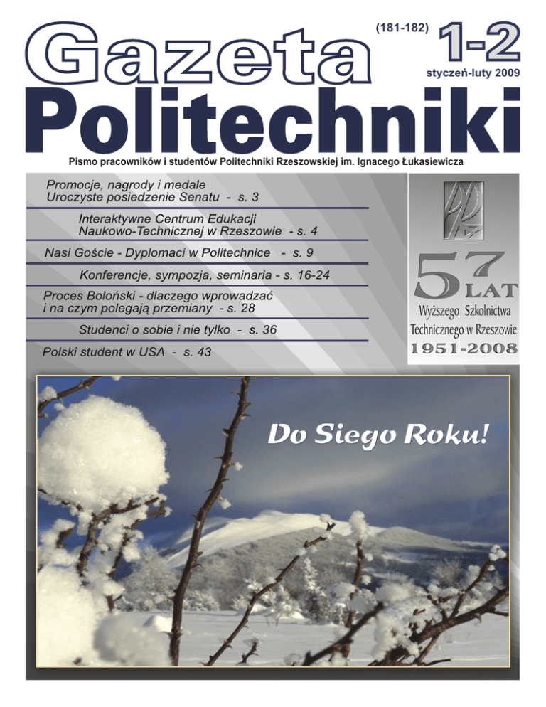 Gazeta (181-182) 1-2 styczeñ-luty 2009 Politechniki Pismo pracowników i studentów Politechniki Rzeszowskiej im. Ignacego £ukasiewicza 5 7 lat Wy¿szego Szkolnictwa Technicznego w Rzeszowie 1951-2008 Do Siego Roku! 2 GAZETA POLITECHNIKI Uroczyste posiedzenie Senatu PRz 18 grudnia 2008 r. Otwarcie posiedzenia Senatu przez JM Rektora A. Sobkowiaka. Promocja habilitacyjna dr. in¿. M. Sobolaka. Promocje doktorskie Mgr in¿. K. Kiedrzyñski M. Darecki wyró¿niony medalem “Zas³u¿onym dla Politechniki Rzeszowskiej”. Wœród nagrodzonych dr in¿. M. Heneczkowski i dr in¿. M. Oleksy z WCh. Mgr in¿. J. Szlachta Primus Inter Pares dla najlepszych absolwentów. Op³atek akademicki w sto³ówce... , Nr 1-2(181-182)–STYCZEN-LUTY 2009 3 PROMOCJE, NAGRODY I MEDALE Uroczyste posiedzenie Senatu PRz W œwi¹tecznym nastroju, 18 grudnia 2008 r. pod przewodnictwem JM Rektora prof. Andrzeja Sobkowiaka odby³o siê w Zespole Sal Wyk³adowych (S-1) uroczyste posiedzenie Senatu, poœwiêcone wrêczeniu nominacji profesorskich, promocji habilitacyjnej i doktorskiej, Nagród Rektora oraz wrêczeniu nagród i medali „Primus Inter Pares” dla najlepszych absolwentów PRz w 2008 r. Te ostatnie ufundowane zosta³y przez Fundacjê Rozwoju Politechniki Rzeszowskiej. W pierwszej kolejnoœci JM Rektor wrêczy³ nominacje na stanowisko profesora zwyczajnego w Politechnice Rzeszowskiej: prof. Jackowi Je¿owskiemu z Wydzia³u Chemicznego oraz prof. Dovowi Bronis³awowi Wajnrybowi z Wydzia³u Matematyki i Fizyki Stosowanej. Medalem „Zas³u¿onym dla Politechniki Rzeszowskiej” uhonorowany zosta³ prezes WSK „PZL-Rzeszów” Marek Darecki. Promocjê doktorsk¹ poprzedzi³o podjêcie uchwa³ Senatu. W roku akademickim 2007/2008 w Politechnice Rzeszowskiej nadano stopieñ naukowy doktora habilitowanego jednej osobie oraz stopnie naukowe doktora dwudziestu jeden osobom. Ponadto, w paŸdzierniku 2008 r. stopieñ doktora nauk technicznych nadano jednej osobie na WBMiL. Do uroczystej promocji habilitacyjnej przyst¹pi³ dr in¿. Mariusz Sobolak, któremu Rada Wydzia³u Budowy Maszyn i Lotnictwa Politechniki Rzeszowskiej, posiadaj¹ca uprawnienie do nadawania stopnia naukowego doktora habilitowanego nauk technicznych z zakresu dyscypliny „budowa i eksploatacja maszyn”, nada³a wymieniony stopieñ. Dr hab. in¿. Mariusz Sobolak urodzi³ siê w 1967 r. w Sanoku. Studia wy¿sze ukoñczy³ i doktorat uzyska³ na ww. wydziale. Jest nauczycielem akademickim zatrudnionym obecnie na stanowisku profesora nadzwyczajnego w Katedrze Konstrukcji Maszyn na WBMiL. Jego g³ówne zainteresowania naukowe to numeryczne metody odwzorowania geometrii narzêdzia skrawaj¹cego w materiale (zw³aszcza w obróbce kó³ zêbatych), metody szybkiego prototypowania i systemy CAD. Dr hab. in¿. Mariusz Sobolak otrzyma³ dyplom doktora habilitowanego z numerem 8 w PRz. Do uroczystej promocji doktorskiej przyst¹pili: u dr in¿. Gra¿yna Ryziñska i dr in¿. Bogumi³ Ho³ota, którym Rada Wydzia³u Budowy Maszyn i Lotnictwa PRz nada³a stopieñ doktora nauk technicznych z zakresu dyscypliny naukowej „mechanika” , u dr in¿. Rafa³ Kluz, dr in¿. Krzysztof Balawender, dr in¿. Magdalena Dobrzañska, dr in¿. Katarzyna Antosz, dr in¿. Lidia Ga³da, dr in¿. Bogus³aw Konefa³, dr in¿. Krzysztof Kiedrzyñski, dr in¿. Wojciech ¯y³ka, dr in¿. Ma³gorzata Zieliñska, dr in¿. S³awomir Œwirad, dr in¿. Marcin Kêdzior, którym Rada Wydzia³u Budowy Maszyn i Lotnictwa nada³a stopieñ doktora nauk technicznych z zakresu dyscypliny naukowej „budowa i eksploatacja maszyn”, u dr in¿. Lidia Buda-O¿óg, dr in¿. Andrzej Wojnar i dr in¿. Krzysztof Wilk, którym Rada Wydzia³u Budownictwa i In¿ynierii Œrodowiska nada³a stopieñ doktora nauk technicznych z zakresu dyscypliny „budownictwo”, u dr in¿. Piotr Skita³a, dr in¿. Jolanta Szlachta, dr in¿. Jaros³aw Noworól i dr Monika Karbarz, którym Rada Wydzia³u Chemicznego nada³a stopieñ doktora w dziedzinie nauk chemicznych z zakresu dyscypliny „technologia chemiczna” oraz dr in¿. Krzysztof Wa³czyk, któremu Rada Wydzia³u Chemicznego nada³a stopieñ doktora w dziedzinie nauk technicznych z zakresu dyscypliny „in¿ynieria chemiczna”, u dr in¿. Wojciech Szyde³ko, któremu Rada Wydzia³u Elektrotechniki i Informatyki nada³a stopieñ doktora nauk technicznych z zakresu dyscypliny „elektrotechnika”. Wzorem lat ubieg³ych, najlepsi absolwenci poszczególnych wydzia³ów PRz zostali laureatami nagród Fundacji Rozwoju Politechniki Rzeszowskiej i ustanowionego przez Fundacjê medalu „Primus Inter Pares”. Zgodnie z regulaminem, medal ten Kapitu³a Medalu nadaje za wybitne wyniki w nauce oraz za dzia³alnoœæ na innych p³aszczyznach ¿ycia akademickiego, m.in. w studenckim ruchu naukowym, w dzia³alnoœci organizacyjnej, sportowej, kulturalnej, maj¹cych istotny wp³yw na kreowanie wizerunku Politechniki Rzeszowskiej. 4 GAZETA POLITECHNIKI Tegorocznymi laureatami zostali: mgr in¿. Krzysztof Boryczko z Wydzia³u Budownictwa i In¿ynierii Œrodowiska, mgr in¿. Sewer Or³ow z Wy- dzia³u Budowy Maszyn i Lotnictwa, mgr in¿. Andrzej Bo¿ek z Wydzia³u Elektrotechniki i Informatyki, mgr in¿. Agnieszka Nowak-Król z Wydzia³u Chemicznego, mgr Barbara Sobkowiak z Wydzia³u Zarz¹dzania i Marketingu. Medale i nagrody wyró¿nionym absolwentom wrêczy³ przewodnicz¹cy Rady Fundacji Roman Krzystyniak oraz przewodnicz¹cy Zarz¹du Fundacji Tadeusz Gratkowski w towarzystwie JM Rektora. Niezale¿nie od powy¿szego, 164 nauczycielom akademickim wrêczono Nagrody Rektora – lista nagrodzonych zostanie opublikowana w nastêpnym numerze GP. Posiedzenie Senatu zbieg³o siê z okresem Œwi¹t Bo¿ego Narodzenia, tote¿ po oficjalnej czêœci uroczystoœci prof. A. Sobkowiak zaprosi³ wszystkich obecnych na spotkanie op³atkowe w sto³ówce akademickiej. Tu, przy wtórze kolêd w wykonaniu „Po³onin”, w mi³ym œwi¹tecznym nastroju wszyscy mogli po³amaæ siê op³atk