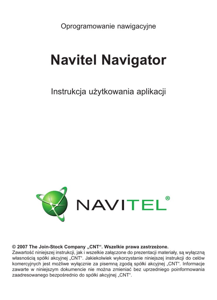 Oprogramowanie nawigacyjne Navitel Navigator Instrukcja użytkowania aplikacji © 2007 The Join-Stock Company „CNT“. Wszelkie prawa zastrzeżone. Zawartość niniejszej instrukcji, jak i wszelkie załączone do prezentacji materiały, są wyłączną własnością spółki akcyjnej „CNT“. Jakiekolwiek wykorzystanie niniejszej instrukcji do celów komercyjnych jest możliwe wyłącznie za pisemną zgodą spółki akcyjnej „CNT“. Informacje zawarte w niniejszym dokumencie nie można zmieniać bez uprzedniego poinformowania zaadresowanego bezpośrednio do spółki akcyjnej „CNT“. Zawartość 1. Wprowadzenie................................................................................................................................5 2. Informacje ogólnego charakteru..................................................................................................5 3. Interfejs...........................................................................................................................................8 3.1. Interfejs programu w trasie....................................................................................................8 3.2. Interfejs programu podczas przeglądania mapy ...................................................................10 4. Strony .............................................................................................................................................12 4.1. Strona Mapa ..........................................................................................................................12 4.1.1. Ruch na mapie............................................................................................................12 4.1.2. Zoomowanie................................................................................................................12 4.1.3. Kursor GPS .................................................................................................................12 4.1.4. Kompas .......................................................................................................................13 4.1.4.1. Obracanie mapy ...............................................................................................13 4.1.4.2. Tryb pracy wyświetlacza dzienny/nocny...........................................................13 4.1.5. Panele informacyjne....................................................................................................14 4.2. Strona Deska rozdzielcza......................................................................................................14 4.3. Strona Satelity .......................................................................................................................16 4.4. Strona Pogoda.......................................................................................................................17 5. Menu główne ..................................................................................................................................18 5.1. Odszukaj................................................................................................................................18 5.2. Trasa......................................................................................................................................18 5.2.1. STOP ..........................................................................................................................18 5.2.2. Korekcja trasy .............................................................................................................18 5.2.3. Plan trasy ....................................................................................................................18 5.2.4. Pokaż trasę .................................................................................................................19 5.2.5. Objazd.........................................................................................................................19 5.2.6. Symulacja trasy...........................................................................................................19 5.2.7. Eksport ........................................................................................................................19 5.2.8. Import ..........................................................................................................................19 5.3. Mój Navitel.............................................................................................................................20 5.3.1. Wszystkie produkty .....................................................................................................20 5.3.2. Moje produkty..............................................................................................................21 5.3.3. Aktualizuj .....................................................................................................................21 5.3.4. Podpowiedź.................................................................................................................21 5.4. Ustawienia .............................................................................................................................22 5.4.1. Mapa ...........................................................................................................................22 5.4.1.1. Górna część mapy............................................................................................22 5.4.1.2. Automatyczne zoomowanie ..............................................................................22 5.4.1.3. Efekty wizualne.................................................................................................22 5.4.1.4. Nachylenie mapy ..............................................................................................22 5.4.1.5. Zresetowanie pozycji .......................................................................................