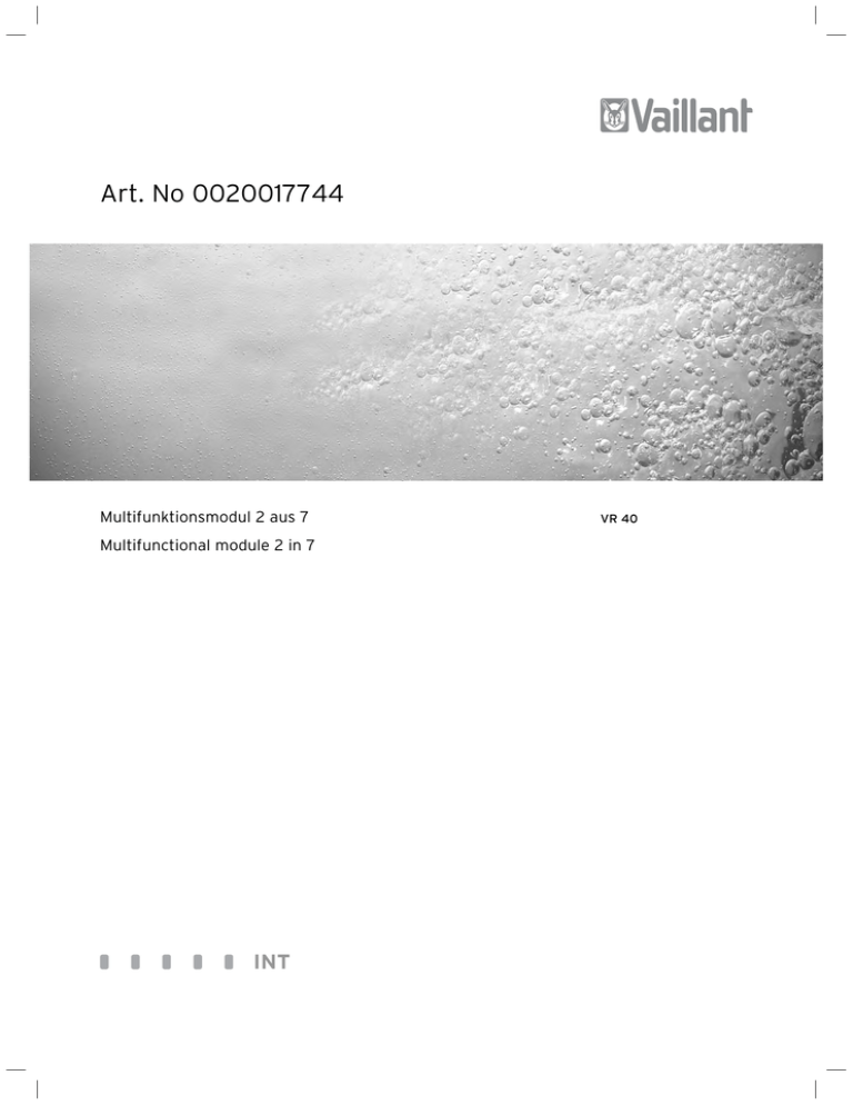 Art. No 0020017744 Multifunktionsmodul 2 aus 7 Multifunctional module 2 in 7 INT VR 40 B N 1 2 N L N L 2 D C 1 X4 E X40a A X40b X12 ecoLEVEL 306287 0020030797 A rel. 2 (d.28) 1 2 N L N 2 L 2 X40 1 X4 X40A N rel. 1 (d.27) 1 X40B X12 rel 1 rel 1 N L 2 2 1 N L 2 1 Art. No 0020017744 1 i F P X40A 2 1 rel. 2 (d.28) X12 1 2 N L N L 2 1 X4 X40A N rel. 1 (d.27) 4 X40B X12 3 X12 3 C X22 A X90 3 4 5 N L rel 1 X12 L N N 1 2 - + 7 8 9 rel 2 X40 N L 2 1 rel 1 D X40 Art. No 0020017744 3 4 C X22 A X40 X90 L N 3 4 5 N 1 2 rel 2 X12 - + 7 8 9 N L rel 1 N L 2 1 rel 1 D 5 3 4 5 N L 2 rel 1 mm 30 N L rel 1 m N 1 2 rel 2 1 6-7 7m L N X12 + 7 8 9 6 i F P 7 4 Art. No 0020017744 8 ... 6-7 6-7 Art. No 0020017744 5 ZP rel.1 (d.27) rel.2 (d.28) rel 1 rel 1 N L N L 2 rel 2 N 1 2 rel 1 rel 1 N L N L 2 rel 2 N 1 2 rel 1 rel 1 N L N L 2 rel 2 N 1 2 DE Zirkulationspumpe (Werkseinstellung Relais 1) ext. Heizungs-Pumpe (Werkseinstellung Relais 2) Speicherladepumpe IT pompa di ricircolo (impostazione di fabbrica relè 1) pompa esterna riscaldamento (impostazione di fabbrica relè 2) pompa di carico del bollitore acqua calda sanitaria FR pompe circulation (réglage usine relais 1) pompe ext. (réglage usine relais 2) pompe d‘accumulation NL circulatiepomp (fabrieksinstelling relais 1) externe cv-pomp (fabrieksinstelling relais 2) boilerlaadpomp GB Circulation pump (default relay 1) Ext. Pump (default relay 2) Storage charging pump ES Bomba de recirculación (ajuste de fábrica relé 1) Bomba externa de calefacción (ajuste de fábrica relé 2) Bomba de sobrealimentación PT bomba de circulação (regulação de fábrica relé 1) bomba de aquecimento externa (regulação de fábrica relé 2) bomba acumuladora DK Cirkulationspumpe (fabriksindstilling relæ 1) Ekst. varmeanlægspumpe (fabriksindstilling relæ 2) Beholderpumpe TR Sirkülasyon pompası (Fabrika ayarı Röle 1) Harici ısıtma pompası (Fabrika ayarı Röle 2) Boyler ısıtma pompası PL Pompa cyrkulacyjna (nastawa fabryczna - przekaźnik 1) Zewn. pompa obiegu grzewczego (nastawa fabryczna - przekaźnik 2) Pompa ładowania zasobnika HU Cirkulációs szivattyú (gyári beállítás 1. relé) Kül.. fűtővíz-szivattyú (gyári beállítás 2. relé) Tárolótöltő szivattyú CZ Cirkulační čerpadlo (tovární nastavení relé 1) Externí čerpadlo topného okruhu (tovární nastavení relé 2) Čerpadlo k ohřevu zásobníku SK Obehové čerpadlo (výrobné nastavenie relé 1) Externé čerpadlo vykurovacieho okruhu (výrobné nastavenie relé 2) Nabíjacie čerpadlo zásobníka HR/ SOE Cirkulacijska crpka (tvornička namještenost relej 1) Vanjska crpka za grijanje (tvornička namještenost relej 2) Crpka za punjenje spremnika SCG Cirkulaciona pumpa (fabrički podešen relej 1) Spoljašnja Pumpa za grejanje (fabrički podešen relej 2) Pumpa za punjenje rezervoara SI Cirkulacijska črpalka (tovarniška nastavitev, rele 1) Zunanja ogrevalna-črpalka (tovarniška nastavitev, rele 2) Polnilna črpalka zbiralnika GUS Циркуляционный насос (заводская настройка реле 1) Внешний отопительный насос (заводская настройка реле 2) Насос нагрева водонагревателя RO Pompă de recirculare (reglaj din fabricaţie releul 1) Pompă externă de încălzire (reglaj din fabricaţie releul 2) Pompă de încărcarea a boilerului 6 Art. No 0020017744 / rel 1 rel.1 (d.27) rel.2 (d.28) rel 1 N L / LPG rel 1 N L 2 rel 2 N 1 2 N 1 2 rel 1 N L 2 rel 2 rel 2 N 1 2 rel 1 N L rel 1 N L N L 2 rel 2 rel 2 N 1 2 N 1 2 DE Abgasklappe/ Dunstabzughaube externes Gasventil externe Fehlermeldung/ Betriebsanzeige IT sportello fumi/ aspiratore domestico valvola intercettazione gas esterna Indicatore disfunzioni/ Indicatore d’esercizio FR clapet évacuation/ hotte aspirante vanne gaz externe message d‘erreur externe/ Affichage de l’état de fonctionnement NL verbrandingsgasklep/ wasemkap (afzuigkap) extern gasventiel externe storingsmelding/ inbedrijfmelding GB Flue gas flap/ extractor hood External gas valve External error message/ Operation indicator ES Panel de evacuación de gases/ campana de extracción de condensación Válvula de gas externa Aviso de error externo/ indicador de funcionamiento PT tampa dos gases de exaustão/ extractor de fumos válvula do gás externa mensagem de erro externa/ indicador de funcionamento DK Røggasklap/ emhætte Ekstern gasventil Ekstern fejlmelding/ driftskontrollampe TR Baca gazı kapağı/ Aspiratör Harici gaz vanası Harici arıza mesajı/ işletme göstergesi PL Przepustnica spalin/ wyciąg oparów Zewnętrzny zawór gazu Zewnętrzny komunikat awaryjny/ dioda kontrolna HU Füstgázcsappantyú/ páraelszívó-burkolat Külső gázszelep Külső hibaüzenet/ üzemkijelző CZ Spalinová klapka/ kryt odvodu par Externí plynový ventil Externí chybové hlášení/ indikátor provozu SK Spalinová klapka/ kryt odsávača pár Externý plynový ventil Externé chybové hlásenie/ indikátor prevádzky HR/ SOE Zaklopka za ispušni plin/ poklopac za odvod plinova Vanjski plinski ventil Vanjska dojava greške/ pokazivač načina rada SCG Klapna dimnih gasova/ poklopac za odvod gasova Spoljašnji gasni ventil Spoljašnja prijava greške/ pokazivač načina rada SI Loputa izpušnih plinov/ auba za odvajanje pare Zunanji plinski ventil Zunanje javljanje napake/ indikator obratovanja GUS Заслонка газохода/ Вытяжной колпак Внешний газовый клапан Внешний индикатор сообщения об ошибке/рабочий индикатор RO Clapetă pentru gaze arse/ hotă Ventil extern de gaz Mesaj extern de eroare/ indicator funcţional Art. No 0020017744 7 0020008433_02 INT 07 2006