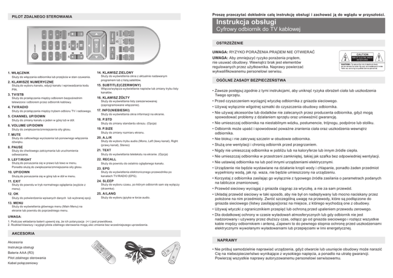 Proszę przeczytać dokładnie całą instrukcję obsługi i zachować ją do wglądu w przyszłości. PILOT ZDALNEGO STEROWANIA Instrukcja obsługi Cyfrowy odbiornik do TV kablowej OSTRZEŻENIE UWAGA: RYZYKO PORAŻENIA PRĄDEM NIE OTWIERAĆ 1. WŁĄCZNIK Służy do włączania odbiornika lub przejścia w stan czuwania. 2. KLAWISZE NUMERYCZNE Służą do wyboru kanału, edycji kanału i wprowadzania kodu PIN. 3. TV/STB Służy do przełączania między odbiorem bezpośrednim telewizora i odbiorem przez odbiornik kablowy. 4. TV/RADIO Służy do przełączania między trybem odbioru TV i radiowego. 5. CHANNEL UP/DOWN Służy do zmiany kanału o jeden w górę lub w dół. 6. VOLUME UP/DOWN Służy do zwiększenia/zmniejszenia siły głosu. 7. MUTE Służy do całkowitego wyciszenia lub ponownego włączenia dźwięku. 8. PAUSE Służy do chwilowego zatrzymania lub uruchomienia odtwarzania. 9. LEFT/RIGHT Służą do poruszania się w prawo lub lewo w menu. Ponadto służą do zwiększania/zmniejszania siły głosu. 14. KLAWISZ ZIELONY Służy do wyświetlenia okna z aktualnie nadawanym programem lub z listą satelitów. 15. SUBTITLE(CZERWONY) Włącza/wyłącza wyświetlanie napisów lub zmiany trybu listy kanałów. 16. KLAWISZ ŻÓŁTY Służy do wyświetlania listy zarezerwowanej (zaprogramowane włączenie). 17. INFO(NIEBIESKI) Służy do wyświetlania okna informacji na ekranie. 18. P.STD Służy do zmiany standardu obrazu. (Opcja) 19. P.SIZE Służy do zmiany rozmiaru ekranu. 20. A.L/R Służy do wyboru trybu audio.(Mono, Left (lewy kanał), Right (prawy kanał), Stereo) 21. TEXT Służy do wyświetlania teletekstu na ekranie. (Opcja) 22. RECALL Służy do powrotu do ostatnio oglądanego kanału. UWAGA: Aby zmniejszyć ryzyko porażenia prądem, nie usuwać obudowy. Wewnątrz brak jest elementów regulowanych przez użytkownika. Naprawy powierzać wykwalifikowanemu personelowi serwisu. OGÓLNE ZASADY BEZPIECZEŃSTWA • Zawsze postępuj zgodnie z tymi instrukcjami, aby uniknąć ryzyka obrażeń ciała lub uszkodzenia Twego sprzętu. • Przed czyszczeniem wyciągnij wtyczkę odbiornika z gniazda sieciowego. • Używaj wyłącznie wilgotnej szmatki do czyszczenia obudowy odbiornika. • Nie używaj akcesoriów lub dodatków nie zalecanych przez producenta odbiornika, gdyż mogą spowodować problemy z działaniem sprzętu oraz unieważnić gwarancję. • Nie umieszczaj odbiornika na niestabilnym wózku, postumencie, trójnogu, podpórce lub stoliku. • Odbiornik może upaść i spowodować poważne zranienia ciała oraz uszkodzenia wewnątrz odbiornika. • Nie blokuj i nie zakrywaj szczelin w obudowie odbiornika. • Służą one wentylacji i chronią odbiornik przed przegrzaniem. • Nigdy nie umieszczaj odbiornika w pobliżu lub na kaloryferze lub innym źródle ciepła. • Nie umieszczaj odbiornika w przestrzeni zamkniętej, takiej jak szafka bez odpowiedniej wentylacji. • Nie ustawiaj odbiornika na lub pod innymi urządzeniami elektrycznymi. 23. EPG • Urządzenie nie będzie wystawiane na działanie kropli wody i chlapanie, ponadto żaden przedmiot wypełniony wodą, jak np. waza, nie będzie umieszczony na urządzeniu. 11. EXIT 24. SLEEP • Korzystaj z odbiornika zasilając go wyłącznie z typowego źródła zasilania o parametrach podanych na tabliczce znamionowej. 12. OK 25. A/LANG 10. UP/DOWN Służą do poruszania się w górę lub w dół w menu. Służy do powrotu w tryb normalnego oglądania (wyjście z menu). Służy do potwierdzenia wpisanych danych lub wybranej opcji. Służy do wyświetlenia elektronicznego przewodnika po kanałach TV/RADIO (EPG). Służy do wyboru czasu, po którym odbiornik sam się wyłączy (drzemka). Służy do wyboru języka w torze audio. 13. MENU Służy do wyświetlenia głównego menu (Main Menu) na ekranie lub powrotu do poprzedniego menu. UWAGA: 1. Podczas wkładania baterii upewnij się, że ich polaryzacja (+/-) jest prawidłowa. 2. Rozkład klawiszy i wygląd pilota zdalnego sterowania mogą ulec zmianie bez wcześniejszego uprzedzenia. • Przewód sieciowy wyciągaj z gniazda ciągnąc za wtyczkę, a nie za sam przewód. • Układaj przewód sieciowy w taki sposób, aby nie był on nadeptywany lub mocno naciskany przez położone na nim przedmioty. Zwróć szczególną uwagę na przewody, które są podłączone do gniazda sieciowego (listwy zasilającej)oraz na miejsce, z którego wychodzą one z obudowy. • Używaj wtyczki z ogranicznikiem przepięć lub ochroną przed upaleniem przewodu zerowego. • Dla dodatkowej ochrony w czasie wyładowań atmosferycznych lub gdy odbiornik nie jest nadzorowany i używany przez dłuższy czas, odłącz go od gniazda sieciowego i rozłącz wszystkie kable między odbiornikiem i anteną. Zapewni to do pewnego stopnia ochronę przed uszkodzeniami elektrycznymi wywołanymi wyładowaniami lub przepięciami w linii energetycznej. AKCESORIA Akcesoria Instrukcja obsługi Baterie AAA (R3) Pilot zdalnego sterowania Kabel połączeniowy NAPRAWY • Nie próbuj samodzielnie naprawiać urządzenia, gdyż otwarcie lub usunięcie obudowy może narazić Cię na niebezpieczeństwo wynikające z wysokiego napięcia, a ponadto na utratę gwarancji. Powierzaj wszystkie naprawy autoryzowanemu personelowi serwisowemu. POŁĄCZENIA PŁYTA CZOŁOWA 1. Aby podłączyć sygnał z TV kablowej 1 Podłącz kabel antenowy do gniazda ANTENNA. 2. Aby podłączyć antenę do TV naziemnej 2 3 4 Podłącz kabel od anteny do wejścia ANT IN. 3. Aby podłączyć odbiornik TV / magnetowid Podłącz kabel RCA, SCART lub S-VIDEO do odbiornika (magnetowid do gniazda VCR, a odbiornik TV do gniazda TV). 4. Aby podłączyć cyfrowy system dźwięku Podłącz kabel koncentryczny S/PDIF do wzmacniacza cyfrowego. 5. Kabel przejściowy 3 Podłącz kabel koncentryczny do gniazda Loop Through na odbiorniku i podłącz drugi odbiornik. 1. WŁĄCZNIK ZASILANIA UWAGA: Wygląd tylnej ścianki odbiornika może ulec zmianie bez wcześniej