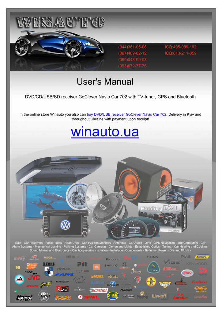 (044)361-05-06 ICQ:495-089-192 (067)469-02-12 ICQ:613-211-859 (099)048-99-03 (093)672-77-76 User's Manual DVD/CD/USB/SD receiver GoClever Navio Car 702 with TV-tuner, GPS and Bluetooth In the online store Winauto you also can buy DVD/USB receiver GoClever Navio Car 702. Delivery in Kyiv and throughout Ukraine with payment upon receipt! winauto.ua Sale - Car Receivers - Facia Plates - Head Units - Car TVs and Monitors - Antennas - Car Audio - DVR - GPS Navigation - Trip Computers - Car Alarm Systems - Mechanical Locking - Parking Systems - Car Cameras - Xenon and Lights - Established Optics - Tuning - Car Heating and Cooling Sound Marine and Electronics - Car Accessories - Isolation - Installation Components - Batteries, Power - Oils and Fluids - to .u a Интернет-магазин автозвука и автотоваров Винавто w in au GOCLEVER Navio CAR 702 USER’S MANUAL INSTRUKCJA OBSŁUGI www.goclever.com Интернет-магазин автозвука и автотоваров Винавто Declaration of Conformity Hereby GOCLEVER Technology declares that the product complies with the essential requirements and other provisions of Directive 199/5/WE. Environmental Protection The device is subject to the WEEE Directive 2002/96/EC. The symbol next to mean that the product must be disposed of separately and should be shipped to the appropriate collector. This allows you to limit pollution and the impact on human health. Also like to inform that our company has the obligations under the Act on waste electronic equipment, including in his collection, treatment, recovery and recycling is supported by KARAT ELECTRO-RECYCLING Ltd. If you have any questions or concerns you can contact Karat call 056-623-80-91. Responsibility GOCLEVER Technology Company nor any of its licensors shall not be liable for any loss of data or profits, as well as for any other consequential or indirect damages resulting from the use of equipment brand, in any case and the maximum permitted by law. GOCLEVER Technology is not responsible for any problems related to the malfunctioning of the operating system and applications operating under its control. Changes a GOCLEVER Technology reserves the right to revise this document and the specifications of the device, without notice to you. These features and images may vary depending on the services offered by the operator and software version of the device. to .u Before using Remember that the battery is not charged. Opening or attempt to disassemble the outer casing of the device will void the warranty. YouTube is a trademark of Google Inc.. in au Google is a registered trademark, and Google Maps is a trademark of Google Inc.. in the United States and other countries. GOCLEVER Technology Company is not liable for technical or editorial errors or for omissions contained herein is not responsible for incidental or consequential damages resulting from furnishing this material. Information is presented in such a state in which you adopt them, and are not covered by any warranty. Subject to change without notice. GOCLEVER Technology Company reserves the right to change the contents of this document without prior notice. The Security w manual describes basic functions of the device. Please refer to these guidelines. Failure to comply with them may cause danger to life or health or may be illegal. For further information, please read the entire manual. Unit was designed to operate from battery and mains supply with the charger. Using the device in a different way can be dangerous and will void the warranty. The impact of external factors and the electromagnetic field The device is not waterproof. Make sure that it was always dry, protect from moisture. The device also must be protected against high and low temperatures, dust, sand, do not expose it to shock, throw, as this may damage it or its components. Do not use the device in a damp and very high or low temperatures. Do not leave the device in the vehicle or in places where temperatures exceed 50 degrees Celsius. Do not use the equipment on board aircraft and in areas where it is not allowed to use equipment that may emit an electromagnetic field for example a hospital, petrol station, a warehouse of explosives violations of these rules may result in fire or explosion. Do not use the device while driving. Do not use the device near strong electromagnetic sources, such as microwave ovens, sound speakers, TV and radio. Use only original manufacturer-approved accessories, or accessories that do not contain metals. Service and Repair. For repair use the authorized service and qualified staff, any attempt to repair yourself, or by unauthorized service will void the warranty. 2 Интернет-магазин автозвука и автотоваров Винавто Please take your time to read this instruction manual carefully before operating your unit. Preface Thank you for purchasing our car navigation and multimedia systems products. You will enjoy the benefits provided by this unit. Some of the functions shown in this user manual are not available in all models. All the information in this manual is subject to change without prior notice. Safety Precautions and Warnings It is the user’s responsibility to use the car navigation and multimedia system with care. To a reduce the risk of unsafe operation, please read through all the instructions carefully and make sure you understand all instructions for the first time operation. Familiarity with installation and to .u operation procedures will assist you to obtain the best possible performance from the unit. The illustrations in this manual are for reference only. This unit is designed to operate on 12V - 15V D.C. negative ground electrical systems. in au Mounting and wiring this product require skills and experience. We recommend that you have this system professionally fitted. When using the Navigation system, please comply with the actual road cond