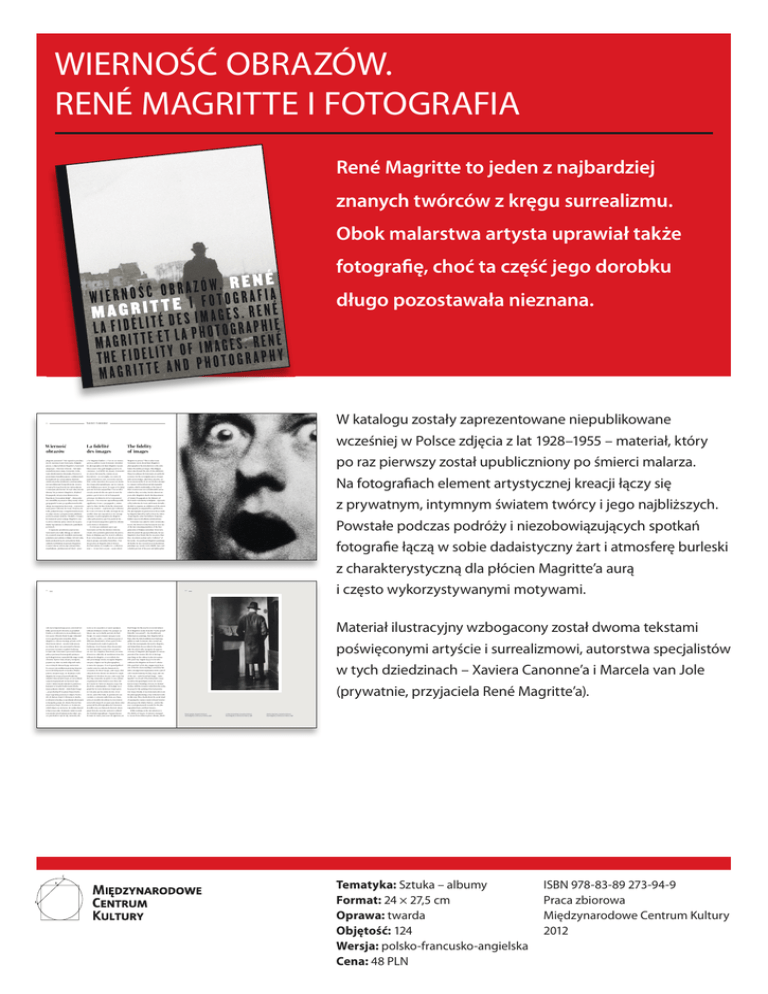 WIERNOŚĆ OBRAZÓW. RENÉ MAGRITTE I FOTOGRAFIA René Magritte to jeden z najbardziej znanych twórców z kręgu surrealizmu. Obok malarstwa artysta uprawiał także fotografię, choć ta część jego dorobku długo pozostawała nieznana. Xavier Canonne 10 11 Wierność obrazów La fidélité des images The fidelity of images „Magritte prywatnie”. Tak napisał w przedmo « Un Magritte familier ». C’est en ces termes “Magritte in private.” This is what Louis wie do wystawy Louis Scutenaire, belgijski pisarz, o zdjęciach René Magritte’a. Sam tytuł ekspozycji – Wierność obrazów – był także qu’en sa préface Louis Scutenaire introduit les photographies de René Magritte rassem blées sous le titre qu’il imagine pour la cir Scutenaire wrote about René Magritte’s photographs in his introduction to the exhi bition The fidelity of images. This Belgian wymyślony przez niego. Scutenaire trafia constance : La Fidélité des images. Scutenaire writer also devised the title of the exhibition. tymi określeniami w dziesiątkę. Przecież te ici encore fait mouche, comme en ses These two phrases by Scutenaire are perfectly prostokątne kawałki papieru o ząbkowanych Inscriptions : ces rectangles, ces carrés de accurate. For the rectangular pieces of paper krawędziach nie są bynajmniej dziełami papier dentelés ne sont en rien des œuvres with serrated edges, which they describe, are sztuki ani próbą rywalizacji z profesjonalny mi reprodukcjami fotograficznymi, zresztą w tamtych czasach wcale nie tak modnymi i cenionymi jak obecnie. W 1976 roku, niecałe d’art ou des tentatives de se poser en rivales des tirages photographiques, qui ne connais sent d’ailleurs pas encore la vogue et la valeur by no means works of art nor do they attempt to compete with professional photographic reprints, which, incidentally, at the time of qui sont les leurs aujourd’hui. C’est en effet their creation were not as fashionable and as dziesięć lat po śmierci Magritte’a, Wydział en 1976, moins de dix ans après la mort du valued as they are today. In 1976, almost ten Propagandy Artystycznej Ministerstwa peintre, que le Service de la Propagande years after Magritte’s death, the Department Wspólnoty Francuskiej Belgii1 – dzisiaj nikt artistique du Ministère de la Communauté nie ośmieliłby się używać takiej nazwy: słowo „propaganda” nawet po upadku muru berliń skiego ma negatywną konotację – reprezento française – l’on n’oserait aujourd’hui pareille appellation, le mot « propagande », même après la chute du Mur de Berlin, demeurant of Artistic Propaganda in the Ministry of the French Community in Belgium – represent ed by Catherine de Croës and Francis de Lulle – decided to organise an exhibition of the artist’s wany przez Catherine de Croës i Francisa de par trop connoté – représenté par Catherine photography accompanied by a publication. Lulle, podjął decyzję o zorganizowaniu wysta De Croës et Francis de Lulle, envisage de ras The photographs in question were those made wy zdjęć artysty i przygotowaniu publikacji sembler dans une exposition et un ouvrage by Magritte himself as well as those by others pod tym samym tytułem. Chodziło o fotogra éponyme ces photographies de Magritte – – depicting the artist but hitherto forgotten, fie wykonane przez samego Magritte’a oraz celles qu’il prend ou que l’on prend de lui – hidden away in old albums and shoeboxes. te, które zrobiono jemu, a które do tej pory et qui n’avaient jusqu’alors quitté les albums tkwiły zapomniane w albumach i pudełkach po butach. O napisanie przedmowy poproszono ou les boites à chaussures. Ce n’est pas seulement parce que Scutenaire was asked to write an introduc tion to the show not only because he was one of the last remaining members of the first Scutenaire est l’un des derniers témoins generation of Belgian surrealists: From 1927, Scutenaire’a nie tylko dlatego, że należał vivants de la première génération du surréa when he joined the group in Brussels, he was do ostatnich żyjących świadków pierwszego lisme en Belgique que l’on vient le solliciter. Magritte’s close friend. But he was more than pokolenia surrealizmu w Belgii. Od 1927 roku, Il est certes depuis 1927 – date de son entrée that. An artistic partner and a “collector” of kiedy przyłączył się do surrealistów bruk selskich, był bliskim znajomym Magritte’a. dans le groupe surréaliste bruxellois – l’un his works – he purchased Magritte’s paintings des proches de Magritte dont il devien all his life; he also rescued several abandoned A nawet więcej, stał się jego przyjacielem, dra l’ami intime, le complice, le « collection paintings; e.g. A panic in the Middle Ages, and wspólnikiem, „kolekcjonerem” dzieł – przez neur » – le mot lui va si peu – ayant acheté a double portrait of the poet and philosopher 12 całe życie kupował jego prace, uratował też 42 toute sa vie au peintre et sauvé quelques kilka porzuconych obrazów, na przykład tableaux délaissés comme Une panique au Panikę w średniowieczu czy podwójny por Moyen Age ou le double portrait de Paul all of Magritte’s works from the “Vache period” (literally “cow period”) – the cheerful and Nougé ; il a aussi récupéré presque toute hallucinatory paintings, that Magritte left in la « période vache », ces tableaux joyeux et Paris after the failed exhibition in Faubourg Magritte’a z okresu zwanego période vache délirants abandonnés à Paris après l’échec gallery in 1948. Scutenaire also created one (dosł. krowi okres) – wesołe, halucynacyj de l’exposition de 1948 à la galerie du of the first monographs devoted to Magritte, ne obrazy, które ten pozostawił w Paryżu Faubourg ; il est l’auteur d’une des premiè and helped him choose titles for his works. res monographies consacrées au peintre, Like the artist