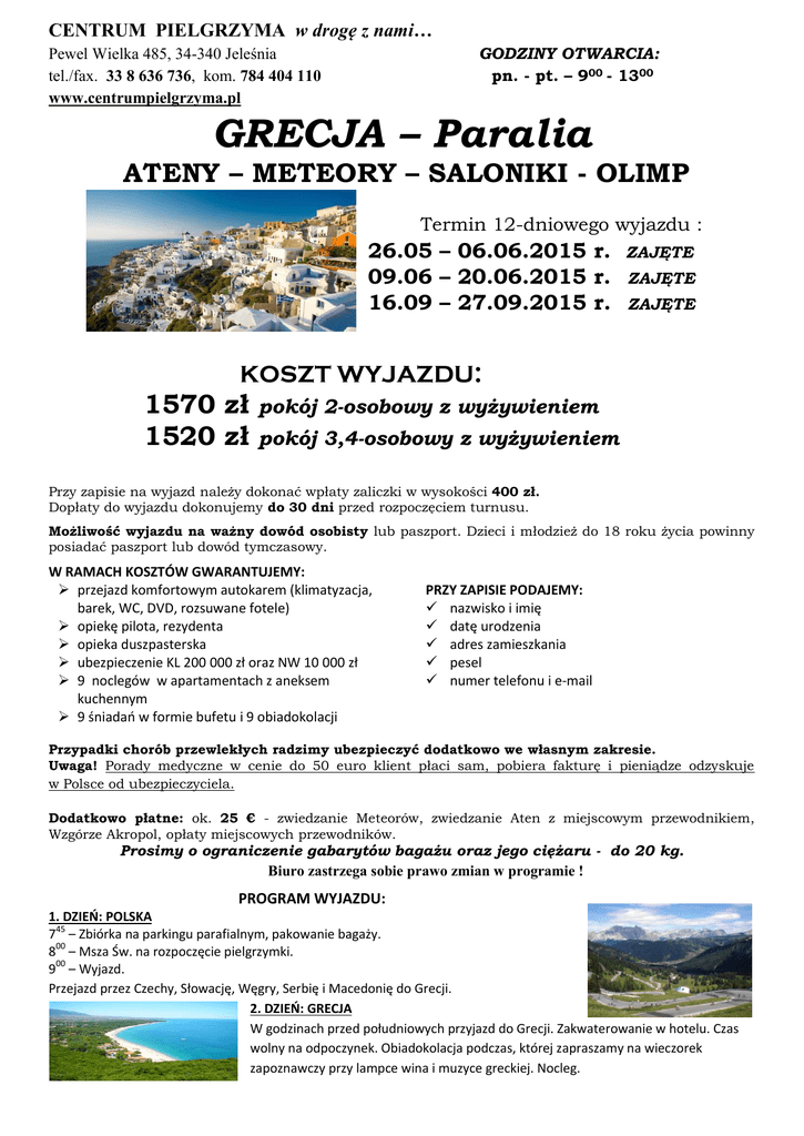 CENTRUM PIELGRZYMA w drogę z nami… GODZINY OTWARCIA: pn. - pt. – 900 - 1300 Pewel Wielka 485, 34-340 Jeleśnia tel./fax. 33 8 636 736, kom. 784 404 110 www.centrumpielgrzyma.pl GRECJA – Paralia ATENY – METEORY – SALONIKI - OLIMP Termin 12-dniowego wyjazdu : 26.05 – 06.06.2015 r. 09.06 – 20.06.2015 r. 16.09 – 27.09.2015 r. ZAJĘTE ZAJĘTE ZAJĘTE KOSZT WYJAZDU: 1570 zł 1520 zł pokój 2-osobowy z wyżywieniem pokój 3,4-osobowy z wyżywieniem Przy zapisie na wyjazd należy dokonać wpłaty zaliczki w wysokości 400 zł. Dopłaty do wyjazdu dokonujemy do 30 dni przed rozpoczęciem turnusu. Możliwość wyjazdu na ważny dowód osobisty lub paszport. Dzieci i młodzież do 18 roku życia powinny posiadać paszport lub dowód tymczasowy. W RAMACH KOSZTÓW GWARANTUJEMY: przejazd komfortowym autokarem (klimatyzacja, barek, WC, DVD, rozsuwane fotele) opiekę pilota, rezydenta opieka duszpasterska ubezpieczenie KL 200 000 zł oraz NW 10 000 zł 9 noclegów w apartamentach z aneksem kuchennym 9 śniadań w formie bufetu i 9 obiadokolacji PRZY ZAPISIE PODAJEMY: nazwisko i imię datę urodzenia adres zamieszkania pesel numer telefonu i e-mail Przypadki chorób przewlekłych radzimy ubezpieczyć dodatkowo we własnym zakresie. Uwaga! Porady medyczne w cenie do 50 euro klient płaci sam, pobiera fakturę i pieniądze odzyskuje w Polsce od ubezpieczyciela. Dodatkowo płatne: ok. 25 € - zwiedzanie Meteorów, zwiedzanie Aten z miejscowym przewodnikiem, Wzgórze Akropol, opłaty miejscowych przewodników. Prosimy o ograniczenie gabarytów bagażu oraz jego ciężaru - do 20 kg. Biuro zastrzega sobie prawo zmian w programie ! PROGRAM WYJAZDU: 1. DZIEŃ: POLSKA 745 – Zbiórka na parkingu parafialnym, pakowanie bagaży. 800 – Msza Św. na rozpoczęcie pielgrzymki. 900 – Wyjazd. Przejazd przez Czechy, Słowację, Węgry, Serbię i Macedonię do Grecji. 2. DZIEŃ: GRECJA W godzinach przed południowych przyjazd do Grecji. Zakwaterowanie w hotelu. Czas wolny na odpoczynek. Obiadokolacja podczas, której zapraszamy na wieczorek zapoznawczy przy lampce wina i muzyce greckiej. Nocleg. 3. DZIEŃ: GRECJA Śniadanie. Dzień wolny na plażowanie i rekreację nad Morzem Egejskim. Obiadokolacja i nocleg. 4. DZIEŃ: GRECJA – METEORY Śniadanie. Wyjazd do Meteorów – zwiedzanie dwóch klasztorów zawieszonych na skale między ziemią a niebem, które zaliczane są do 7 cudów świata. Jest to miejsce kultu chrześcijaństwa ortodoksyjnego, a zwiedzanie obiektów nawiązuje do kultury bizantyjskiej. Adrenalinę zwiedzania podnosi podjazd autokarem do całego Zespołu Klasztorów Górskich Meteory, które położone są na niedostępnych skałach i urwiskach. Podczas wyjazdu odwiedzimy dolinę Tembi, gdzie skały masywu Olimpu spotykają się z masywem Ossy tworząc magiczny wąwóz skalny, w którym znajduje się Kościółek Św. Paraskievii wraz ze źródłem, którego woda według legendy ma moce uzdrawiające. Obiadokolacja i nocleg. 5. DZIEŃ: GRECJA Śniadanie. Dzień wolny na plażowanie i rekreację nad Morzem Egejskim. Obiadokolacja i nocleg. 6. DZIEŃ: GRECJA – SALONIKI Śniadanie. Wyjazd do Salonik – miasta, którego nazwa pochodzi od siostry Aleksandra Wielkiego o imieniu Thessalonike. Miasto zostało jej podarowane przez męża – króla Kassandra i nazwane jej imieniem. Podczas spaceru po zabytkowej części miasta odwiedzimy: Kościół Św. Demetriosa, ruiny Agory, Kościół Panagia Helkedon, Łuk Triumfalny Galeriusza, Kościół Hagia Sofia, Plac Arystotelesa, Białą Wieżę, bazar turecki oraz dzielnicę portową. Czas wolny. Powrót do hotelu. Obiadokolacja i nocleg. 7. DZIEŃ: GRECJA Śniadanie. Dzień wolny na plażowanie i rekreację nad Morzem Egejskim. Obiadokolacja i nocleg 8. DZIEŃ: GRECJA - ATENY W godzinach wczesno porannych wyjazd do Aten. Śniadanie w formie suchego prowiantu. Przyjazd do Portu w Pireusie – zwiedzanie największego portu Morza Śródziemnomorskiego. Zwiedzanie starożytnej części miasta Ateny rozpoczynając od wzgórza Akropolu na którym można podziwiać zespół budowli – Partenon, Erechtejon oraz kolumnadę wjazdową Propyleje. Ze wzgórza Akropolu spacer poprzez Aeropag, Agorę Grecką, następnie Agorę Rzymską do centrum miasta, gdzie przejdziemy dzielnicą bohemy artystycznej Place. W miarę możliwości oglądanie zmiany warty pod Parlamentem. Wizyta na stadionie olimpijskim Kalimarmaro. Następnie przejazd pod najważniejszymi obiektami miasta, czyli Akademią Ateńską oraz Świątynią Zeusa Olimpijskiego. Czas wolny na zakupy i spacer ulicami Aten. W drodze powrotnej zatrzymamy się pod Termopilami gdzie 300 Spartian pod wodzą Leonidasa zatrzymało armię perską w „gorących wrotach”. Powrót do hotelu. Obiadokolacja i nocleg. 9. DZIEŃ: GRECJA Śniadanie. Dzień wolny na plażowanie i rekreację nad Morzem Egejskim. Obiadokolacja i nocleg 10. DZIEŃ: GRECJA – GÓRA OLIMP Śniadanie. Wycieczka na zbocza Góry Olimp, podczas której odwiedzimy najciekawsze zakątki dachu starożytnego świata. Ta relaksacyjna wycieczka obejmuje wyjazd do Litohoro – miasteczka usytuowanego u stóp Olimpu, wizyta w klasztorze Św. Dionizosa, następnie przejazd do Paleos Panteleimonas – starej górskiej wioski położonej na zboczach Olimpu. Wizyta w twierdzy bizantyjskiej Panteleimonas. Powrót do hotelu, czas wolny na rekreację i odpoczynek nad Morzem. Obiadokolacja i nocleg. 11. DZIEŃ: GRECJA Śniadanie. Pakowanie bagaży i opuszczenia apartamentów do godz. 1000. Możliwość umieszczenia bagaży w autokarze. Czas wolny na plażowanie oraz rekreację. W godzinach popołudniowych wyjazd w kierunku polski. 12. DZIEŃ: POLSKA W godzinach popołudniowych przyjazd do Polski. Dla chętnych możliwość uczestnictwa we Mszy Świętej. !!! W przypadku rezygnacji z uczestnictwa w wyjeździe nie można otrzymać zwrotu wpłaconej gotówki – na swoje miejsce należy znaleźć inną osobę. Organizator zastrzega sobie możliwoś
