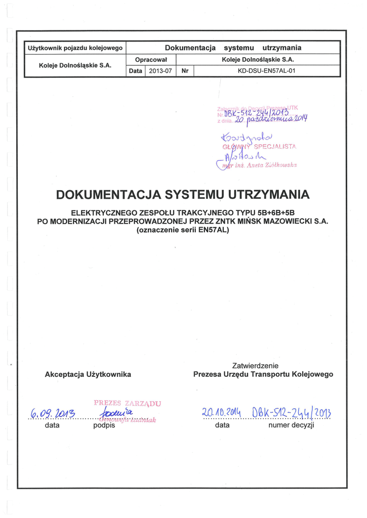 Użytkownik pojazdu kolejowego Koleje Dolnośląskie S.A. Dokumentacja systemu utrzymania Opracował Data 2013-07 Koleje Dolnośląskie S.A. Nr Strona 3 Arkusz [strona] 2[1/4] KD-DSU-EN57AL-01 Załącznik [strona] SPIS TREŚCI Treść L.P. Strona Arkusz 1 Karta informacyjna. 2 1 2 Spis treści. 3 2 3 Karta zmian. 7 3 4 Karta charakterystyki. Podstawowe dane techniczne ezt EN57AL 8 4 5 Wstęp. Pojęcia podstawowe 10 5 6 Poziomy utrzymania pojazdów kolejowych 12 6 7 Karta dokumentów związanych. Pojazdy kolejowe. 13 7 8 Karta norm i przepisów międzynarodowych. Polskie Normy. Kolejnictwo. Zagadnienia ogólne. 14 8 9 Karta norm i przepisów międzynarodowych. Polskie Normy. Pojazdy kolejowe. Zagadnienia ogólne. 15 9 10 Karta norm i przepisów międzynarodowych. Karty UIC. Zagadnienia ogólne. Materiały i wymagania. 17 10 11 Karta norm i przepisów międzynarodowych. Karty UIC. Pojazdy kolejowe. Zagadnienia ogólne. 22 11 12 Karta norm i przepisów międzynarodowych. Polskie Normy. Pojazdy kolejowe. 23 12 13 Karta norm i przepisów międzynarodowych. Karty UIC. Pojazdy kolejowe. 24 13 14 Opis funkcjonalny elektrycznego zespołu trakcyjnego EN57AL 25 14 15 Karta cyklu przeglądowo-naprawczego. Elektryczne zespoły trakcyjne. 33 15 16 Arkusz przeglądowy. Przeglądy sezonowe 35 16 Wykaz czynności przeglądowych przy 1, 2 i 3 poziomie utrzymania pojazdów kolejowych (przeglądy okresowe) 17 Arkusz przeglądowy. Pojazd kolejowy kompletny. 37 F1 18 Arkusz przeglądowy. Ostoja. 38 F2 19 Arkusz przeglądowy. Nadwozie. 39 F3 20 Arkusz przeglądowy. Wózki. 41 F4 21 Arkusz przeglądowy. Zestawy kołowe, łożyska osiowe i zawieszenia silników trakcyjnych. 43 F5 22 Arkusz przeglądowy. Urządzenia cięgłowe i zderzakowe. 45 F8 23 Arkusz przeglądowy. Hamulec i układ pneumatyczny wraz ze sprężarką. 47 F9 24 Arkusz przeglądowy. Ogrzewanie, wentylacja, klimatyzacja 53 F11 25 Arkusz przeglądowy. Wyposażenie wewnętrzne. 55 F13 26 Arkusz przeglądowy. Bateria akumulatorów. 57 F14 27 Arkusz przeglądowy. Oświetlenie i instalacja elektryczna nn. 58 F15 Załącznik Użytkownik pojazdu kolejowego Koleje Dolnośląskie S.A. Dokumentacja systemu utrzymania Opracował Data Koleje Dolnośląskie S.A. 2013-07 Nr Strona 4 Arkusz [strona] 2[2/4] KD-DSU-EN57AL-01 Załącznik [strona] SPIS TREŚCI L.P. Treść 28 Arkusz przeglądowy. Aparaty i urządzenia elektryczne WN i nn obwodów głównych i pomocniczych. 61 F16 29 Arkusz przeglądowy. Maszyny elektryczne 72 F17 30 Arkusz przeglądowy. Przekładnia główna. 74 F21 31 Arkusz przeglądowy. Układ monitoringu i informacji audio - wizualnej 75 F23 32 Arkusz przeglądowy. Rampa inwalidzka 77 F24 33 Arkusz przeglądowy. Przyrządy kontrolno pomiarowe. 78 F24 34 Arkusz przeglądowy. Sterowanie kabinowe i urządzenia czujności. 79 F25 35 Arkusz przeglądowy. System smarowania. 81 F26 Strona Arkusz Załącznik Wzory kart pomiarowych przy czynnościach obsługowych 1, 2 i 3 poziomu utrzymania 36 Karta pomiarowa. Zawieszenie sprzęgów czołowych, międzywagonowych, zgarniaczy torowych i szynowych i zderzaków międzywagonowych 83 P1 37 Karta pomiarowa. Zestaw kołowy 85 P2 38 Karta pomiarowa. Hamulec i urządzenia pneumatyczne 88 P3 39 Karta pomiarowa. Karta pomiarowa sprężarki powietrza 96 P4 40 Karta pomiarowa. Sterowanie kabinowe i urządzenia czujności 97 P5 41 Karta pomiarowa. Wyposażenie elektryczne 98 P6 42 Karta pomiarowa. Wyposażenie elektryczne 102 P7 43 Karta pomiarowa. Wyposażenie elektryczne 104 P8 44 Karta smarowania 109 P9 Wykaz czynności naprawczych wykonywanych przy 4 i 5 poziomie utrzymania pojazdów kolejowych 45 Arkusz naprawczy. Pojazd kolejowy kompletny. 115 F1 46 Arkusz naprawczy. Ostoja. 116 F2 47 Arkusz naprawczy. Nadwozie. 117 F3 48 Arkusz naprawczy. Wózki. 122 F4 49 Arkusz naprawczy. Zestawy kołowe, łożyska osiowe i zawieszenia silników trakcyjnych. 125 F5 50 Arkusz naprawczy. Urządzenia cięgłowe i zderzakowe. 127 F8 51 Arkusz naprawczy. Hamulec i układ pneumatyczny wraz ze sprężarką. 128 F9 52 Arkusz naprawczy. Ogrzewanie, wentylacja, klimatyzacja 133 F11 53 Arkusz naprawczy. Wyposażenie wewnętrzne. 137 F13 54 Arkusz naprawczy. Bateria akumulatorów. 139 F14 Użytkownik pojazdu kolejowego Koleje Dolnośląskie S.A. Dokumentacja systemu utrzymania Opracował Data 2013-07 Koleje Dolnośląskie S.A. Nr Strona 5 Arkusz [strona] 2[3/4] KD-DSU-EN57AL-01 Załącznik [strona] SPIS TREŚCI 55 Arkusz naprawczy. Oświetlenie i instalacja elektryczna nn. 140 F15 56 Arkusz naprawczy. Aparaty i urządzenia elektryczne WN i nn obwodów głównych i pomocniczych. 144 F16 57 Arkusz naprawczy. Maszyny elektryczne 159 F17 58 Arkusz naprawczy. Przekładnia główna. 160 F21 59 Arkusz naprawczy. Układ monitoringu i informacji audio - wizualnej 161 F23 60 Arkusz naprawczy. Rampa inwalidzka 162 F24 61 Arkusz naprawczy. Przyrządy kontrolno pomiarowe. 163 F24 62 Arkusz naprawczy. Sterowanie kabinowe i urządzenia czujności. 164 F25 63 Arkusz naprawczy. System smarowania. 165 F26 64 Arkusz naprawczy. Pojazd kolejowy kompletny po naprawie. 166 F31 65 Wzory kart pomiarowych przy czynnościach obsługowych 4 i 5 poziomu utrzymania 66 Karta pomiarowa. Ostoja (wagon rozrządczy) 168 N1 67 Karta pomiarowa. Ostoja (wagon silnikowy) 170 N2 68 Karta pomiarowa. Podwozie (wagon rozrządczy) 172 N3 69 Karta pomiarowa. Podwozie (wagon silnikowy) 174 N4 70 Karta pomiarowa. Podwozie (wagon rozrządczy−sprężyny gumowo-metalowe) 176 N5 71 Karta pomiarowa. Podwozie (wagon silnikowy − sprężyny gumowo-metalowe) 177 N6 72 Karta pomiarowa. Zawieszenie sprzęgów czołowych, międzywagonowych, zgarniaczy torowych i szynowych i zderzaków międzywagonowych 178 N7 73 Karta pomiarowa. Czop skrętu i gniazdo czopa skrętu. 180 N8 74 Karta pomiarowa. Rama wózka i belka bujakowa. 181 N9 75 Karta pomiarowa. Sprężyny 183 N10 76 Karta pomiarowa. Sprężyny metalowo - gumowe 184 N11 77 Karta pomiarowa. Luzy na ślizgach belki bujakowej 186 N12 78 Kart