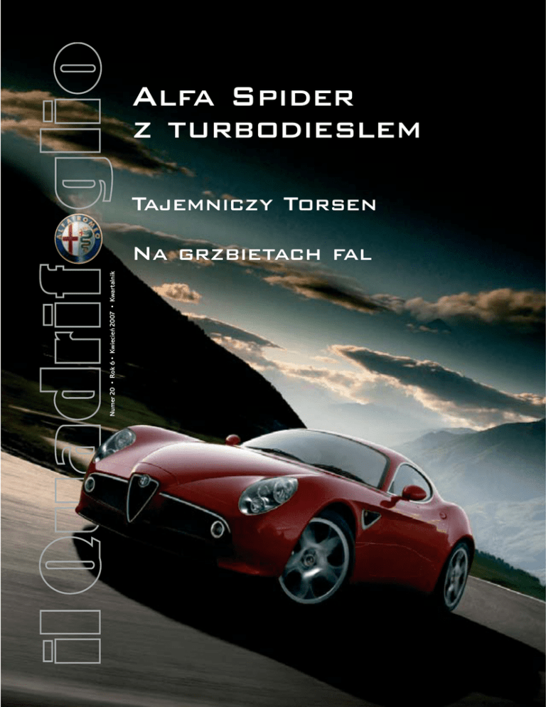 Alfa Spider z turbodieslem Tajemniczy Torsen Numer 20 • Rok 6 • Kwiecień 2007 • Kwartalnik Na grzbietach fal od redakcji w numerze Szanowni Państwo Samochód sportowy ze składanym dachem napędzany silnikiem diesla – kiedyś taki pomysł uznano by za herezję. Na przełamanie tego tabu odważyła się Alfa Romeo, instalując w modelu Spider 2.4 JTDM potężny, 5-cylindrowy, 20-zaworowy silnik o olbrzymiej mocy 200 KM. Wyposażone w niego auto, pokazane na salonie w Genewie, ma wszystkie sportowe walory – osiąga prędkość przekraczającą 228 km/h i przyspiesza od 0 do 100 km/h w zaledwie 8,4 sekundy. Siłą marki Alfa Romeo, oprócz pięknych, włoskich linii samochodów są bowiem zastosowane w nich rozwiązania techniczne: znakomite silniki wysokoprężne, zrobotyzowane skrzynie biegów czy mechaniczne blokady dyferencjału typu Torsen, dzięki którym prowadzenie aut staje się łatwiejsze i bezpieczniejsze, a jednocześnie zapewnia kierowcom sportowe doznania. Sportowy duch Alfy wyraża się zresztą nie tylko w jej samochodach. Współpracuje ona ze słynną wyścigową firmą motocyklową Ducati, sponsoruje sport żeglarski – również w Polsce, patronując Maciejowi Grabowskiemu, wicemistrzowi Europy w klasie Laser, który zamierza w przyszłym roku walczyć o medal podczas olimpiady w Pekinie. Marka Alfa Romeo symbolizuje piękno, styl i pełnię życia. Nieprzypadkowo współpracuje z twórcami i stylistami, patronuje pokazom mody, a w Polsce tradycyjnie już fundowała nagrodę – Alfę 159 – w plebiscycie „VIVA Najpiękniejsi”. Pełnia życia – to również kuchnia, oczywiście włoska, którą reprezentuje znakomity kucharz i alfista Giancarlo Russo. Dla polskich alfistów przekazał on specjalny przepis na potrawę – oczywiście w kolorze „Rosso Alfa”. Życzę więc miłej lektury i smacznego. Motorshow Strona 6 Redaktor Naczelny Sylwester Baczkowski nr 20, rok 6 kwiecień 2007 Redaktor Naczelny Sylwester Baczkowski Konsultacja Fiat Auto Poland Rafał Grzanecki Zespół redakcyjny Anna Borsukiewicz Filippo Gallino Aldona Górna Jerzy Kozierkiewicz Mirosława Malich Konsultacja redakcyjna Francesco Novo Satiz srl Turyn Dyrektor Artystyczny Maciej Feodorów Studio DTP Satiz Poland 4 Wydarzenia 6 Motorshow Wyjątkowość marki Najnowsze modele Alfy Romeo na 77. Międzynarodowym Salonie Samochodowym w Genewie. Reklama Biuro Reklamy – Prasa Korporacyjna Wydawnictwo MURATOR Sp. z o.o. tel. 022 59 05 023, 022 59 05 024 faks 022 59 05 367 e-mail: [email protected] Wydawca Satiz Poland ul. 11 Listopada 60/62 43-300 Bielsko-Biała tel 0 [33] 813 27 61 fax 0 [33] 813 41 76 [email protected] Tajemniczy Torsen Techniczne tajniki mechanizmu różnicowego zastosowanego w wersjach Q4 i Q2 samochodów Alfa Romeo. 30 Sport Na grzbietach fal Wodne skutery, jachty, barki... Spokojne żeglowanie i ekstremalne wyczyny. Sposobów na wypoczynek nad wodą i w wodzie jest mnóstwo. 38 24 26 42 46 Historia Gdy o marketing dba historia Piękne, zabytkowe Alfy pomagają w promowaniu najnowszych modeli marki. Na torze Na torach wyścigów motocyklowych Alfa Romeo współpracuje z Ducati Corse podczas zawodów SBK Superbike World Championship. Szkoła jazdy Dyplom z bezpieczeństwa Il Quadrifoglio towarzyszy uczestnikom kursów pomagających alfistom w lepszym panowaniu nad ich pojazdami. Wydarzenia Piękni, piękniejsi, najpiękniejsi Joanna Brodzik i Maciej Zakościelny laureatami plebiscytu dwutygodnika „Viva!”, Alfa 159 nagrodą dla czytelniczki. Akcesoria Akcesoria do Alfy 159 i 159 Sportwagon Dodatki opracowane specjalnie do Alfy 159 i 159 Sportwagon wzbogacają auta i uprzyjemniają podróżowanie oraz sportową jazdę. 18 Rozmowa Kuchnia pełna namiętności Giancarlo Russo – właściciel warszawskiej restauracji „Gancarlo” opowiada o tajnikach swojej kuchni, miłości do Polki i włoskich samochodów. Prezentacja Wyzwanie oceanu Roberto Aversano na katamaranie One Shot Alfa Spider chce ustanowić rekord w przepłynięciu Atlantyku. 14 Technika Druk Dimograf ul. Legionów 83 43-300 Bielsko-Biała Oddano do druku ??kwietnia 2007 r. 28 48 Dealerzy i Kluby 3 wydarzenia Pierwszy salon w Rosji Spaghetti party Alfistów Alfa Romeo otworzyła w Rosji swój pierwszy salon samochodowy, inaugurując w ten sposób swą strategię rozwoju marki na tamtejszym rynku. W tym roku na terenie Federacji Rosyjskiej ma powstać siedem kolejnych punktów dealerskich, przede wszystkim w Moskwie, Sankt Petersburgu oraz Jekaterynburgu. Powinny one sprzedać do końca roku ponad 2000 samochodów Alfa Romeo. Ceremonię otwarcia salonu w Moskwie uświetnili swą obecnością Antonio Baravalle, odpowiedzialny za markę Alfa Romeo i Michaił Bachtiarow, prezes spółki Major Automobile Holding. Firma ta, jak stwierdził Antonio Baravalle, ma ogromne doświadczenie w zakresie wspierania sprzedaży i posprzedaży w segmencie produktów luksusowych i dysponuje rozbudowaną siecią lojalnych klientów. Dlatego właśnie wybrano ją jako partnera przy wprowadzaniu marki Alfa Romeo na rosyjskim rynku. Zapraszam wszystkich na popołudnie w czerwcową sobotę – mówi Giancarlo Russo, właściciel włoskiej restauracji Giancarlo w Warszawie i zaprzysięgły alfista. – Niech przyjadą swymi Alfami, wezmą ze sobą jakieś firmowe gadżety. Spotkamy się przed moją restauracją przy ul. Rzymowskiego 34. Na parkingu zostanie rozstawiony namiot, ja i moi kucharze będziemy gotować włoskie potrawy. Będzie to pierwsze „Spaghetti party” zorganizowane dla alfistów, ale Giancarlo liczy, że stanie się corocznym zwyczajem. Dokładne informacje o imprezie będą umieszczone na internetowej stronie Alfy Romeo www.alfaromeo.pl. Wywiad z Giancarlo Russo zamieszczamy na str. 18. Nagroda dla 8C Competizione Giulietta T. I. w rajdzie „Pekin – Pary˝ 2007”. Podczas ceremonii zamknięcia 22. Festival Automobile International w Paryżu Alfa Romeo 8C Competizione otrzymała koronę „najpię