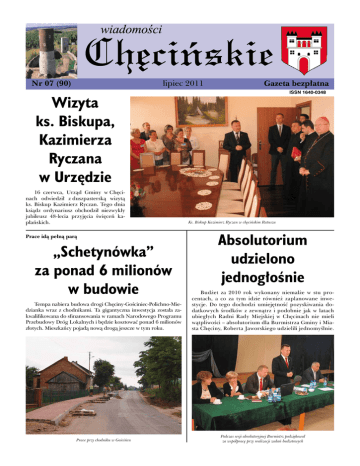 Nr 07 (90) lipiec 2011 Gazeta bezpłatna ISSN 1640-0348 Wizyta ks. Biskupa, Kazimierza Ryczana w Urzędzie 16 czerwca, Urząd Gminy w Chęcinach odwiedził z duszpasterską wizytą ks. Biskup Kazimierz Ryczan. Tego dnia ksiądz ordynariusz obchodził niezwykły jubileusz 48-lecia przyjęcia święceń kapłańskich. Prace idą pełną parą „Schetynówka” za ponad 6 milionów w budowie Ks. Biskup Kazimierz Ryczan w chęcińskim Ratuszu Absolutorium udzielono jednogłośnie Tempa nabiera budowa drogi Chęciny-Gościniec-Polichno-Miedzianka wraz z chodnikami. Ta gigantyczna inwestycja została zakwalifikowana do sfinansowania w ramach Narodowego Programu Przebudowy Dróg Lokalnych i będzie kosztować ponad 6 milionów złotych. Mieszkańcy pojadą nową drogą jeszcze w tym roku. Budżet za 2010 rok wykonany niemalże w stu procentach, a co za tym idzie również zaplanowane inwestycje. Do tego dochodzi umiejętność pozyskiwania dodatkowych środków z zewnątrz i podobnie jak w latach ubiegłych Radni Rady Miejskiej w Chęcinach nie mieli wątpliwości – absolutorium dla Burmistrza Gminy i Miasta Chęciny, Roberta Jaworskiego udzielili jednomyślnie. Prace przy chodniku w Gościńcu Podczas sesji absolutoryjnej Burmistrz podziękował za współpracę przy realizacji zadań budżetowych Z ŻYCIA GMINY Szlak Archeo-Geologiczny – przystanek Chęciny Trwają prace nad budową tarasu widokowego na Górze Rzepce, będącej jedną z największych atrakcji nowo powstającego Świętokrzyskiego Szlaku Archeo-Geologicznego, stanowiącego turystyczny projekt liniowy realizowany na terenie województwa świętokrzyskiego. W skład wyznaczonego szlaku ArcheGeologicznego wchodzi także Góra Rzepka - znajdujący się w Paśmie KieleckoChęcińskim Gór Świętokrzyskich rezerwat przyrody nieożywionej, utworzony w 1981 r. na obszarze 9,09 ha. W obrębie położonej niespełna kilometr na zachód od Góry Zamkowej części wyrobiska kamieniołomu, znajduje się efektowna ściana skalna o wysokości kilkudziesięciu metrów, zbudowana z dolomitów o odcieniu czerwonawym. Na grzbiecie Góry odsłaniają się ławicowe wapienie środkowego dewonu ze skamieniałościami fauny dewońskiej. Obecne są tu także ślady dawnego górnictwa rud ołowiu. W rezerwacie rosną chronione rzadkie gatunki roślin ciepłolubnych, m.in. dziewięćsił bezłodygowy, dziewięćsił popłocholistny i zawilec wielkokwiatowy. 2 To ciekawe miejsce stanowi jeden z najpiękniejszych przystanków geologicznej ścieżki dydaktycznej Gór Świętokrzyskich, kryjących w sobie mnóstwo tajemnic z ponad 500 milionów lat dziejów naszej planety, stanowiących prawdziwy raj dla geologów i palentilogów, archeologów czy historyków, gdzie każdy z pewnością znajdzie coś interesującego dla siebie. Oznakowany jednorodnie znakami drogowymi Świętokrzyski Szlak Archeo-Geologiczny połączy najciekawsze atrakcje geologiczne i archeologiczne wschodniej i zachodniej części województwa świętokrzyskiego, stanowiąc ponadregionalną atrakcję turystyczną, również w kontekście nadchodzących Mistrzostw Europy EURO 2012. Niebawem przedstawimy kolejne miejsca szlaku powstałe na terenie naszej gminy. Magdalena Bilewska W numerze: • Szlak Archeo-Geologiczny – przystanek Chęciny • Absolutorium udzielono jednogłośnie • 100 PLACÓW ZABAW NA 100 LAT NIVEA • „Solarigrafia - czyli obrazy malowane słońcem” • Kolejny sukces „Bolminianek” • Brak środków na staże oraz prace interwencyjne • „Bezpieczne Wakacje 2011” pod hasłem Ogólnopolskiej Kampanii „Zachowaj Trzeźwy Umysł” • „Schetynówka” za ponad 6 milionów w budowie • Sieć wodociągowa w gminie rozwija się • „Bolminianki” na V Przeglądzie Pieśni Maryjnych w Nowinach • Koncert Dominiki Żukowskiej i Andrzeja Koryckiego • Golęciny mają już nową drogę • Małe podróże – wielkie zwiedzanie skansenu w Tokarni • Wizyta ks. Biskupa, Kazimierza Ryczana w Urzędzie • Rowery powędrowały do prymusów • „Śladami wspólnej historii w drodze do europejskiego partnerstwa narodów” • Powstaną kolejne place zabaw • Bogusława Nartowska Sołtysem roku 2010 • Spotkanie z profesorem Karpowiczem • INFORMACJA • Trwa rewitalizacja chęcińskich uliczek • Rozpoczyna się projektowanie nowego przedszkola w Chęcinach • „Novatory 2010” rozdane • Wolica teatrem stoi • Konkurs dla nauczycieli • Nowa droga na ul. Dobrzączka • Demografia • Zlot motoryzacyjny stowarzyszenia CAAR w Chęcinach • Kolejne kilometry dróg w Chęcinach • Noc Kupały 2011 • Trwa remont budynku OSP Łukowa • Zakończyły się prace przy szkole w Bolminie • Nowa kanalizacja w Lipowicy, Przymiarkach i Starochęcinach • SP w Łukowej będzie miała kotłownię olejową i nowe OC • „Miłosz od nowa” • UWAGA KONKURS !!! - REGULAMIN KONKURSU KULINARNEGO „JARZYNA KRÓLOWEJ BONY” • Piernik w kształcie chęcińskiego zamku doceniony • Policja • Mamy najlepszego tenisistę stołowego w województwie • Podsumowanie Szkolnej Ligi Tenisa Stołowego Szkół Gimnazjalnych • Finał Ligi Mistrzów „Echa Dnia” • Bolmin najlepszy w siatkówce plażowej Z ŻYCIA GMINY Absolutorium udzielono jednogłośnie Budżet za 2010 rok wykonany niemalże w stu procentach, a co za tym idzie również zaplanowane inwestycje. Do tego dochodzi umiejętność pozyskiwania dodatkowych środków z zewnątrz i podobnie jak w latach ubiegłych Radni Rady Miejskiej w Chęcinach nie mieli wątpliwości – absolutorium dla Burmistrza Gminy i Miasta Chęciny, Roberta Jaworskiego udzielili jednomyślnie. Zanim jednak doszło do jednego z ważniejszych głosowań, jakie odbywają się w Radzie Miejskiej, dotyczącego rozliczenia z wykonania budżetu za rok poprzedni, przewodnicząca komisji rewizyjnej przedstawiła obecnym na sesji wniosek komisji rewizyjnej skierowany do Regionalnej Izby Obrachunkowej w sprawie udziele