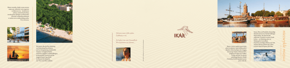 Mamy wszystko, dzięki czemu możesz wypocząć, odświeżyć swój organizm i zrelaksować się – komfortowe pokoje, wyśmienitą kuchnię, szeroką gamę zabiegów, profesjonalny personel i znakomite położenie w samym sercu nadmorskiego parku, 70 m od morza. Druck: K AME R A, 78-100 Kołobrzeg, ul. Jasna 7, tel. +48 94 354 22 36, www.kamerapress.pl Wir bieten alles für Ihre Erholung, zur Erfrischung Ihres Körpers und zur Entspannung: komfortable Zimmer, vorzügliche Küche, ein breites Angebot an Behandlungen, professionelles Personal und die ausgezeichnete Lage direkt im Herzen des Kurparks, nur 70 m vom Meer entfernt. Słońce, morze i piękne, piaszczyste plaże to zaledwie część kołobrzeskich skarbów, które każdego roku ściągają do naszego miasta wielu turystów, pragnących wypocząć i zadbać o swoje zdrowie. Za sprawą unikalnego klimatu, solanki i borowiny, Kołobrzeg tętni życiem przez cały rok. … ein einmaliger Ort Sie haben nur eine Gesundheit. Wir kümmern uns darum… Sonne, Meer und herrliche, feinsandige Strände sind nur ein Teil der Kolberger Naturschätze, die Jahr für Jahr zahlreiche Touristen in unsere Stadt locken – zur Erholung oder zur Stärkung der Gesundheit. Dank des einmaligen Klimas, der Sole und des Moores pulsiert das Leben in dieser Stadt das ganze Jahr über. niezwykłe miejsce Zdrowie masz tylko jedno. Zadbamy o nie. Für unsere Gäste bieten wir 140 Zimmer sowie 7 Apartments mit Balkon, Bad mit Dusche, Telefon, Sat-TV, Radio und Kühlschrank. Darüber hinaus befinden sich in der Hotel-Anlage: Geldwechsel, Optiker, Friseur- und Kosmetiksalon, Parkplatz und Garage. Basen, sauna, łaźnia parowa, jacuzzi, salka fitness, kawiarnia z dancingiem i przepięknie zaaranżowany ogród zimowy to nasze propozycje na spędzenie wolnego czasu w miłym towarzystwie aktywnie bądź przy ciastku i aromacie przepysznej kawy. Wir heißen Sie herzlich willkommen zu unserer schmackhaften und gesunden Küche. Wir bieten ein vielfältiges Menü, alle Mahlzeiten als Büffet sowie Diätkost nach Wahl. centrum zdrowia Gesundheitszentrum gastronomia Gastronomie hotel Hotel Naszym gościom oferujemy 140 pokoi oraz 7 apartamentów z balkonem, łazienką z prysznicem, telefonem, TV-Sat, radiem i lodówką. Dodatkowo na terenie obiektu znajdują się: kantor, optyk, salon fryzjersko-kosmetyczny, parking i garaż. Zapraszamy Państwa do skorzystania ze smacznej i zdrowej kuchni. Oferujemy zróżnicowane menu, wszystkie posiłki w formie bufetu, możliwość wyboru diety. Naszym atutem, obok usług hotelowych, jest centrum rehabilitacji. Proponujemy zabiegi z zakresu elektroterapii, leczenia polem magnetycznym, światłolecznictwa, ciepłolecznictwa, hydroterapii i krioterapii. Oferujemy szeroką gamę masaży, m.in. masaż gorącymi kamieniami i stemplami ziołowymi. Ihre Freizeit können Sie aktiv in Schwimmbad, Sauna, Dampfsauna, Jacuzzi, Fitnessraum verbringen – oder im Café mit Tanzabenden, im wunderschön eingerichteten Wintergarten, in netter Gesellschaft bei Kuchen und köstlichem Kaffeearoma. Neben dem Hotel ist das Rehabilitationszentrum besonders hervorzuheben: Wir bieten Behandlungen im Bereich der Elektrotherapie, Heilverfahren mit Magnetfeldern, Licht- und Wärmetherapie, Hydrotherapie und Kryotherapie sowie eine große Auswahl an Massagen, u.a. Massage mit heißen Steinen und Kräuterstempeln.