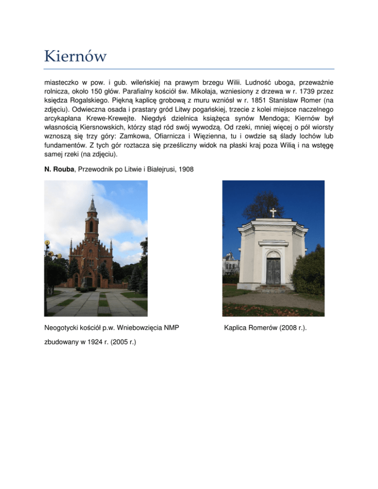 Kiernów miasteczko w pow. i gub. wileńskiej na prawym brzegu Wilii. Ludność uboga, przeważnie rolnicza, około 150 głów. Parafialny kościół św. Mikołaja, wzniesiony z drzewa w r. 1739 przez księdza Rogalskiego. Piękną kaplicę grobową z muru wzniósł w r. 1851 Stanisław Romer (na zdjęciu). Odwieczna osada i prastary gród Litwy pogańskiej, trzecie z kolei miejsce naczelnego arcykapłana Krewe-Krewejte. Niegdyś dzielnica książęca synów Mendoga; Kiernów był własnością Kiersnowskich, którzy stąd ród swój wywodzą. Od rzeki, mniej więcej o pół wiorsty wznoszą się trzy góry: Zamkowa, Ofiarnicza i Więzienna, tu i owdzie są ślady lochów lub fundamentów. Z tych gór roztacza się prześliczny widok na płaski kraj poza Wilią i na wstęgę samej rzeki (na zdjęciu). N. Rouba, Przewodnik po Litwie i Białejrusi, 1908 Neogotycki kościół p.w. Wniebowzięcia NMP zbudowany w 1924 r. (2005 r.) Kaplica Romerów (2008 r.). Widok na Wilię (2008 r.). Spis miejscowości oraz nazwisk mieszkańców parafii kiernowskiej w 1864 r. Plebania kiernowska Ks. Proboszcz Jan Wojtkiewicz, Fronckiewicz, Błażewicz, Świrski, Putrament, Abramowicz, Pietuszko, Olszewski. m. Kiernów Dowejko, Borsuk, Malinowski, Gierszycki?, Zaszewski, Jazdowski, Stucki, Abalewicz, Kozłowski, Zaszewski, Milkiewicz, Pietkiewicz, Ryckiewicz, Masliński, Laskowski, Wysocki, Łazarewicz, Satkiewicz, Dowgiało, Bukowski, Germacki, Sławszczyński. Kiernowo folwarek Szwedowicz, Parwaniecki. Siemieniszki Rożewski, Zacharuk, Ryckiewicz, Drozdowski, Szwedowicz. Podwarańcy Pilecki, Kulikowski, Szałkowski, Gryszkiewicz. Racheliszki Gryszkiewicz, Szałkowski, Pilecki, Iwanowski. Mieżancy Borejko, Pieczul, Tyszkiewicz, Ruczyński, Wojtkiewicz, Brozołowicz, Gryszkiewicz. Kiernówek majątek Rusiecki, Szałkowski, Jurkiewicz, Borejko, Gryszkiewicz. Pustelniki Pieczul, Palonis. Grabiały folwark Chiliński, Wonsewicz. Majątek Europa Dudiałko, Giljun, Ruczyński, Pieczul, Grynis, Pawłowski, Rusiecki, Swidziński. Alejuńcy Giljun, Czybur, Gryszkiewicz, Wojtkiewicz, Pieczul, Lichtorowicz. Sibirówka zaścianek Wonsewicz, Pieczul. Strazdy zaścianek Palewski, Wonsewicz, Dachniewicz. Pakielnia Pieczul, Tyszkiewicz, Wojtkiewicz. Kiernówka zaścianek Gryszkiewicz, Ruczyński, Szałkowski. Kliszabłocie zaścianek Bielawski, Kosiłowicz. Darkuszki Kamilewicz, Baranowski, Bakszański, Borysewicz, Mikołojun, Błażewicz, Bujanowski, Sztura, Bakszański, Tambakiewicz, Mikołajun. Plikiszki majątek Aszemberg, Sztura, Abako. Pieski zaścianek Sztura. Plikiszki wieś Abako, Sztura, Bakszański, Mikołajun, Błażewicz, Grablewski, Michałowski. Drawczy wieś Szwedowicz, Wilkiewicz, Malinowski, Pilecki, Jazdowski, Zinkowicz, Szemieto. Szylino zaścianek Kolendo, Saduński. Iłgobroda zaścianek Wilkiewicz, Sadowski. Podjezorok Jackiewicz, Czeczot. Krzyżówka wieś Bakionis, Smilis, Karużis, Bukowski. Rudejkiszki zaścianek Wysocki, Wróblewski, Andruszkiewicz, Sawuniewski, Sadowski. Mejłuny zaścianek Kolendo. Mejłuny wieś Chmielewski, Karużis, Bekionis, Grygorowicz, Sawaniewski, Pietkiewicz, Sinkiewicz, Mikołojun, Syrulewicz, Krzywicki. Pomierze zaścianek Rynkiewicz. Pomierze wieś Wróblewski, Sinkiewicz, Stankiewicz, Żukowski, Syruniewicz, Dobużyński, Bekionis, Spreski. Pospierz wieś Sawanowski, Żukowski, Wróblewski, Stankiewicz, Bekionis, Syrulewicz, Milewski, Kotkowski. Wirszuliszki wieś Wróblewski, Bikionis, Gabrylewicz, Paszkowski, Czypokowski, Mikołajun, Milewski. Żwirżdoupie zaścianek Bikionis. Pohulanka zaścianek Ikoniewicz. Zołtoruny wieś Taberet, Adamowicz, Gryszkiewicz, Czekanowicz, Szwedowicz. Czyrki Andruszkiewicz, Diełażewski, Mosliński, Szwedowicz. Wiciuny wieś Porwaniecki, Wilkiewicz, Zaborowski, Kowalewski, Markindorf, Petrusewicz. Wiciuny majątek Jankowski, Adamowicz, Rusiecki. Wojtkuny zaścianek Sperski, Wasilewski, Mikołajun, Palewski. Kowkiszki wieś Borejko, Butkiewicz, Jurkiewicz, Łaukis. Rusaki wieś Łaukis, Wilkiewicz. Nowosiołki zaścianek Butkiewicz. Borejkiszki zaścianek Dzubiński. Kunigiszki wieś Giełożewski, Rusiłowicz, Szubocz, Karycki, Wróblewski, Binkiewicz, Szwedowicz, Rymkiewicz, Rożewski, Grodecki. Sutkuszki majątek Manowski, Pol, Paniewski, Puzyn. Pakalniszki wieś Sokołowski, Rusiecki, Jurkiewicz, Palonis, Puzyn, Ikaniewicz. Ramaniszki zaścianek Rożewski, Brazowski. Szałkowszczyzna zaścianek Pawłowski, Milkiewicz, Bazyk, Ikoniewicz, Minkowski, Korecki. Krapiliszki wieś Jakionis, Wilkiewicz, Kwiatkowski, Dziedziewicz, Strawiński. Dejlidzie zaścianek Kwiatkowski. Ardziszki wieś Ignatowicz, Borejko, Butkiewicz, Subocz, Wróblewski, Paszkiewicz, Jurkiewicz. Sosnówka zaścianek Rożewski, Wróblewski. Walukiszki zaścianek Ikoniewicz, Łazarewicz. Koninszyki zaścianek Swietlikowski. Mitkiszki zaścianek Tujko. Antakalce wieś Łapiński, Stankiewicz, Samosionok, Pieczul, Janczewski, Wonsewicz. Giejszyszki wieś Samosionok, Wojtkiewicz, Drozdowski, Monkiewicz, Łapiński, Bieniuk, Siesicki, Kozakiewicz, Andruszkiewicz, Karczewski, Stankiewicz, Stempkowski. Giejszyszki majątek Giedrojć, Mickiewicz, Czarniawski, Zakrzewski, Markiewicz, Tombakiewicz, Szymanowski, Bakszański, Bieniuk, Masiuk, Stempkowski, Gryniewicz, Wonsewicz, Waszkiewicz, Rynkiewicz, Cielchonowicz, Ambrożewicz, Rypiński. Groby Walentynowiczów i Rusieckich (2005 r.). Opracowanie i zdjęcia Cz. Malewskiego.
