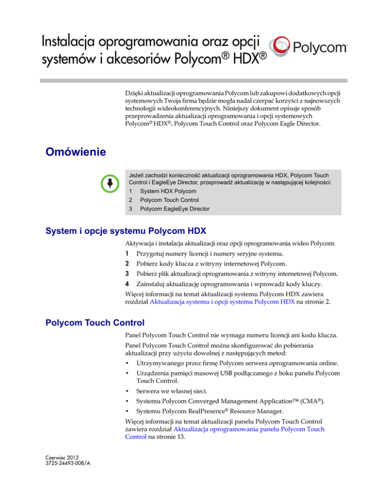 Instalacja oprogramowania oraz opcji systemów i akcesoriów Polycom® HDX® Dzięki aktualizacji oprogramowania Polycom lub zakupowi dodatkowych opcji systemowych Twoja firma będzie mogła nadal czerpać korzyści z najnowszych technologii wideokonferencyjnych. Niniejszy dokument opisuje sposób przeprowadzenia aktualizacji oprogramowania i opcji systemowych Polycom® HDX®, Polycom Touch Control oraz Polycom Eagle Director. Omówienie Jeżeli zachodzi konieczność aktualizacji oprogramowania HDX, Polycom Touch Control i EagleEye Director, przeprowadź aktualizację w następującej kolejności: 1 System HDX Polycom 2 Polycom Touch Control 3 Polycom EagleEye Director System i opcje systemu Polycom HDX Aktywacja i instalacja aktualizacji oraz opcji oprogramowania wideo Polycom: 1 Przygotuj numery licencji i numery seryjne systemu. 2 Pobierz kody klucza z witryny internetowej Polycom. 3 Pobierz plik aktualizacji oprogramowania z witryny internetowej Polycom. 4 Zainstaluj aktualizację oprogramowania i wprowadź kody kluczy. Więcej informacji na temat aktualizacji systemu Polycom HDX zawiera rozdział Aktualizacja systemu i opcji systemu Polycom HDX na stronie 2. Polycom Touch Control Panel Polycom Touch Control nie wymaga numeru licencji ani kodu klucza. Panel Polycom Touch Control można skonfigurować do pobierania aktualizacji przy użyciu dowolnej z następujących metod: • Utrzymywanego przez firmę Polycom serwera oprogramowania online. • Urządzenia pamięci masowej USB podłączanego z boku panelu Polycom Touch Control. • Serwera we własnej sieci. • Systemu Polycom Converged Management Application™ (CMA®). • Systemu Polycom RealPresence® Resource Manager. Więcej informacji na temat aktualizacji panelu Polycom Touch Control zawiera rozdział Aktualizacja oprogramowania panelu Polycom Touch Control na stronie 13. Czerwiec 2012 3725-24493-008/A Instalacja oprogramowania oraz opcji systemów i akcesoriów Polycom HDX Polycom EagleEye Director Rozwiązanie Polycom EagleEye Director nie wymaga numeru licencji ani kodu klucza. Aktywacja i instalacja aktualizacji oraz opcji oprogramowania Polycom EagleEye Director: 1 Pobierz plik aktualizacji oprogramowania z witryny internetowej Polycom. 2 Zainstaluj oprogramowanie. Więcej informacji na temat aktualizacji panelu Polycom EagleEye Director zawiera rozdział Aktualizacja oprogramowania rozwiązania Polycom EagleEye Director na stronie 19. Aktualizacja systemu i opcji systemu Polycom HDX Przygotowania do aktualizacji oprogramowania systemu Polycom HDX Uwagi dotyczące aktualizacji oprogramowania systemu Polycom HDX: 2 • Ze względu na zmiany w funkcjach oprogramowania i interfejsu użytkownika, niektóre ustawienia mogą zostać utracone po aktualizacji do najnowszej wersji lub ponownej instalacji starszej wersji po aktualizacji. Polycom zaleca przechowywanie ustawień systemu przy użyciu profili i pobieranie katalogu systemu przed aktualizacją oprogramowania systemu. Nie należy ręcznie edytować zapisanych lokalnie plików katalogów i profili. Więcej informacji na temat aktualizacji przechowywania ustawień systemu zawiera dokument Administrator’s Guide for Polycom HDX Systems (Podręcznik administratora systemów Polycom HDX). • Przed rozpoczęciem aktualizacji oprogramowania system przeprowadzi wewnętrzny restart, co zabiera zazwyczaj około 2-3 minut. Zwiększa to niezawodność procesu aktualizacji, zwalniając pamięć przed jej przeprowadzeniem. W przypadku aktualizacji systemu Polycom HDX przy użyciu przeglądarki internetowej wewnętrzne ponowne uruchomienie nie jest widoczne z jej poziomu. • Systemy Polycom HDX seria 6000, Polycom HDX seria 7000 i Polycom HDX seria 8000 muszą być podłączone do jednej z kamer Polycom EagleEye, aby otrzymywać sygnały podczerwone (IR) z pilota zdalnego sterowania. W celu obsługi systemu HDX Polycom skieruj pilot na kamerę. Polycom, Inc. Instalacja oprogramowania oraz opcji systemów i akcesoriów Polycom HDX Instalacja na systemie Polycom HDX objętym gwarancją lub planem serwisowym W przypadku instalacji oprogramowania na systemie Polycom HDX, który jest objęty gwarancją lub planem serwisowym, do aktywacji oprogramowania potrzebny jest klucz aktualizacji. Klucz można uzyskać, logując się pod adres support.polycom.com i zamawiając klucz aktualizacji. Do uzyskania klucza potrzebny jest numer seryjny systemu Polycom HDX. W przypadku instalacji oprogramowania na systemie Polycom HDX, który nie jest objęty gwarancją lub planem serwisowym, należy skontaktować się z autoryzowanym dystrybutorem systemów Polycom, uzyskać licencję i aktywować ją pod adresem support.polycom.com, aby uzyskać klucz aktualizacji. Instalacja przy użyciu systemu zarządzania w tradycyjnym trybie zarządzania Aby zainstalować najnowszą wersję oprogramowania w systemie Polycom HDX w tradycyjnym trybie zarządzania, należy użyć systemu zarządzania obsługującego metodą aktualizacji oprogramowania z zastosowaniem wewnętrznego ponownego uruchomienia systemu. Następujące systemy zarządzania obsługują tę metodę aktualizacji oprogramowania: • Systemy CMA w wersji 5.5 i 6.0 • System RealPresence Resource Manager w wersji 7.0 lub nowszej • Polycom ReadiManager® SE200 w wersji 3.0.7 lub nowszej • Polycom Global Management System™ w wersji 7.1.10 lub nowszej Instalacja wcześniejszej wersji systemu HDX po aktualizacji W przypadku reinstalacji wcześniejszej wersji oprogramowania po aktualizacji do nowszej (downgrading) firma Polycom zaleca przeprowadzanie instalacji niestandardowej i wybór opcji Wymaż pamięć błyskową systemu. Ustawienie to jest dostępne w przypadku użycia aktualizacji oprogramowania. Uwagi dotyczące reinstalacji wcześniejszej wersji: • Polycom, Inc. Aby określić używaną wersję oprogramowania, należy wybrać pozycje System > Informacje o systemie w interfejsie lokalnym lub pozycje Admin (Administrator) > Tools (Narzęd