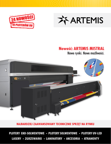 10 PLOTERÓW UV Nowość: ARTEMIS MISTRAL Nowe rynki. Nowe możliwości. NAJBARDZIEJ ZAAWANSOWANY TECHNICZNIE SPRZĘT NA RYNKU PLOTERY EKO-SOLWENTOWE • PLOTERY SOLWENTOWE • PLOTERY UV-LED LASERY • ZGRZEWARKI • LAMINATORY • AKCESORIA • ATRAMENTY PLOTERY EKO-SOLWENTOWE PLOTERY EKO-SOLWENTOWE 18 m2/h System stałego zasilania ARTEMIS 1801 VD Najnowsza głowica DX9 (1440 dpi) ER ER Głowica DX5 - druk falą System stałego zasilania Zmienna kropla - Vardot Panel sterowania LCD System suszący Podwójny system suszący: promiennik IR + wentylatory ATRAMENT od 39 € LITR ATRAMENT Stabilna konstrukcja Główne zalety: - wysokiej jakości głowice DX5 + druk falą (eliminujący paskowanie) - stół z 3 niezależnymi grzałkami (przed, pod i za głowicą) - podwójny system suszący: promiennik podczerwieni + wentylatory - max. grubość mediów do 4 mm z łatwą regulacją za pomocą specjalnej dźwigni - system stałego zasilania obniżający koszty druku - 2-silnikowy system nawijający - zaawansowane oprogramowanie RIP - PhotoPrint od Ciężki, 2-silnikowy system nawijający GWARANCJA NAJLEPSZEJ CENY NA RYNKU PLOTER TAŃSZY O POŁOWĘ od urządzeń konkurencyjnych ARTEMIS 1621 Atrament Szerokość materiału Szerokość zadruku Rozdzielczość Prędkość Gwarancja u klienta eko-solwent (CMYK) max. 1600 mm max. 1520 mm max. 1440 x 1440 dpi max. 18 m2/h 12 miesięcy 2 System rolowy 25 900 zł Artemis 1801 VD to ploter o szerokości 1800 mm. Zastosowana w nim została najnowsza głowica DX9 ze zmienną wielkością kropli, która posiada 1440 dysz w 8 rzędach. Łatwa regulacja wysokości karetki (max. grubość 3 mm). Eko-solwentowy Artemis cechuje się niskim kosztem eksploatacji jak i niskim kosztem zakupu. Posiada więc bardzo dobry wskaźnik zwrotu inwestycji. BŁYSKAWICZNY ZWROT z inwestycji ARTEMIS 1801 VD Atrament Szerokość materiału Szerokość zadruku Rozdzielczość Prędkość Gwarancja u klienta eko-solwent (CMYK) max. 1800 mm max. 1720 mm max. 1440 x 1440 dpi max. 18 m2/h 12 miesięcy 7 POWODÓW DLA KTÓRYCH WARTO WYBRAĆ TEN PLOTER DLA KTÓRYCH WARTO WYBRAĆ TEN PLOTER Błyskawiczny zwrot inwestycji. Ograniczenie strat. Brak paskowania = oszczędność mediów. Ciągła produkcja: automatyczne systemy rolowe i suszące. Stabilna głowica EPSON na lata. Intuicyjna obsługa za pomocą oprogramowania PhotoPrint. Tanie atramenty, bez chipów, dolewane z butli. 39 € LITR 6 POWODÓW 1. 2. 3. 4. 5. 6. LL SE LL SE Ułatwiony dostęp do głowic Ploter eko-solwentowy ST BE ST BE Ploter eko-solwentowy ARTEMIS 1621 łatwa regulacja temperatur podwójny system suszący - wentylatory / InfraRed ARTEMIS PRINTERS KATALOG 2016 1. 2. 3. 4. 5. 6. 7. Bardzo niska cena. Szersze możliwości = rolki do 180 cm. Gładkie przejścia tonalne i aple dzięki tech. zmiennej kropli. Automatyczna produkcja: system rolowy, suszący, zasilania. Najnowsze technologie - głowica Epson DX9. Intuicyjna obsługa za pomocą oprogramowania PhotoPrint. Tanie atramenty, bez chipów, dolewane z butli. www.artemisprinters.eu SYSTEM SUSZĄCY 3 PLOTERY SOLWENTOWE PLOTERY SOLWENTOWE 50 m2/h 50 m2/h System stałego zasilania Program RIP Ciężki system rolowy PRĘDKOŚĆ MAX. ATRAMENT eco 100 14 € od m2/h LITR BANER ECO ARTEMIS KM 3208-42/14 64 900 zł W ZESTAWIE: system stałego zasilania, system rolowy, program, atramenty, instalacja 8 głowic Konica Minolta 512 System stałego zasilania 8 POWODÓW DLA KTÓRYCH WARTO WYBRAĆ TEN PLOTER 1. Zarabiaj szybciej - drukuj z realną prędkością 50 m2/h. 2. Oszczędzaj atramenty dzięki możliwości czyszczenia wszystkich lub pojedynczych sekcji kolorystycznych. 3. Produkcyjne, długowieczne głowice Konica Minolta. 4. Możliwość rozbudowy w miarę potrzeb o kolejne głowice. 5. Jakość druku porównywalna do ploterów eko. 6. Najtańszy atrament na rynku, bez chipów. 7. Wybierz niskozapachowy atrament eko do wewnątrz lub agresywny i odporny na zewnątrz. 8. Intuicyjna obsługa za pomocą oprogramowania PhotoPrint. 4 Atrament Szerokość materiału Szerokość zadruku Rozdzielczość Prędkość Gwarancja u klienta solwent / eko-solwent (CMYK) max. 3200 mm max. 3170 mm max. 1080 dpi max. 50 m2/h 12 miesięcy Wybierz głowice do swoich potrzeb! 42 pl 14 pl KONICA MINOLTA KM 512 KONICA MINOLTA KM 512 ARTEMIS PRINTERS KATALOG 2016 100 m2/h Program RIP ATRAMENT 16 € od LITR GWARANCJA NAJLEPSZEJ CENY NA RYNKU PONAD 150 INSTALACJI w Polsce ARTEMIS KM 3204-42 / 3204-14 ZALETY PLOTERÓW ARTEMIS KM 3204-xx i 3208-xx: - wysokiej jakości japońskie i amerykańskie podzespoły - druk równoległy nawet na 2-3 rolkach jednocześnie - głowice grayscalowe Konica Minolta - 8 poziomów - stół z grzałkami podgrzewającymi materiał - automatyczny system rozwijająco-nawijający do 100 kg - oprogramowanie RIP: Onyx lub PhotoPRINT - stabilność, niezawodność i łatwa obsługa Ć PRĘDKOŚĆ MAX. 4 głowice Konica Minolta 512 Ć Ciężki system rolowy Ploter solwentowy OŚ W OŚ W ARTEMIS KM 3204-42/14 NO NO Ploter solwentowy ARTEMIS KM 3208-42 / 3208-14 ZALETY PLOTERÓW ARTEMIS KM 3204-xx i 3208-xx: - wysokiej jakości japońskie i amerykańskie podzespoły - druk równoległy nawet na 2-3 rolkach jednocześnie - głowice grayscalowe Konica Minolta - 8 poziomów - stół z grzałkami podgrzewającymi materiał - automatyczny system rozwijająco-nawijający do 100 kg - oprogramowanie RIP: Onyx lub PhotoPRINT - stabilność, niezawodność i łatwa obsługa 8 POWODÓW DLA KTÓRYCH WARTO WYBRAĆ TEN PLOTER 1. Dołącz do ponad 150 zadowolonych użytkowników w Polsce. 2. Zarabiaj jeszcze szybciej - drukuj z realną prędkością 100 m2/h. 3. Oszczędzaj atramenty dzięki możliwości czyszczenia wszystkich lub pojedynczych sekcji kolorystycznych. 4. Produkcyjne, długowieczne głowice Konica Minolta. 5. Jakość druku porównywalna do ploterów eko. 6. Najtańszy atrament na rynku, bez chipów. 7. Wybierz niskozapachowy atrament eko do wewnątrz lub agresywny i odporny 