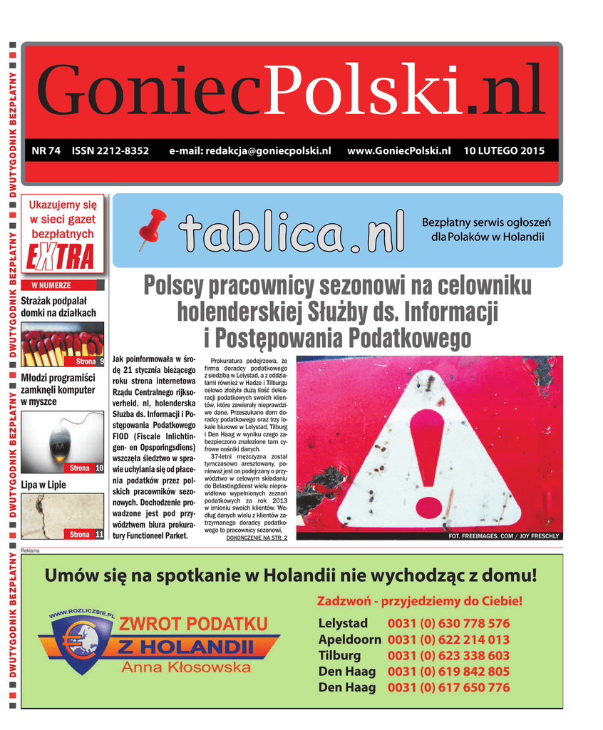 n n n DWUTYGODNIK BEZPŁATNY n n n DWUTYGODNIK BEZPŁATNY n n n DWUTYGODNIK BEZPŁATNY n n n DWUTYGODNIK BEZPŁATNY n n n Ukazujemy się w sieci gazet bezpłatnych W NUMERZE Strażak podpalał domki na działkach Polscy pracownicy sezonowi na celowniku holenderskiej Służby ds. Informacji i Postępowania Podatkowego Strona 9 Jak poinformowała w śro- dę 21 stycznia bieżącego Młodzi programiści roku strona internetowa zamknęli komputer Rządu Centralnego rijksow myszce verheid. nl, holenderska Służba ds. Informacji i Postępowania Podatkowego FIOD (Fiscale Inlichtingen- en Opsporingsdiens) wszczęła śledztwo w spraStrona 10 wie uchylania się od płacenia podatków przez polLipa w Lipie skich pracowników sezonowych. Dochodzenie prowadzone jest pod przywództwem biura prokuraStrona 11 tury Functioneel Parket. Reklama Prokuratura podejrzewa, że firma doradcy podatkowego z siedzibą w Lelystad, a z oddziałami również w Hadze i Tilburgu celowo złożyła dużą ilość deklaracji podatkowych swoich klientów, które zawierały nieprawdziwe dane. Przeszukano dom doradcy podatkowego oraz trzy lokale biurowe w Lelystad, Tilburg i Den Haag w wyniku czego zabezpieczono znalezione tam cyfrowe nośniki danych. 37-letni mężczyzna został tymczasowo aresztowany, ponieważ jest on podejrzany o przywództwo w celowym składaniu do Belastingdienst wielu nieprawidłowo wypełnionych zeznań podatkowych za rok 2013 w imieniu swoich klientów. Według danych wielu z klientów zatrzymanego doradcy podatkowego to pracownicy sezonowi, DOKOŃCZENIE NA STR. 2 FOT. FREEIMAGES. COM / JOY FRESCHLY 2 Praca i życie w Holandii WTOREK, 10 lutego 2015 Polscy pracownicy sezonowi na celowniku holenderskiej Służby ds. Informacji i Postępowania Podatkowego DOKOŃCZENIE ZE STR. 1 którzy w Holandii pracowali tylko kilka miesięcy w roku, a zostali rozliczeni jakby pracowali w Holandii cały rok. W związku z tym osoby te nienależnie otrzymały wyższy zwrot podatku, bo doradca zastosował ulgę, która tym akurat podatnikom nie przysługiwała. Na wielu forach internetowych pracownicy sezonowi polecali sobie biuro doradcy bo wylicza najwyższe zwroty… Pozostaje zagadką, jak prokuratura podejdzie do pracowników sezonowych, których deklaracje zostały złożone w ten sposób i czy będą musieli oddać nienależnie pobrany zwrot podatku? FOT. FREEIMAGES. COM / CONSTANTIN DEACONESCU Reklama ŹRÓDŁO: HTTP://WWW.RIJKSOVERHEID.NL/NIEUWS/2015/01/21/DOORZOEKINGEN-IN-ONDERZOEK-NAAR-BELASTINGFRAUDE-DOOR-POOLSE-SEIZOENARBEIDERS.HTML HTTP://WWW.LBEA.NL/GO.LIVE.PHP/PL-H9/AKTUALNOSCI/109/ROZLICZ-SIE-HO- LENDERSKIM-FISKUSEM-ZGODNIE-Z-PRAWEM.HTML HTTP://WWW.BD.NL/REGIO/TILBURG-EN-OMGEVING/TILBURG/INVALLEN-IN-TILBURG-LELYSTAD-EN-DEN-HAAG-WEGENS-BELASTINGFRAUDE-POOLSE-SEIZOENARBEIDERS-1.4725138HTTP://NOS.NL/ARTIKEL/2014579-FIOD-ONDERZOEKT-BELASTINGFRAUDE-SEIZOENSARBEIDERS.HTML HTTP://WWW.TELEGRAAF.NL/BINNENLAND/23584137/__FIOD_ONDERZOEKT_FRAUDE_POLEN__.HTML HTTP://WWW.NEWSLOCKER.COM/NL-NL/REGIO/FLEVOLAND/LELYSTAD-ADVIESBUREAU-VERDACHT-VAN-BELASTINGFRAUDE/ HTTP://WWW.STADINDEX.NL/LELYSTAD/1420248-ADVIESBUREAU-VERDACHT-VAN-BELASTINGFRAUDE HTTP://WWW.ALMERESTART.NL/NIEUWS/LELYSTAD-ADVIESBUREAU-VERDACHT-VAN-BELASTINGFRAUDE/ HTTP://WWW.OMROEPFLEVOLAND.NL/NIEUWS/120393/LELYSTAD-ADVIESBUREAU-VERDACHT-VAN-BELASTINGFRAUDE FOT. FREEIMAGES. COM / NIKARETEKU Reklama 3 4 Praca i życie w Holandii WTOREK, 10 lutego 2015 Polacy sezonowo pracujący w Holandii pod lupą Belastingdienst Zawdzięczają to polskiemu księgowemu, który ich prawdopodobnie źle rozliczył Księgowy został tymczasowo aresztowany Wywiad z Anną Kłosowską, założycielką i właścicielką Kancelarii Podatkowej. GP. Czy w związku z tymczasowym aresztowaniem księgowego jego klienci mogą mieć jakieś problemy? GoniecPolski. nl: Czy słyszała Pani o aferze, którą żyje cała Holandia? Chodzi o aresztowanie księgowego z Lelystad, przez którego nasi rodacy mogą mieć teraz kłopoty. AK.: Urząd podejrzewa, że zeznania podatkowe tych osób za rok 2013 zostały celowo nieprawidłowo przygotowane, ponieważ ich księgowy nie zastosował się do nowych przepisów. Rozliczał „po staremu”. Anna Kłosowska.: Tak, sły- GP.: Co to znaczy, że rozliczał „po staremu”? szałam. Mówili o tym w holenderskiej telewizji, radiu, pisała o tym holenderska gazeta De Telegraaf oraz inne czasopisma w Holandii. Na stronach rządowych Rijksoverheid też można przeczytać wzmiankę o zatrzymaniu księgowego. Piszą o tym na wielu portalach holenderskich i polskich. Jest o tym głośno. Reklama AK.: Przepisy podatkowe za 2013 rok zmieniły się niestety na niekorzyść podatników. Kwota zwrotu zależy od ilości przepracowanych miesięcy. Dlatego też pracownicy sezonowi, którzy pracowali w Holandii np. 3 miesiące w 2013 roku otrzymają niską kwotę zwrotu podatku, natomiast w latach poprzednich otrzymywali cały podatek jaki zapłacili do holenderskiego fiskusa. Rijksoverheid podaje, że księgowy został aresztowany, ponieważ robiąc rozliczenie za 2013 rok podawał informację, że podatnik przepracował cały rok 2013. A nie zgodnie z prawdą, że były to tylko np. 3 miesiące w roku. To w taki sposób klient otrzymywał zwrot podatku za cały rok, czyli „po staremu”. GP.: Z tego wynika, że Belastingdienst mógł stracić sporo pieniędzy przez polskiego księgowego. Czy jego klienci będą musieli oddawać pieniądze do Urzędu? AK.: Jeżeli to faktycznie prawda, to niestety tak. To wersja optymistyczna. Bo równie dobrze Belastingdienst może ich ukarać za celowe działanie na szkodę fiskusa. Nie wiadomo jak do tego podejdą. Czy całą winą obciążą księgowego? Czy też będą ścigać każdego klienta, którego aresztowany księgowy rozliczył „po staremu”. GP.: A czy zgłaszają się do pani biur klienci, których ten księgowy źle rozliczył? AK.: Tak przychodzą. Są przerażeni. Proszą, aby im pomóc. Przychodzą z czekam
