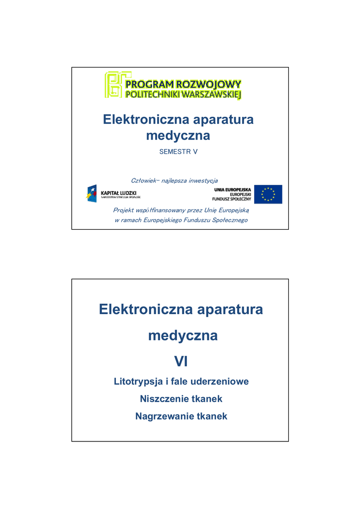 Elektroniczna aparatura medyczna SEMESTR V Człowiek- najlepsza inwestycja Projekt współfinansowany przez Unię Europejską w ramach Europejskiego Funduszu Społecznego Elektroniczna aparatura medyczna VI Litotrypsja i fale uderzeniowe Niszczenie tkanek Nagrzewanie tkanek Litotrypsja Litotrypsja Czym jest litotrypsja Mechanizmy kruszenia Źródło fali uderzeniowej Lokalizacja/wizualizacja złogów Sprzężenie z pacjentem Zagrożenia – skutki uboczne Litotrypsja Litotrypsja – kruszenie złogów (kamieni) powstających w drogach moczowych (głównie w nerkach) z wykorzystaniem fali uderzeniowej generowanej pozaustrojowo. Extracorporeal Shock Wave Lithotrypsy – ESWL Pierwsze zastosowanie kliniczne - 1980r, w Klinice Urologii Grosshadern, Monachium, prof. Christian Chaussy, litotrypter HM3 firmy Dornier. Przełł omowy moment w urologii. Firma Dornier – twórca pierwszej aparatury, która znalazła zastosowania praktyczne, jedna z wiodących firm na rynku. Litotrypsja Podstawowa metoda leczenia przypadków kamicy nerek i moczowodów, stosowalna do złogów o średnicach od 4mm do ok. 2cm. Stosuje się do ok. 100 udarów w ciągu minuty. Zabieg trwa około godziny. W chwili obecnej ok. 75% zabiegów usuwania kamieni nerkowych wykonuje się metodą litotrypsji (ESWL). Okazało się, że modyfikacja ESWL - ESWT- Extracorporeal Shock Wave Therapy może być z powodzeniem stosowana w przypadku pewnych urazów ortopedycznych. ESWL stosuje się także do kruszenia złogów w drogach żółciowych. Litotrypsja Prawa nerka ludzka, przekrój podłużny (rysunek GNU FDL): 1. piramida nerkowa 2. tętnica międzypłatowa 3. tętnica nerkowa 4. żyła nerkowa 5. wnęka nerki 6. miedniczka nerkowa 7. moczowód 8. kielich mniejszy 9. torebka włóknista złóg nerkowy 10. biegun dolny nerki 11. biegun górny nerki 12. żyła międzypłatowa 13. nefron 14. zatoka nerkowa 15. kielich większy 16. brodawka nerkowa 17. słupy nerkowe Litotrypsja Metoda wymaga: - zlokalizowania obrazowania złogu – system - wygenerowania akustycznej fali uderzeniowej – źródło fali + zogniskowanie fali - zapewnienia odpowiednich warunków propagacji fali (sprzężenie źródło- pacjent) - skutki uboczne??? Litotrypsja Mechanizmy kruszenia: - naprężenia ścinające rozciągające i - ściskanie - zmęczenie dynamiczne - kawitacja Litotrypsja Mechanizmy kruszenia: - naprężenia rozciągające i ścinające - ściskanie - zmęczenie dynamiczne - kawitacja Litotrypsja Kawitacja Występuje podczas fazy rozrzedzania tkanki, jeśli ciśnienie staje się dostatecznie niskie, wtedy pęcherzyki gazu znajdujące się w cieczy, tkance lub na granicy ośrodków stałych oscylują. Kawitacja może mieć charakter stabilny oscylacja pęcherzyków wokół stanu równowagi lub niestabilny - kiedy pęcherzyk rośnie i zapada się, a pękając staje się źródłem fali uderzeniowej. Powstające pęcherzyki kawitacyjne najpierw powiększają swą średnicę kilkaset razy, po czym zapadają się gwałtownie, w wyniku czego powstają wtórne fale uderzeniowe i szybko płynące mikrostrumienie cieczy uderzające w powierzchnię złogu. Oddziaływanie kawitacji powoduje lokalną koncentrację naprężeń i erozję złogu. Litotrypsja Rezultat Rezultaty litotrypsji dla różnych mocy pojedyńczych fal uderzeniowych – 0.3mJ/SW oraz 5mJ/SW (SW – Shock Wave) niszczenie fantomów złogów. W obu przypadkach szczytowe dodatnie ciśnienie wynosiło 20MPa, liczba impulsów - 1000. Najistotniejszy czynnik niszczący złogi - energia fali w ognisku. Istotne jest także przekroczenie peewnej wartości ciśnienia szczytowego - 10-30MPa. Litotrypsja Skutki uboczne.... Litotrypsja Parametry fali uderzeniowej Parametry: - ciśnienie szczytowe dodatnie p+ 10-150MPa (ponad 100x ciśnienie atmosferyczne!!!) (zastosowania diagnostyczne w USG – setki kPa) - maks. ciśnienie rozrzedzenia p- (ok. 10% p+) - czas narastania tr (pojedyncze ns) - czas trwania impulsu tw (300-500ns) - gęstość energii - energia w ognisku - rozkład ciśnienia - FHWM – szerokość rozkładu ciśnienia na poziomie 50% maksimum (- 6dB) Litotrypsja Rozkład ciśnienia fali uderzeniowej Rozkład 3D ciśnienia w funkcji odległości Litotrypsja Rozkład ciśnienia fali uderzeniowej Przekrój rozkładu ciśnienia w płaszczyźnie prostopadłej do kierunku rozchodzenia się fali Położenie punktów pomiaru ciśnienia Przekrój rozkładu ciśnienia w kierunku rozchodzenia się fali Litotrypsja Rozkład ciśnienia fali uderzeniowej Parametry rozkładu: - ciśnienie szczytowe - FHWM – szerokość rozkładu ciśnienia na poziomie 50% maksimum - 6dB - ciśnienie 5MPa – wartość minimalna dla uzyskania efektów terapeutycznych - energia E= A ρc ∫ p (t ) dt - gęstość strumienia energii (natężenie) mJ/mm2 E 1 = p (t ) dt A ρc ∫ Litotrypsja Metody generacji fali uderzeniowej - elektrohydrauliczna – fala uderzeniowa powstaje w wyniku wysokonapięciowego wyładowania iskrowego w cieczy - piezoelektryczna – fala uderzeniowa powstaje w wyniku odpowiedniego pobudzenia zespołu przetworników piezoelektrycznych usytuowanych na powierzchni czaszy - elektromagnetyczna - fala uderzeniowa powstaje w wyniku pobudzenia do ruchu membrany po podaniu na ułożoną równolegle do membrany cewkę indukcyjną impulsu napięcia Litotrypsja Metoda elektrohydrauliczna Metoda wykorzystuje wysokonapięciowe wyładowanie w łuku elektrycznym – między dwiema elektrodami zanurzonymi w wodzie, usytuowanymi w pierwszym ognisku zwierciadła elipsoidalnego. Powstaje pęcherzyk gazu, który rozszerza się i zapada, powodując powstanie fali uderzeniowej. W drugim ognisku następuje zogniskowanie tej fali. Wada – zużywanie się elektrod – trudność w kontrolowaniu odstępu między elektrodami i wobec tego trudność w aplikowaniu powtarzalnych kwantów energii. Litotrypsja Metoda elektrohydrauliczna Przykładowe wymiary ogniska Lx – 13mm Ly – 12mm Af =лLxLy/4 = 122.5mm2 Litotr