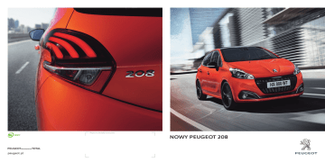 PP/DM MAJ 2015 nakład 15 000 Miejsce na pieczątkę koncesjonera NOWY PEUGEOT 208 PEUGEOTREKOMENDUJETOTAL peugeot.pl ENERGIA W CZYSTEJ FORMIE! Już na pierwszy rzut oka nowy PEUGEOT 208 przyciąga bardziej wyrazistym i wyrafinowanym, sportowym stylem, który może być podkreślony zupełnie nowym energetyzującym kolorem nadwozia Orange POWER, kojarzącym się z dynamiką i świeżością. Nowe, unikalne kolory nadwozia, liczne możliwości personalizacji dzięki pakietom Menthol White i Lime Yellow, wersja GTi, technologicznie zaawansowane, nowe elementy wyposażenia podnoszące komfort i bezpieczeństwo, oszczędne a jednocześnie bardzo wydajne nowe jednostki napędowe - w nowym PEUGEOT 208 pamiętano o każdym szczególe. MAGNETYCZNY uROk Przód nowego Peugeot 208 uwodzi ostrzejszą, precyzyjną i dynamiczną linią. Spojrzenia przyciąga nowy kształt zderzaka i wkomponowany w niego przeprojektowany grill z efektem 3D, który otoczony jest pogrubioną, chromowaną listwą ozdobną. Przesunięte na boki światła przeciwmgielne poszerzają optycznie nadwozie. Nowy Peugeot 208 wprost zachęca do zajęcia miejsca za kierownicą. Ważnym elementem nowej stylistyki przodu nadwozia są także nowe światła z diodami LED* świadczące o klasie samochodu, łączące kocią drapieżność z zaawansowaniem technologicznym. Czarne wypełnienie i chromowane elementy zapewniają im jeszcze większą wyrazistość. * w 100% diody elektroluminescencyjne, w standardzie już od drugiego poziomu wyposażenia ChARAkTERYSTYCZNE ŚWIATłA Nowe tylne światła z diodami LED i charakterystycznym dla marki Peugeot śladem pazurów przykuwają uwagę i zaskakują już od pierwszego spojrzenia. Ich oryginalna, nowoczesna stylistyka i ciepła, rubinowa barwa wraz ze spektakularnym efektem 3D, sprawiają, że nowy Peugeot 208 jest rozpoznawalny już z daleka. kOMpAkTOWY I WYJąTkOWO ZWROTNY Zwarta sylwetka nowego PEUGEOT 208 – o długości poniżej 4 metrów – w połączeniu z kompaktową kierownicą, zapewniają mu wyjątkową zwrotność w warunkach miejskich, potęgując przyjemność prowadzenia i gwarantując kierowcy pełnię satysfakcji oraz moc wrażeń. Nowy PEUGEOT 208 równie dobrze czuje się w mieście jak i poza miastem. Jest praktyczny w codziennym użytkowaniu i łatwy do zaparkowania dzięki czujnikom parkowania, kamerze cofania* (pokazującej przeszkody podczas manewrowania na wstecznym biegu) oraz systemowi Park Assist* (aktywnie wspomagającym kierowcę podczas parkowania równoległego i prostopadłego przy prędkościach poniżej 8 km/h). *W opcji, standardzie lub niedostępne w zależności od wersji. Systemy wspomagania prowadzenia, w przypadku których kierowca zachowuje pełną kontrolę nad samochodem. EkSCYTuJąCA I INTuICYJNA JAZdA W kabinie nowego PEUGEOT 208 wszystkie funkcje znajdują się w zasięgu ręki, dzięki innowacyjnemu rozwiązaniu PEUGEOT i-Cockpit, który ułatwia prowadzenie pojazdu. To rozwiązanie, obejmujące kompaktową kierownicę, umieszczone ponad jej obrysem zegary i 7” ekran dotykowy*, zapewnia pełnię doznań oraz intuicyjną i bezpieczną jazdę. Wnętrze nowego PEUGEOT 208 charakteryzują czyste linie oraz wysoka jakość wykonania. Zadbano o każdy szczegół, od rozplanowania przestrzeni poprzez unikalne oświetlenie, aż po staranny dobór materiałów. *w standardzie już od drugiego poziomu wykończenia. pEłNE ŚWIEżOŚCI, NOWOCZESNE kOlORY W odpowiedzi na rosnące wymagania klientów poszukujących unikalnych odcieni, oferta kolorów i rodzajów lakieru nowego PEUGEOT 208 wzbogaciła się o nowe propozycje. Obecnie obejmuje 12 różnych kolorów oraz 4 rodzaje: niemetalizowane, metalizowane, perłowe, strukturalne. Nowy metalizowany lakier Orange POWER kojarzy się z dynamiką i świeżością. Intensywny, opalizujący odcień mieni się w świetle. Ten radosny, modny i przykuwający wzrok kolor ma stanowić wizytówkę samochodu i jego kierowcy. Prezentowany egzemplarz w kolorze nadwozia Orange Power z pakietem personalizacji nadwozia Menthol White. MOżlIWOŚCI pERSONAlIZACJI Oferta nowego PEUGEOT 208 obejmuje również pakiety personalizacji*. Pakiet Menthol White z białymi akcentami wnosi nutę dynamiki i elegancji, podczas gdy pakiet Lime Yellow tworzy zdecydowanie energetyczny i nowoczesny klimat. Elementy personalizacji wnętrza pozwalają stworzyć dopracowaną w najdrobniejszych szczegółach nowoczesną i dopasowaną do charakteru kierowcy przestrzeń: od sportowych siedzeń, poprzez barwne elementy tapicerki**, kierownicy, deski rozdzielczej i drzwi, aż po chromowane obramowania nawiewów. Elementy personalizacji nadwozia łączą w sobie elegancję lśniącej czerni (obramowanie grilla, obudowy lusterek bocznych i obramowanie świateł przeciwmgielnych) z oryginalnymi kolorowymi akcentami** (grill „EQUALIZER” z barwnym efektem 3D, emblemat PEUGEOT z przodu i z tyłu auta, obramowanie świateł przeciwmgielnych i dodatkowych świateł kierunkowskazów). *w opcji już od drugiego poziomu wykończenia. **w kolorze wybranego pakietu. Prezentowany egzemplarz w kolorze nadwozia Srebrny ICE z pakietem personalizacji nadwozia Lime Yellow GRA ŚWIATEł Nowy PEUGEOT 208 dysponuje dwoma innowacyjnymi, unikalnymi, strukturalnymi lakierami zapewniającymi jednocześnie matowe i aksamitne wykończenie: Szary ICE i Srebrny ICE. Te atrakcyjne lakiery wyróżniające się na tle powszechnie dostępnych, bardzo silnie reagują na zmianę oświetlenia i doskonale eksponują kształty samochodu, podkreślając jego dynamiczną i nowoczesną sylwetkę. Lekko ziarnista struktura, zaskakująca w dotyku, sugeruje, że mamy do czynienia z solidnym i bezpiecznym samochodem. Są również bardziej odporne na drobne zarysowania i łatwiejsze w utrzymaniu niż klasyczne matowe lakiery - dobrze znoszą częste mycie pod ciśnieniem lub w myjni mechanicznej*. Dzięki ich wprowadzeniu do modeli seryjnych, kolory te stały się dostępne cenowo dla ws