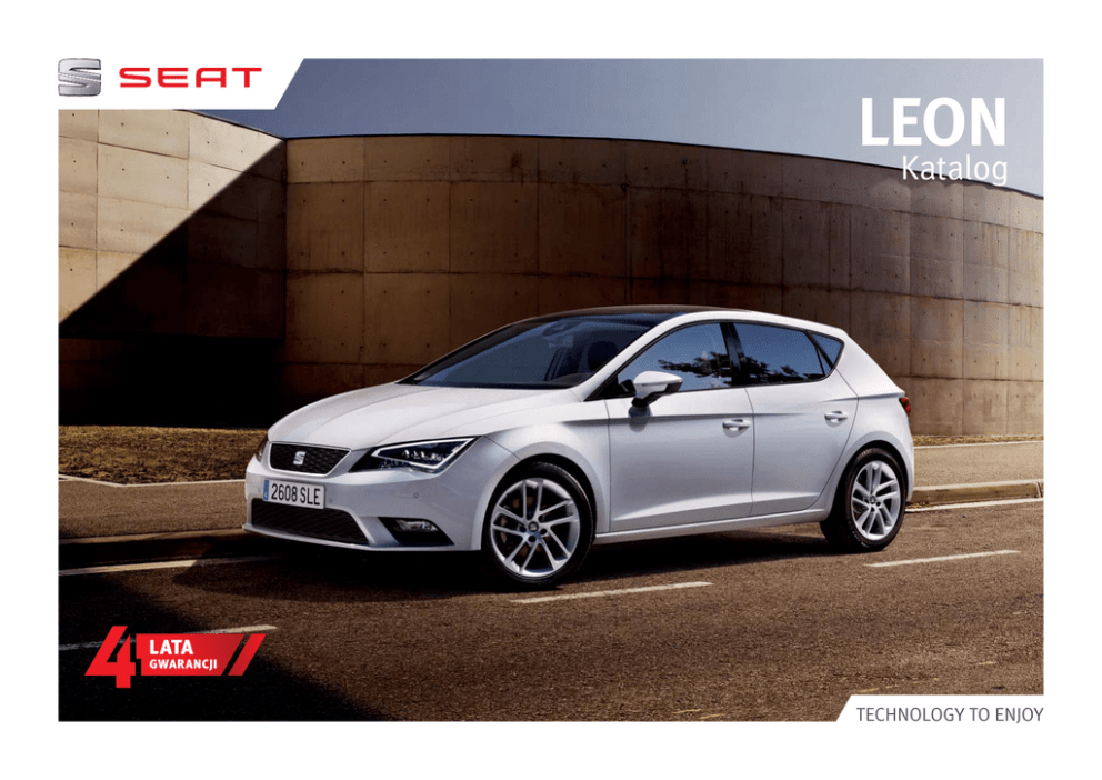 LEON Katalog TECHNOLOGY TO ENJOY TECHNOLOGY TO ENJOY Podstawą wszystkich naszych działań jest wiara, że zaawansowana technologia powinna być dostępna dla wszystkich. Wierzymy, że uczyni to świat lepszym, dostarczającym więcej satysfakcji miejscem. Naszym celem jest by wszystko co tworzymy, kierowało Cię w stronę lepszego życia. Nigdzie nie jest to lepiej wyrażone niż w modelach Leon. Dynamiczny design, najbardziej zaawansowana technologia, najwyższe bezpieczeństwo, do tego emocjonujące wrażenia z jazdy. To fundament, na którym zbudowaliśmy Leona. LEON SC LEON 5D LEON ST LEON 5D NADAJEMY SENS STYLISTYCE SEAT Leon został zaprojektowany na nowo, od samych podstaw. Inżynieryjna doskonałość i najbardziej zaawansowana technologia gwarantuje wyjątkową przyjemność z jazdy. Dzięki charakterystycznym załamaniom sylwetki Leon 5D może pochwalić się sportową, aerodynamiczną linią, która idealnie współgra z jego precyzyjnym prowadzeniem. Ostre kąty gładko stapiają się z zaokrąglonymi bokami i delikatnymi liniami, nadając mu odważnego charakteru. Sylwetka Leona błyszczy w słońcu i odzwierciedla ducha, którego oczekujesz od samochodu marki SEAT. Leon 5D daje pełny wyraz naszej filozofii opartej na dynamice, designie i technologii. Tak w systemie EasyConnect kontrolującym systemy rozrywki, komunikacji i jazdy poprzez ekran dotykowy, jak również SEAT Drive Profile, który pozwala dostosować tryb jazdy do Twojego nastroju. Samochód jest dostępny z szeroką gamą wydajnych i dynamicznych silników. Tutaj każdy szczegół podporządkowany jest Twojej przyjemności. LEON 5D LEON SC DYNAMICZNA JAZDA W DYNAMICZNYM ŻYCIU Stworzony dla obdarzonych sportowym duchem - SEAT Leon Sport Coupe. Leon SC posiada najlepsze cechy gamy modelowej Leon, w której wyróżnia się jeszcze lepszą zwrotnością i zdolnością do bardziej dynamicznej jazdy. Zwinność to umiejętność poruszania się – połączenie równowagi, koordynacji, szybkości, refleksu, siły i wytrzymałości. Najlepszym miejscem na odzwierciedlenie tych cech jest naszym zdaniem Twój samochód. Dlatego rozstaw osi w Leonie SC jest krótszy niż w standardowym Leonie, dzięki czemu podwozie jest bardziej dynamiczne, a auto bardziej czułe. Podobnie jak standardowy Leon, również Leon SC posiada jeden z najlepszych systemów dźwiękowych w swojej klasie. Jest również wyposażony w technologię zwiększającą poziom bezpieczeństwa, np. w System Rozpoznawania Zmęczenia, który pomoże Ci utrzymać koncentrację, a także w System Rozpoznawania Znaków drogowych, informujący o aktualnych znakach drogowych. A gdyby to nie wystarczyło, auto posiada automatyczną skrzynię biegów DSG z łopatkami zmiany biegów przy kierownicy, co sprawia, że sportowa jazda jest zawsze w zasięgu ręki. Witaj w świecie dynamicznej i ekscytującej jazdy! LEON SC KOMFORTOWE WNĘTRZE Chcieliśmy, żeby Leon był czymś więcej niż samochodem. Chcieliśmy, żeby był doznaniem. Dlatego właśnie każdy element wyposażenia jest wykonany według najwyższych standardów. Od ergonomicznych foteli, wymodelowanej deski rozdzielczej, do chromowanych klamek i kierownicy obszytej skórą. Wszystko w Leonie zachwyca jakością. Leon SC cechuje się również węższym rozstawem osi dla bardziej imponujących proporcji sylwetki, a także podwójnym dnem bagażnika w celu zapewnienia Ci niespotykanej przestrzeni. Oferowana gama tapicerek obejmuje Alcantarę, beżową skórę*, materiał czarny oraz czarno-szary. Dodatkową nutę unikalności zapewnia pakiet podświetlenia wnętrza LED obejmujący oświetlenie sufitowe (przednie i tylne), oświetlenie przestrzeni na nogi, światełka przy lusterkach w osłonach przeciwsłonecznych oraz oświetlenie bagażnika – wszystko w technologii LED. Znajdziesz tutaj również zaawansowane technologicznie systemy oferujące bieżące informacje i rozrywkę. Leon SC charakteryzuje się sportowymi fotelami w standardzie, w różnych wersjach wyposażenia. * Niedostępne dla Leona SC. LEON ST FUNKCJONALNOŚĆ I SPORTOWY CHARAKTER Nigdy nie możemy być pewni, czym zaskoczy nas życie, dlatego podstawą nowego SEAT-a Leona ST jest uniwersalność. Wersja kombi zapewnia optymalnie dużo przestrzeni, a nowoczesna technologia w połączeniu z wyjątkowym designem sprawiają, że każda podróż będzie pełna niezapomnianych wrażeń. Nowy SEAT Leon ST wyróżnia się dynamizmem i zapewnia pełen komfort jazdy. Bez względu na to, czy przemieszczasz się po mieście czy wyruszasz ku nowej przygodzie. Ten samochód sprawdzi się na każdej, nawet najtrudniejszej trasie. Leon ST posiada imponujący bagażnik o pojemności 587 litrów, który przy użyciu jednego przycisku powiększa się do 1470 l, dzięki innowacyjnemu systemowi łatwego składania tylnych siedzeń. Listwa załadunkowa bagażnika została pokryta chromem dla dodatkowej ochrony, a bagażnik oferuje nieograniczone możliwości dzięki wielopoziomowej konstrukcji dna. Oto SEAT Leon ST. Już nigdy więcej nie będziesz musiał wybierać między stylem i wszechstronnością. LEON ST WIĘCEJ PRZESTRZENI Każdy element SEAT-a Leon ST został zaprojektowany tak, aby maksymalnie wykorzystać 587 litów przestrzeni bagażowej. Bagażnik jest wyposażony w podwójną podłogę, którą można łatwo regulować za pomocą zarówno półki, jak i wkładki znajdującej się pod spodem. Półkę można łatwo umieścić pod wkładką, gdy nie jest używana – zwiększa to dostępną przestrzeń do 687 litrów. Dzięki możliwości otwarcia środka tylnej kanapy możesz w łatwy sposób przechowywać lub przewozić długie przedmioty. A jeśli potrzebujesz dodatkowej ŁADOWNOŚĆ DO 1470 L, SIATKA ODDZIELAJĄCA. przestrzeni, system łatwego składania tylnych siedzeń umożliwia szybkie złożenie całości lub części tylnej kanapy. Z kolei siatka zagwarantuje, że Twoje rzeczy pozostaną na swoim miejscu. Teraz możesz w pełni 