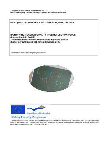 128960-CP-1-2006-NL-COMENIUS-C21 ITQ – Identifying Teacher Quality: Toolbox for teacher reflection NARZĘDZIA DO REFLEKSJI NAD JAKOŚCIĄ NAUCZYCIELA IDENTIFYING TEACHER QUALITY (ITQ): REFLECTION TOOLS (translation into Polish) Translated by Elzbieta Putkiewicz and Krystyna Salitra ([email protected], [email protected]) Avaialble on www.teacherqualitytoolbox.eu This project has been funded with support from the European Commission. This publication [communication] reflects the views only of the author, and the Commission cannot be held responsible for any use which may be made of the information contained therein. NARZĘDZIA DO REFLEKSJI NAD JAKOŚCIĄ NAUCZYCIELA Identifying Teacher Quality REFLEKSJA O JAKOŚCI PRACY NAUCZYCIELA NA PODSTAWIE LEKTURY FORMALNYCH DOKUMENTÓW .......................................................................................3 OBSERWACJA FILMU - Różnorodna praktyka................................................................12 OBSERWACJA FILMU - Nauka na świeżym powietrzu.....................................................26 MÓJ NADZWYCZAJNY NAUCZYCIEL .............................................................................33 REFLEKSJA PRZY UŻYCIU OBRAZKÓW........................................................................37 REFLEKSJA Z WYKORZYSTANIEM FILMÓW.................................................................40 128960-CP-1-2006-NL-COMENIUS-C21 2 NARZĘDZIA DO REFLEKSJI NAD JAKOŚCIĄ NAUCZYCIELA Identifying Teacher Quality REFLEKSJA O JAKOŚCI PRACY NAUCZYCIELA PODSTAWIE LEKTURY FORMALNYCH DOKUMENTÓW NA Cele zajeć Intencją Autorów jest pobudzenie uczestników do refleksji nad własnymi, nieformalnymi modelami kompetencji i kwalifikacji nauczycielskich porównując je z modelami prezentowanymi w dokumentach rządowych poszczególnych państw oraz w wybranych dokumentach europejskich. Celem zajęć jest pomoc uczestnikom w uświadomieniu posiadanej przez nich ukrytej wiedzy, subiektywnych teorii dotyczących profesji nauczycielskiej, kompetencji i kwalifikacji nauczycieli, przemyśleniu, przeformułowaniu własnych przekonań w toku lektury i dyskusji treści wybranych rządowych oraz europejskich dokumentów1. Nadrzędnym celem zajęć2 jest stymulacja rozwoju zawodowego uczestników zajęć. Scenariusz zajęć składa się z 5 części (kroków) obligatoryjnych i jednej części nieobligatoryjnej. Każda z części podzielona jest na fazy, w toku których uczestnicy pracując grupowo lub indywidualnie zastanawiają się nad kwalifikacjami i kompetencjami nauczycieli. Adresaci zajęć Scenariusz przygotowany jest dla rożnych grup słuchaczy: nauczycieli, edukatorów, studentów wydziałów nauczycielskich, liderów szkolnych, a także grup słuchaczy reprezentujących inne instytucje narodowe i międzynarodowe, których działalność dotyczy rozwoju profesji nauczycielskiej. Liczebność grup: 8 – 20 osób. Część (Krok) A: identyfikacja osobistych wartości i prekoncepcji (subiektywnych teorii) dobrego nauczyciela . Korzystając z odtworzonego obrazu dobrego nauczyciela, którego uczestnicy spotkali na swojej drodze edukacyjnej, korzystając z „ mind mappingu” bądź metody zdań niedokończonych uczestnicy tworzą definicję dobrego nauczyciela. Mają okazję przemyślenia własnego spojrzenia na jego kwalifikacje i kompetencje. Czas: 1,5 godziny Wersja 1 scenariusza Opis: Część A składa się z 5 faz. 1 W toku zajęć testowych uczestnicy czytali i dyskutowali skróty dokumentów określających kompetencje i wymagania kwalifikacyjne nauczycieli w Polsce, Republice Czeskiej, Estonii, Holandii, Słowenii. 2 W tłumaczeniu na język polski zrezygnowano z pojęcia „a tool”, ponieważ ma jednoznacznie techniczną konotację, której chcielibyśmy uniknąć. Piszemy więc, że nadrzędnym celem zajęć, a nie stosowania narzędzia, jest stymulacja rozwoju zawodowego nauczyciela., 128960-CP-1-2006-NL-COMENIUS-C21 3 NARZĘDZIA DO REFLEKSJI NAD JAKOŚCIĄ NAUCZYCIELA Identifying Teacher Quality Faza 1: praca indywidualna (10 do 15 minut) Instrukcja: Staraj się przypomnieć sobie najlepszego nauczyciela, jakiego kiedykolwiek spotkałeś na swojej drodze edukacyjnej. Pomyśl, co uczyniło go tak dobrym, wyjątkowym. Opisz dwie sytuacje, w których uwidoczniło się jego mistrzostwo.j Bądź konkretny. Co takiego zrobił? Jak się zachowywał? Faza 2: praca w parach (10 minut) - instrukcja; Opisz swojemu partnerowi nauczyciela, którego sobie przypomniałeś. Wyjaśnij, czemu był tak dobrym nauczycielem i przedstaw jego zachowania w konkretnych sytuacjach. Posłuchaj uważnie jak opisuje swojego nauczyciela Twój partner. Porównajcie cechy swoich nauczycieli, ich wiedzę, umiejętności i postawy/wartości jakimi się kierowali. Omówcie wystepujace miedzy nimi podobieństwa oraz różnice. Faza 3: praca w grupach cztero-osobowych (20 minut) - instrukcja: Każdy członek grupy opisuje innym najważniejsze cechy, umiejetnosci, postawy/wartości wybranego przez siebie nauczyciela. Spróbujcie znaleźć wspólne cechy, wiedzę, umiejętnosci i Postawy/wartości dobrego nauczyciela. Faza 4: dyskusja plenarna (20 minut) Grupy dzielą się swoimi definicjami na temat kwalifikacji i kompetencji dobrego nauczyciela. Definicje można podzielic na typy, w zależności od tego na co kładzie się głony nacisk: wiedzę, umiejętności, postawy/wartości. Faza 5: refleksje (10 min.) (dla obu wersji scenariusza) Zastanówcie się nad przebiegiem tej części zajęć. Odpowiedzcie na następujące pytania: Czy zdarzyło się coś co skłoniło cię do zmiany Twojej opinii? Czy coś wzbogaciło Twoją opinię? Uwaga: Zajecia można skrócić, omijając fazę drugą, jeżeli grupa jest duża (ponad 24 uczestników). Wersja 2 scenariusza: Zajęcia składają się także z 5 faz. W pierwszej, uczestnicy pracują indywidualnie, w drugiej w parach, w trzeciej fazie w grupach czteroosobowych lub większych. Czwarta faza stan
