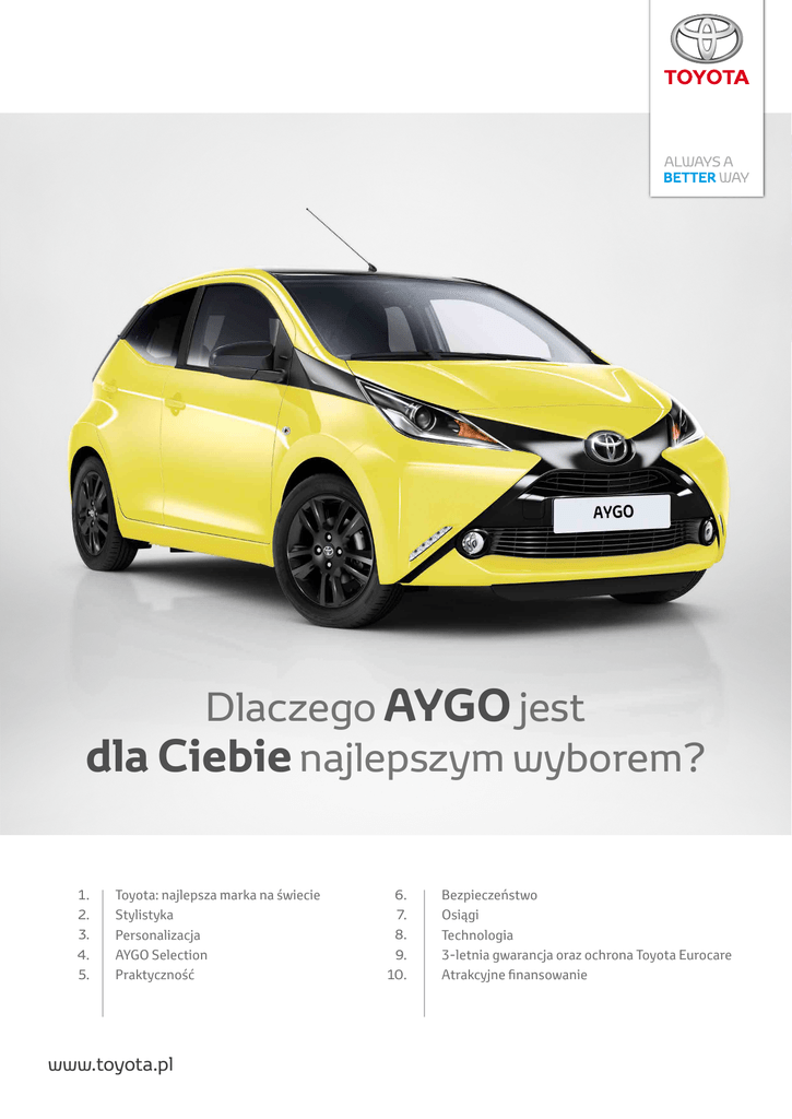 Dlaczego AYGO jest dla Ciebie najlepszym wyborem? 1. 2. 3. 4. 5. Toyota: najlepsza marka na świecie Stylistyka Personalizacja AYGO Selection Praktyczność www.toyota.pl 6. 7. 8. 9. 10. Bezpieczeństwo Osiągi Technologia 3-letnia gwarancja oraz ochrona Toyota Eurocare Atrakcyjne finansowanie 1. Toyota: najlepsza marka na świecie Wybór Toyoty jest najlepszą decyzją, jaką można podjąć przy zakupie samochodu. Powody? Nie ma drugiej tak utytułowanej, niezawodnej i innowacyjnej marki motoryzacyjnej na świecie jak Toyota. Oto kilka faktów, które mówią same za siebie. NAJBARDZIEJ WARTOŚCIOWA MARKA NA ŚWIECIE NAJWIĘKSZY PRODUCENT SAMOCHODÓW NA ŚWIECIE Od 12 lat nie ma cenniejszej marki motoryzacyjnej niż Toyota. Miejsce Miejsce w rankingu Marka Wartość (w mld dol.) 1. 6. Toyota 49,0 2. 11. BMW 37,2 12. Mercedes 36,7 3. Ponad 10 milionów aut sprzedanych w ciągu roku przez Toyota Motor Corporation – rekordowe lata 2014 i 2015. Najbardziej wartościowe marki motoryzacyjne wg raportu Best Global Brands 2015 (Interbrand). NAJBARDZIEJ INNOWACYJNE NAPĘDY TOYOTA W ŚCISŁEJ CZOŁÓWCE NAJBARDZIEJ INNOWACYJNYCH FIRM ŚWIATA Ponad 9 milionów hybryd sprzedanych na całym świecie od premiery Priusa w 1997 r. Miejsce w rankingu Marka Ponad 1400 patentów w latach 2010–2015 dotyczących 1. Apple 2. Google innowacyjnej technologii autonomicznego prowadzenia pojazdów i 5680 patentów dotyczących technologii wodorowych ogniw paliwowych. 3. Tesla Motors 4. Microsoft Corp 5. Samsung Group 6. Toyota Najbardziej innowacyjne marki wg rankingu The Boston Consulting Group 2015. NAJBARDZIEJ NIEZAWODNE SAMOCHODY NA ŚWIECIE Liczba modeli w pierwszych dziesiątkach rankingu TÜV 2016: 14 10 7 a es ot rced y To Me 6 di Au M da az 5 he sc r Po 3 2 VW O 2 l pe 1 W BM rd Fo 1 a nd Ho Toyota Mirai Pierwsze masowo produkowane auto napędzane wodorowymi ogniwami paliwowymi. 2. Stylistyka AYGO pozostaje wierne nurtowi stylistycznemu Toyoty – keen look – jednak rozwija go w nowatorski, nietuzinkowy sposób, stając się samochodem niepowtarzalnym w każdym calu. Poprzez umiejętne zabiegi stylistyczne AYGO sprawia wrażenie będącego w ruchu nawet wtedy, gdy stoi zaparkowane. • Motyw odwróconego trapezu widoczny zarówno z przodu w kształcie wlotu powietrza, jak i z tyłu w liniach dyfuzora. • Kształt X poprowadzony od przodu i grilla poprzez reflektory aż do przednich słupków. • Projektorowe lampy główne świecące bardziej równomiernym, dłuższym i nierozproszonym snopem światła. • Doskonale widoczne, energooszczędne standardowe światła do jazdy dziennej typu LED. • Dynamicznie unosząca się linia szyb bocznych i opadająca linia dachu. • Wystarczająca ilość przestrzeni w kabinie dla czterech osób, również nad głową, przy znakomitym współczynniku oporu powietrza Cx wynoszącym 0,29. • Dynamiczne zwieńczenie znakomitej sylwetki za sprawą tylnego dyfuzora, wysoko poprowadzonych świateł i spojlera. 3. Personalizacja Toyota AYGO otworzyła nowy rozdział w kategorii personalizacji. Dzięki bogatej ofercie pakietów wyposażeniowych oraz dodatków stylistycznych każdy może wyrazić siebie na setki sposobów. Do dyspozycji: • 8 wersji kolorystycznych x-grilla i bocznych listew, • 8 wersji kolorystycznych tylnego dyfuzora, • 7 wersji kolorystycznych dachu, a także możliwość zamówienia opcjonalnego dachu składanego, • 7 wersji opcjonalnych zestawów ozdobnych naklejek na dach, maskę, błotniki i drzwi boczne, • 21 wzorów kół, a także 12 wersji kolorystycznych kołpaków środkowych na felgi i 8 wersji pierścieni ozdobnych na felgi, • 8 kolorów nadwozia, • 8 wersji kolorystycznych konsoli centralnej, paneli deski rozdzielczej, obudowy dźwigni zmiany biegów i wlotów powietrza. 4. AYGO SELECTION X-clusiv Specjalnie dla Ciebie – 15" felgi 10-ramienne w czarnym połysku z kołpakami środkowymi w kolorze Mambo Red, czerwona okleina dachowa oraz zestaw czerwonych oklein na przednim i tylnym zderzaku, czerwone listwy boczne, a także nakładki na lusterka boczne w czarnym połysku. Pakiet dostępny dla wersji X-play w nadwoziu 5-drzwiowym. X-treme Stawiaj czoła kolejnym wyzwaniom, mając przy sobie AYGO w metalizowanym kolorze Smokey Ice z czarnym x-grillem oraz 15" felgami w czarnym połysku i pierścieniami ozdobnymi w kolorze Mambo Red, a także z zestawem czerwonych oklein na przednim i tylnym zderzaku, czerwonymi listwami bocznymi i nakładkami na lusterka boczne w czerwonym połysku. Pakiet dostępny dla wersji X-play w nadwoziu 5-drzwiowym. X-pressive Nie oglądaj się na innych, teraz masz AYGO z metalizowanym lakierem Blue Velvet, przednim x-grillem i listwami przedłużającymi w kolorze Forever White, białymi nakładkami na lusterka oraz białymi szlifowanymi felgami 15" z kołpakami środkowymi także w kolorze Blue Velvet. Pakiet dostępny dla wersji X-play w nadwoziu 5-drzwiowym. X-travagant Rozkręć się, jadąc AYGO z lakierem Orange Twist, czarnymi 15" felgami i kołpakami środkowymi w kolorze Orange Twist oraz czarnym x-grillem i nakładkami na lusterka boczne w czarnym połysku. Niech patrzą! Pakiet dostępny dla wersji X-play w nadwoziu 5-drzwiowym. 5. Praktyczność Toyota AYGO dzięki najbardziej kompaktowym wymiarom oraz niewielkiemu promieniowi zawracania (4,7 m) jest idealnym samochodem do poruszania się po miejskich, zatłoczonych ulicach. Niewielkie wymiary zewnętrzne nie ograniczają kubatury wnętrza – kierowca i pasażerowie nie dość, że podróżują w wyjątkowo komfortowych warunkach, to mają przy tym wystarczająco dużo miejsca na bagaż. 6. Bezpieczeństwo AYGO imponuje także w kwestii bezpieczeństwa, a wiele nowoczesnych rozwiązań technologicznych, zarówno wśród systemów bezpieczeństwa czynnego, jak i biernego, daje prawdziwy powód do dumy: 4 gwiazdki w nowych bardziej restrykcyjnych testach zderzeniowych Euro NCAP. Toyota AYGO – jako jedyne w klasie – już w standa