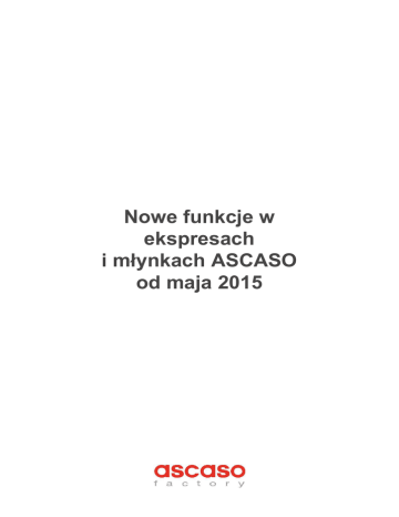 Nowe funkcje w ekspresach i młynkach ASCASO od maja 2015 System wyjmowanego uchwytu filtra Ujednolicony system na kawę świeżo mieloną z młynka z systemem wszechstronnym (versatile). Wszystkie ekspresy będą produkowane z systemem wszechstronnym, z pięcioma filtrami. Wszystkie elementy do konwersji zostały wyeliminowane. • 2 filtry do espresso. Dla posiadaczy młynka do kawy lub prawidłowo zmielonej kawy. • 2 filtry ciśnieniowe. Dla standardowych lub supermarketowych mielonych kaw. Filtry te są ulepszone w stosunku do poprzednich wersji. • 1 filtr do saszetek pod (ESE). Nowy zespół grupy kawowej. 100% mosiężny odlew. Górna komora dozowania zawsze będzie płaska, gwarantując lepsze dozowanie we wszystkich przypadkach. 3-letnia gwarancja dla grupy kawowej. Szeroki asortyment ekspresów domowego użytku będzie wyposażany wyłącznie w grupę kawową z aluminiowym termoblokiem + stal nierdzewna. Ekstremalnie niezawodna grupa. Tylko w ekspresach Dream: Kolory i tekstury Biały kolor będzie teksturowany. Ze względu na małą ilośc zamówień kolory Cow (krowa) i Love is In the Air nie będą już produkowane. STEEL PROF System wyjmowanego uchwytu filtra. Seria STEEL, system wyjmowanego uchwytu filtra, będzie produkowana tylko z bojlerem PROF (325 cc). Oferujemy w 100% uniwersalny system. Ujednolicony system na kawę świeżo mieloną z młynka z systemem wszechstronnym (versatile). Ekspresy będą produkowane z systemem wszechstronnym, z pięcioma filtrami. Wszystkie elementy do konwersji zostały wyeliminowane. • 2 filtry do espresso. Dla posiadaczy młynka lub prawidłowo zmielonej kawy. • 2 filtry ciśnieniowe. Dla standardowych lub supermarketowych mielonych kaw. Filtry te są ulepszone w stosunku do poprzednich wersji. • 1 filtr do saszetek pod (ESE). WSPÓLNIE DLA EKSPRESÓW DOMOWYCH I MODELI STEEL LGB Certyfikat bezpiecznej żywności Wszystkie nasze maszyny są zgodne z niemieckimi standardami żywności (najsurowszymi w UE), zgodnie z parametrami określonymi w przepisach europejskich: UNE-EN 13130 – 2005 ‘Materiały I wyroby do kontaktu z żywnością’ UNE-EN ISO 17294 – 2005 ‘Jakość wody’ Pracowaliśmy na każdy składnik, aby zapewnić maszynę zgodną z przepisami. W szczególności w zakresie korzystania z bezołowiowego mosiądzu w uchwycie grupy i filtrów. Oznacza to wzrost cen, ale powody prawne i etyczne zmusiły nas do tego. Udoskonalony zawór pary Nastąpiła poprawa w 2013 roku, ale chcieliśmy zaworu pary wyjątkowej jakości. Bardzo trwały. Prosty i tani do naprawy. Filtry Cały nasz asortyment jest wyposażony w wysokiej jakości filtry do kawy. Dobrze wytwarzany filtr ujednolicony, okrągłe otwory, wszystkie o tej samej wielkości. Dają one stałe, jednolite dozowanie. Ma to na celu uproszczenie przygotowania espresso i możliwie maksymalne zmniejszenie drobin zmielonej kawy w napoju. Nasz system produkcyjny gwarantuje maksymalną tolerancję 0,02 mm różnicy między jednym a drugim otworem. System stałego uchwytu filtra Szeroki asortyment ekspresów do domu będzie wyposażony wyłącznie w grupy kawowe z termoblokiem aluminium + stal nierdzewna. Niezawodna grupa. Grupa z termoblokiem "tylko aluminium" nie będzie kontynuowana w produkcji. Ceny były przez długi czas utrzymywane tak niskie jak to możliwe, ale różnica jest minimalna. KAP Już w produkcji. Maszyna KAP do kapsułek z automatycznym wysuwem kapsułek. Produkowane wyłącznie z naszą grupą z termoblokiem aluminium + stal nierdzewna (3letnia gwarancja). Idealna maszyna do użytku domowego (niska konsumpcja). Ale przede wszystkim dla biur i punktów z umiarkowaną i średnią konsumpcją. Produkt o profilu profesjonalnym. 3 modele. W kolorach czarnym I białym. • Pół-automatyczny (kawa). • Automatyczny (kawa). Termostat elektroniczny w standardzie. • Automatyczny (kawa + woda + para). Termostat elektroniczny w standardzie. BARISTA Certyfikat bezpiecznej żywności Wszystkie nasze maszyny są zgodne z niemieckimi standardami żywności (najsurowszymi w UE), zgodnie z parametrami określonymi w przepisach europejskich: UNE-EN 13130 – 2005 ‘Materiały I wyroby do kontaktu z żywnością’ UNE-EN ISO 17294 – 2005 ‘Jakość wody’ Pracowaliśmy na każdy składnik, aby zapewnić maszynę zgodną z przepisami. W szczególności w zakresie korzystania z bezołowiowego mosiądzu w uchwycie grupy i filtrów. Oznacza to wzrost cen, ale powody prawne i etyczne zmusiły nas do tego. Przeprojektowana płyta przednia I obręcz dla przestrzeni podgrzewacza filiżanek. Nowoczesny, bardziej minimalistyczny wygląd. Regulowane nóżki ze stali nierdzewnej (60 mm średnicy) Będziemy używać szerszych nóżek niż w poprzednich wersjach dając maszynie bardziej trwały wygląd i zaznaczając jej obecność. Główne przełączniki Bremas, z pokrywą ochronną. Nowy podwójny manometr ze stali nierdzewnej Łatwiejszy do demontażu niż poprzedni. R.P.M. silnik Maksymalna moc I niezawodność. Zaprojektowany do wysokiej konsumpcji. 165 W na 2 grupy. 265 W w 3 grupach. Diody LED Poprawiliśmy jakość naszych diod LED. Będą cechą charakterystyczną naszych maszyn. Wyprodukowane w Barcelonie, z pełną gwarancją. R.P.M. silnik PROCON pompa ze stali nierdzewnej BAR Regulowane nóżki ze stali nierdzewnej (o dużej średnicy 60 mm) będą standardowym elementem w całej linii. Wszystkie maszyny z tej serii wyposażone będą w miedziane lub metalowe rurki (rurki z PFTE nie będą już używane). Materiał o wyższej wytrzymałości mechanicznej i optymalny dla wysokiej i niskiej konsumpcji. WSPÓLNIE DLA BARISTA / BAR 20 lat gwarancji na wszystkie bojlery ze stali nierdzewnej (nie dotyczy grzałek). MŁYNKI DO KAWY Nowy lejek wysypu w modelach isteel, i1 oraz i2 Z chromowanego znalu. Znacznie wyższej jakości niż w poprzedniej wersji i dużo lepszy wygląd. Poprawa kontroli regulacji we wszystkich modelach i1 Młynek posiada wbudowane ograniczniki