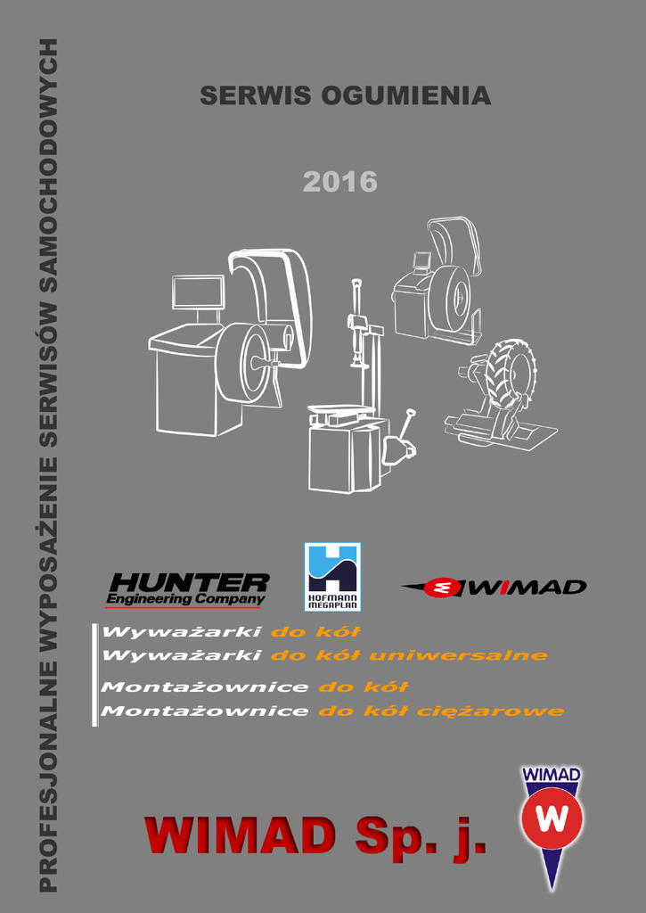 PROFESJONALNE WYPOSAŻENIE SERWISÓW SAMOCHODOWYCH SERWIS OGUMIENIA 2016 Wyważarki do kół Wyważarki do kół uniwersalne Montażownice do kół Montażownice do kół ciężarowe SPIS TREŚCI WYWAŻARKI DO KÓŁ Wyważarki do kół HUNTER GSP Wyważarki do kół HUNTER GSP - opcje 1 2 3 Wyważarki do kół diagnostyczne HUNTER RFT 5 Wyważarki do kół diagnostyczne HUNTER RFE 6 Wyważarki do kół diagnostyczne HUNTER RFT i RFE – opcje Wyważarki do kół HOFMANN MEGAPLAN Wyważarki do kół HOFMANN MEGAPLAN - opcje Wyważarki do kół WIMAD Wyważarki do kół WIMAD - opcje Wyważarki do kół HUNTER, HOFMANN MEGAPLAN, WIMAD – opcje HAWEKA Wyważarki do kół – dane techniczne WYWAŻARKI DO KÓŁ UNIWERSALNE Wyważarki do kół uniwersalne HUNTER GSP HD Wyważarki do kół uniwersalne HUNTER GSP HD – opcje Wyważarki do kół uniwersalne HOFMANN MEGAPLAN Wyważarki do kół uniwersalne HOFMANN MEGAPLAN – opcje Wyważarki do kół uniwersalne HUNTER, HOFMANN MEGAPLAN – opcje HAWEKA Wyważarki do kół uniwersalne – dane techniczne MONTAŻOWNICE DO KÓŁ 7 8 10 11 12 13 14 15 16 16 18 19 20 21 22 Montażownice do kół HUNTER serii TCX 50 23 Montażownice do kół HUNTER serii TCX 500 24 Montażownice do kół HUNTER serii TCX – opcje 25 Montażownice do kół HUNTER serii TCA 26 Montażownice do kół HUNTER serii TCR 27 Montażownice do kół HUNTER serii TCR – opcje 28 Montażownice do kół HOFMANN MEGAPLAN serii 303 i 503 29 Montażownice do kół HOFMANN MEGAPLAN serii 603 30 Montażownice do kół HOFMANN MEGAPLAN serii 703 31 Montażownice do kół HOFMANN MEGAPLAN serii Smart 32 Montażownice do kół HOFMANN MEGAPLAN – warianty kolorystyczne Montażownice do kół HOFMANN MEGAPLAN i WIMAD – opcje fabryczne Montażownice do kół HOFMANN MEGAPLAN i WIMAD – opcje Montażownice do kół WIMAD (opcje – patrz HOFMANN MEGAPLAN – str. 31) Montażownice do kół – dane techniczne MONTAŻOWNICE DO KÓŁ CIĘŻAROWE 33 33 33 37 38 39 Montażownice do kół ciężarowe HOFMANN MEGAPLAN 40 Montażownice do kół ciężarowe mobilne HOFMANN MEGAPLAN 41 Montażownice do kół ciężarowe HOFMANN MEGAPLAN – opcje Montażownice do kół ciężarowe – dane techniczne 42 44 WYWAŻARKI DO KÓŁ G GS SP P -- G Grra ap ph hiicc S Siig gn na all P Prro occe esssso orr ® ® R RF FT T -- R Ro oa ad dF Fo orrcce eT To ou ucch h M Me eg ga assp piin n W WIIM MA AD DW W WYWAŻARKI DO KÓŁ WIMAD Wyposażanie serwisów samochodowych Wyważarki do kół HUNTER GSP Wyważarki do kół serii GSP 9200 przeznaczone są do wyważania kół z uwzględnieniem sił niewyważenia statycznego oraz - niezależnie - sił niewyważenia dynamicznego. Kod Zdjęcie Aprobata Opis Wyważarka do kół HUNTER GSP 9200 Touch® seria GSP 9200 TOUCH Wyposażenie standardowe: monitor dotykowy LCD, dolny laserowy znacznik mocowania ciężarka, Inner Dataset® wewnętrzne ramię pomiarowe, Outer Dataset® zewnętrzne ramię pomiarowe, SmartWeight® minimalizacja zużycia ciężarków, Centering Check® sprawdzenie centrowania koła, SplitWeight® podział i chowanie ciężarka za ramiona felgi, SmartSpoke® wskazanie optymalnego umieszczenia jednego klejonego ciężarka za ramieniem obręczy zamiast kilku. eCal™ prawdziwa automatyczna kalibracja wyważarki, TPMSpec® dane do obsługi czujników TPMS, ServoDrive + ServoStop automatyczne pozycjonowanie koła, TruWeight® precyzyjne umieszczanie ciężarków, nożny hamulec koła, automatyczne wykrywanie trybu wyważania, filmy i animacje instruktażowe. GSP 9222 TOUCH tradycyjna nakrętka GSP 9223 TOUCH VAS 6533A SpeedClamp® pneumatyczny uchwyt szybkomocujący. WWW.WIMAD.COM.PL Strona 2/44 TEL./FAX: 71 346 66 26 Publikacja ta nie stanowi oferty w rozumieniu prawa i ma charakter informacyjny. Zastrzegamy sobie prawo do zmian w zakresie modyfikacji produktów. Kolory przedstawione mogą różnić się od oryginałów. Za ewentualne błędy w druku firma nie ponosi odpowiedzialności. WIMAD Wyposażanie serwisów samochodowych Wyważarki do kół HUNTER GSP - opcje Kod Zdjęcie Opis 20-3101-1 Dźwignik koła 20-2166-1 Pozycjonowanie laserowe ciężarków HammerHead™ HPDJGSPPA Drukarka HP DJ GSPPA Model przykładowy 20-2714-1 140 408 022 Szafka boczna pod drukarkę Nakrętka Pro-Grip Stożki 3 Stożki - 3 szt. Stożki 7 Stożki - 7 szt. WWW.WIMAD.COM.PL Strona 3/44 TEL./FAX: 71 346 66 26 Publikacja ta nie stanowi oferty w rozumieniu prawa i ma charakter informacyjny. Zastrzegamy sobie prawo do zmian w zakresie modyfikacji produktów. Kolory przedstawione mogą różnić się od oryginałów. Za ewentualne błędy w druku firma nie ponosi odpowiedzialności. WIMAD Wyposażanie serwisów samochodowych Wyważarki do kół HUNTER GSP – opcje (cd.) Kod Zdjęcie Stożki 10 56-47-3 Opis Stożki - 10 szt. Szafka na zestawy tulei Direct i stożków 20-2031-1 Zestaw centrujący Porsche 20-1846-1 Zestaw stożków i tulei Direct (do sam. dostawczych) 9 szt. 91-131 mm 20-1845-1 Zestaw stożków i tulei Direct (do sam. osobowych) 9 szt. 53-90 mm 405 400 108 Uchwyt UNI-LUG do felg nieprzelotowych Zobacz też: opcje HAWEKA - str. 13 WWW.WIMAD.COM.PL Strona 4/44 TEL./FAX: 71 346 66 26 Publikacja ta nie stanowi oferty w rozumieniu prawa i ma charakter informacyjny. Zastrzegamy sobie prawo do zmian w zakresie modyfikacji produktów. Kolory przedstawione mogą różnić się od oryginałów. Za ewentualne błędy w druku firma nie ponosi odpowiedzialności. WIMAD Wyposażanie serwisów samochodowych Wyważarki do kół diagnostyczne HUNTER RFT Wyważarka HUNTER Road Force Touch® wyposażona jest w rolkę do przeprowadzania testu drogowego. Dzięki temu stanowi kompletny system do pomiaru wibracji koła. W trakcie testu koło poddawane jest oddziaływaniom rolki z naciskiem 5560 N, podobnym do rzeczywistych panujących podczas jazdy samochodem. Dzięki temu możliwe jest wykrycie wszelkich nierównomierności w elastyczności opony na jej obwodzie (wad fabryczny
