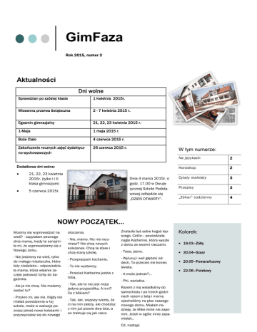 GimFaza Rok 2015, numer 2 Aktualności Dni wolne Sprawdzian po szóstej klasie 1 kwietnia 2015r. Wiosenna przerwa świąteczna 2 - 7 kwietnia 2015 r. Egzamin gimnazjalny 21, 22, 23 kwietnia 2015 r. 1-Maja 1 maja 2015 r. Boże Ciało 4 czerwca 2015 r. Zakończenie rocznych zajęć dydaktyczno-wychowawczych 26 czerwca 2015 r. W tym numerze: Dodatkowe dni wolne: 21, 22, 23 kwietnia 2015r. (tylko I i II klasa gimnazjum) Dnia 4 marca 2015r. o godz. 17.00 w Dwujęzycznej Szkole Podstawowej odbędzie się „DZIEŃ OTWARTY”. 5 czerwca 2015r. Na językach 2 Horoskop 2 Cytaty małolaty 3 Przepisy 3 „Zóhar” codzienny 4 NOWY POCZĄTEK... Musimy się wyprowadzać na wieś? - zapytałam pewnego dnia mamę, kiedy ta oznajmiła mi, że wyprowadzamy się z Nowego Jorku. - Nie jedziemy na wieś, tylko do małego miasteczka, które leży niedaleko— odpowiedziała mama, która właśnie zaczęła pakować torby do bagażnika. otoczenia. - Nie, mamo. Nic nie rozumiesz? Nie chcę nowych koleżanek. Chcę te stare i chcę starą szkołę. - Przepraszam kochanie. - To nie wystarczy. - Przecież Katherine jedzie z tobą. - Ale ja nie chcę. Nie możemy zostać tu? - Tak, ale to nie jest moja jedyna przyjaciółka. A inni? Co z Mikiem? - Przykro mi, ale nie. Nigdy nie miałaś powodzenia w tej szkole, może w wakacje poznasz jakieś nowe koleżanki i przyzwyczaisz się do nowego - Tak, tak, wszyscy wiemy, że ci na nim zależy, ale chodzisz z nim już prawie dwa lata, a on traktuje cię jak rzecz. Znalazła byś sobie kogoś lepszego, Catlin— powiedziała nagle Katherine, która wyszła z domu ze swoimi rzeczami. Kolorek: - Taaa, jasne. 30.04—Szary - Wyluzuj i weź głęboki oddech. To przecież nie koniec świata. 20.05—Pomarańczowy - A może jednak?... - Phi, wariatka. Razem z nią wsiadłyśmy do samochodu i po trzech godzinach razem z tatą i mamą wjechaliśmy na plac naszego nowego domu. Miałam nadzieję, że Mike mnie nie zapomni. Jeżeli w ogóle mnie zapamiętał… Cd. nastąpi 19.03—Żółty 22.06—Fioletowy GimFaza NA JĘZYKACH Pewnej nauczycielce z j. niemieckiego wyskoczył gruby, tłusty jeleń na ulicę. Pewien nauczyciel stwierdził kiedyś, że jak trafi do psychiatryka, będzie się czuł jak u siebie w pracy. A wiecie, że pewna Pani z naszej szkoły wyszła niedawno za mąż? W gimnazjum większość uczniów i nauczycieli ma ogony, nigdy nie zamykają drzwi. Czy macie buty zmienne? Jeśli nie, to zainwestujcie w skarpetki… Chyba wiecie o co chodzi? Pewna nauczycielka myślała, że zje telefon, kiedy usłyszała pewną informację. ***SENNIK*** pocałować kobietę: masz wzięcie u płci przeciwnej pocałować mężczyznę: pożegnanie z kimś starszą osobę: rozczarowanie w miłości w rękę: szczęście w miłości i przyjaźni widzieć, jak inni się całują: smutek, przygnębienie widzieć jak ukochana osoba całuje się z kimś: wielka namiętność całować ziemię: zmartwienia i upokorzenie nieśmiały pocałunek: skrywasz swoje uczucia, nie wahaj się zbyt długo, bo masz rywali otrzymać pocałunek: będziesz poważany, doceniany wymienić wiele pocałunków: dobre widoki na przyszłość Str. 2 Cytaty małolaty TEKSTY UCZNIÓW CYTATY Zamknij zimno, bo mi okno! Istnieją marzenia, które nawiedzają nas tuż po przebudzeniu. To one sprawiają, że warto żyć. Rok 2015, numer 2 To, co robię, nie musi mieć sensu dla nikogo poza mną. Na tym polega piękno szaleństwa. ~Rachel Hawthorne Wszystko jest w scenkariuszu ~Nicholas Sparks Bezpieczna przystań Mamy 2 przypadki: bierownik i celnik Każdy normalny człowiek od czasu do czasu ma ochotę kogoś zabić Właśnie mnie coś zaśmieszyło ~Julia -Co robisz? Wczoraj do Ciebie nie należy. Jutro niepewne. Tylko dziś jest Twoje. ~Jan Paweł II -Słucham Sedes -Co słuchasz?;o Nie boję się wilka, tabletek, śmierci, czterdziestu rodzajów pustej ciemności. Boję się przywyknąć. -Sedes to zespół xD (...) to, co pozostaje w pamięci, nie zawsze jest równoznaczne z tym, czego człowiek był świadkiem. ~Julian Barnes Nie każda zła noc, musi się kończyć źle... Nie każdy dobry dzień, musi się kończyć dobrze... Czy to nie dziwne, że dławi mnie żal, ponieważ inna ludzka istota nie zwróciła w moją stronę swych oczu? ~Charlotte Brontë, Shirley Przepis na… NALEŚNIKI SKŁADNIKI: 150 g mąki 2 jajka 250 ml mleka szczypta soli woda mineralna masło lub olej roślinny do smażenia WYKONANIE Mąkę przesiać, dodać jajka, mleko i sól. Zmiksować, przykryć ściereczką i odstawić na 30 minut. Przed samym smażeniem dodać do ciasta wodę w takiej ilości, aby uzyskać odpowiednią konsystencję ciasta (około 1/2 - 3/4 szklanki). Naleśniki smażyć z dwóch stron na średnio rozgrzanej patelni teflonowej z cienkim dnem, na małej ilości masła lub oleju roślinnego. Przepis na… SAŁATKĘ CEZARA SKŁADNIKI: 1 główka sałaty rzymskiej, 12 pomidorków, 100 g małych grzanek, ·4 łyżki oliwy, 2 piersi kurczaka. SOS: 4 łyżki oliwy, 1 łyżka octu winnego, 1 łyżka soku z cytryny, sól, pieprz. WYKONANIE Umyte i osuszone mięso kurczaka pokrój na małe kawałki, posyp solą i pieprzem. Na patelni rozgrzej 4 łyżki oliwy, usmaż mięso ze wszystkich stron. Zdejmij z patelni i odstaw do wystudzenia. Liście sałaty oczyść, wypłucz i dokładnie odsącz (większe liście porwij na kawałki). Przełóż do dużej salaterki. Pomidorki umyj i pokrój w ćwiartki. Do sałaty dodaj ostudzone mięso kurczaka, pomidorki i grzanki, wymieszaj. Przygotuj sos: w małej miseczce ubij trzepaczką 4 łyżki oliwy z octem winnym, sokiem z cytryny, solą i pieprzem. Wylej sos na sałatę. Całość delikatnie wymieszaj. SMACZNEGO Str. 3 Nazwa firmy Podstawowy adres służbowy 2. wiersz adresu 3. wiersz adresu 4. wiersz adresu W tym miejscu warto wstawić krótki artykuł o Twojej organizacji. Możesz umieścić w nim cel organizacji, jej misję przewodnią, datę założenia i krótką historię. M