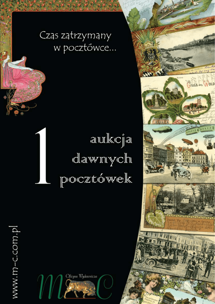 I Aukcja Dawnych Pocztówek 6 listopada 2010 Oficyna Wydawnicza M-C serdecznie zaprasza do udziału w I Aukcji Dawnych Pocztówek. Materiał aukcyjny został starannie wyselekcjonowany spośród najciekawszych, starych, oryginalnych polskich pocztówek. Część pocztówek ma także wartość filatelistyczną, zawiera ciekawe stemple. Spis treści Artystyczne......................nr 1-8 Etnografia.........................nr 9-51 Harcerstwo.......................nr 52-55 Humor...............................nr 56-58 Judaika..............................nr 59-73 Malarstwo.........................nr 74-81 Mapy..................................nr 82-85 Myślistwo..........................nr 86-89 Okolicznościowe.............nr 90-95 Patriotyczne.....................nr 96-106 Różne................................nr 107-137 Tatry..................................nr 138-150 Wojsko..............................nr 151-157 Zwierzęta..........................nr 158-161 Miasta (alfabetycznie).....nr 162-1008 ZAPRASZAMY NA NASZĄ NASTĘPNĄ AUKCJĘ POCZTÓWEK - WIOSNA 2011 Informacje o aukcji: 1. Aukcja ma charakter korespondencyjny. 2. Proponowane walory aukcyjne zostały przedstawione w formie elektronicznej na stronie internetowej www.m-c.com.pl i na płycie CD oraz w wersji drukowanej w postaci katalogu aukcyjnego. Na stronie internetowej zamieszczono zarówno przody, jak i tyły pocztówek. 3. Podane ceny są cenami wywołania. Do ceny wylicytowanej doliczana będzie opłata organizacyjna w wysokości 6%. 4. Oferty (polecenie kupna) mogą być składane w formie: elektronicznej w postaci e-maila, po wcześniejszym zalogowaniu się na stronie internetowej www.m-c.com.pl do 5 listopada 2010 r. lub faxem na numer 33 48 767 89, natomiast w przypadku ofert listownych, kierowanych na adres wydawnictwa do 4 listopada 2010 r. 5. Jeżeli na walor jest złożona tylko jedna oferta zostaje on sprzedany po cenie wywołania. W przypadku, gdy na walor jest złożonych więcej niż jedna oferta wygrywa oferent proponujący najwyższą cenę maksymalną, a wartość waloru ustalana jest na kwotę o jedno postąpienie wyższą niż druga oferta. Postąpienie jest wyznaczane jako 10% aktualnej ceny w zaokrągleniu do pełnych złotówek. W przypadku takich samych ofert, decyduje kolejność złożonych ofert. 6. Do udziału w licytacji upoważnione są osoby, które złożyły polecenie kupna w jednej z wyżej wymienionych form. Oficyna Wydawnicza M-C nie ponosi odpowiedzialności za właściwą realizację zleceń, które napłynęły po terminach określonych w punkcie nr 4. 7. W zamówieniach prosimy podać: numer pozycji oraz najwyższą oferowaną cenę (limit). Wysokość limitów, nazwiska osób lub nazwy instytucji biorących udział w licytacji są informacjami poufnymi. 8. Prosimy o przestrzeganie 7-dniowego terminu płatności od daty otrzymania faktury proforma lub informacji o zakupionych pozycjach. Po tym terminie naliczane będą ustawowe odsetki. Pocztówki wysyłamy pocztą, po wcześniejszej wpłacie na konto. Koszt przesyłki pokrywa nabywca pocztówek. Odbiór osobisty tylko po telefonicznym, wcześniejszym uzgodnieniu. Osoby odbierające pozycje osobiście zobowiązane są wykupić je w ciągu 10 dni od daty aukcji. Po tym terminie naliczane będą ustawowe odsetki. 9. Pocztówek nie wysyłamy za granicę. 10.Oficyna Wydawnicza M-C zastrzega sobie prawo wykluczenia z aukcji osób, które nie wywiązują się z przyjętych zobowiązań. 11.Biblioteka Jagiellońska i Biblioteka Narodowa mają prawo pierwokupu po cenach wylicytowanych. 12.Oficyna Wydawnicza M-C może wycofać walor z aukcji bez podania przyczyny. 13.Walory aukcyjne będzie można oglądać podczas XII Śląskiej Giełdy Kolekcjonerów w katowickim SPODKU dnia 3 października 2010 r. od godz. 8.00 do zakończenia giełdy. Opis pocztówek zawiera dane dotyczące: treści, obiegu pocztowego, ewentualnego waloru filatelistycznego, roku korespondencji lub wydania (przypuszczalnego w przypadku niektórych pocztówek), stanu zachowania (pocztówki mogą być zagięte, zabrudzone, naderwane, mieć ślady po szpilkach) oraz ceny. Pocztówki z miast zostały ułożone alfabetycznie, a tematyczne pogrupowane w kategorie. Elementy opisu pocztówki – pocztówka nie użyta w obiegu pocztowym (może być zapisana) – pocztówka z obiegu pocztowego ze znaczkiem – pocztówka z obiegu pocztowego bez znaczka (np. poczta polowa) – pocztówka z obiegu pocztowego, ale z oderwanym znaczkiem F – pocztówka z walorami filatelistycznymi (np. stempel, znaczek) (...) – nazwa w języku niemieckim [...] – wydawca pocztówki ? – nazwa miejscowości nieustalona lub budząca wątpliwości Oficyna Wydawnicza M-C ul. Konfederatów Barskich 8 43-300 Bielsko-Biała tel. 33 487 67 38, 604 306 799, fax 33 48 767 89 e-mail: [email protected] www.m-c.com.pl Konto bankowe (mBank): 57 1140 2004 0000 3702 4815 0311 tyły pocztówek można znaleźć w wersji elektronicznej katalogu na www.m-c.com.pl 2 & pieczątka instytucji ...................................dnia....................2010 r. Oficyna Wydawnicza M-C ul. Konfederatów Barskich 8 43-300 Bielsko-Biała tel. 33 487 67 38, 604 306 799, fax 33 48 767 89 e-mail: [email protected] www.m-c.com.pl Konto bankowe (mBank): 57 1140 2004 0000 3702 4815 0311 ZAMÓWIENIE na I Aukcję Dawnych Pocztówek - 6 listopada 2010 r. Imię i nazwisko/ nazwa instytucji................................................................................................................................... .............................................................................................................................................................................................. Adres.................................................................................................................................................................................... tel./fax............................................