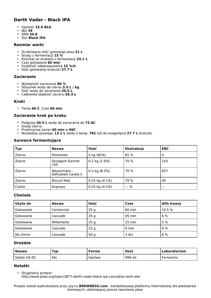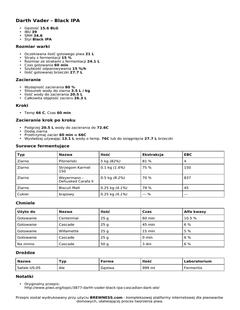 Darth Vader - Black IPA • • • • Gęstość 15.6 BLG IBU 39 SRM 34.6 Styl Black IPA Rozmiar warki • • • • • • Oczekiwana ilość gotowego piwa 21 L Straty z fermentacji 15 % Rozmiar ze stratami z fermentacji 24.1 L Czas gotowania 60 min Szybkość odparowywania 15 %/h Ilość gotowanej brzeczki 27.7 L Zacieranie • • • • Wydajność zacierania 80 % Stosunek wody do ziarna 3.5 L / kg Ilość wody do zacierania 20.5 L Całkowita objętość zacieru 26.3 L Kroki • Temp 66 C, Czas 60 min Zacieranie krok po kroku • • • • Podgrzej 20.5 L wody do zacierania do 72.6C Dodaj ziarna Przetrzymaj zacier 60 min w 66C Wysładzaj używając 13.1 L wody o temp. 76C lub do osiągnięcia 27.7 L brzeczki Surowce fermentujące Typ Nazwa Ilość Ekstrakcja EBC Ziarno Pilzneński 5 kg (82%) 81 % 4 Ziarno Strzegom Karmel 150 0.1 kg (1.6%) 75 % 150 Ziarno Weyermann Dehusked Carafa II 0.5 kg (8.2%) 70 % 837 Ziarno Biscuit Malt 0.25 kg (4.1%) 79 % 45 Cukier brązowy 0.25 kg (4.1%) --- % --- Użyto do Nazwa Ilość Czas Alfa kwasy Gotowanie Centennial 25 g 60 min 10.5 % Gotowanie Cascade 25 g 45 min 6% Gotowanie Willamette 25 g 15 min 5% Gotowanie Cascade 25 g 0 min 6% Na zimno Cascade 50 g 3 dni 6% Nazwa Typ Forma Ilość Laboratorium Safale US-05 Ale Gęstwa 999 ml Fermentis Chmiele Drożdze Notatki • Oryginalny przepis: http://www.piwo.org/topic/3877-darth-vader-black-ipa-cascadian-dark-ale/ Przepis został wydrukowany przy użyciu BREWNESS.com - kompleksowej platformy internetowej dla piwowarów domowych, ułatwiającej proces tworzenia piwa. 23 sty 2016, 18:51 Przepis został wydrukowany przy użyciu BREWNESS.com - kompleksowej platformy internetowej dla piwowarów domowych, ułatwiającej proces tworzenia piwa.