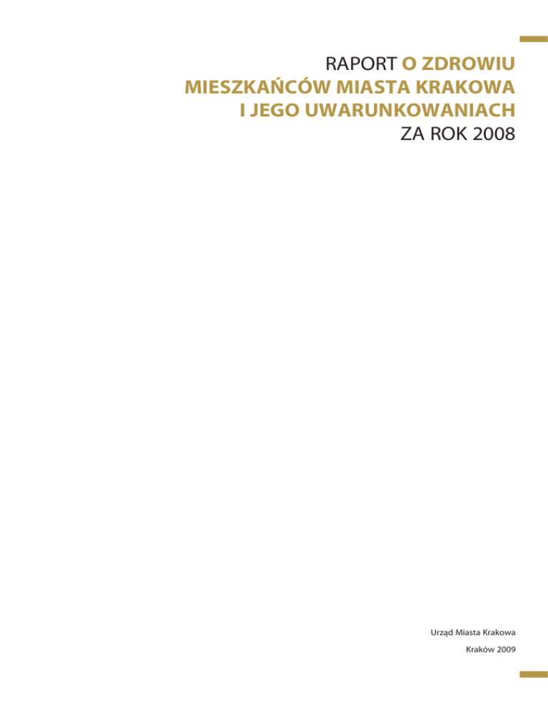 RAPORT O ZDROWIU MIESZKA¡CÓW MIASTA KRAKOWA I JEGO UWARUNKOWANIACH ZA ROK 2008 Urzàd Miasta Krakowa Kraków 2009 Opracowano: Zdrowie i Zarzàdzanie sp. z o.o., ul. Sarego 16/3, 31-047 Kraków na zlecenie Biura ds. Ochrony Zdrowia Urz´du Miasta Krakowa Recenzent: dr Alicja Domaga∏a Spis treÊci Spis tabel. Spis wykresów. Spis za∏àczników. Wprowadzenie. Cz´Êç I. Mierniki stanu zdrowia mieszkaƒców Krakowa 1. Wst´p. 2. Stan ludnoÊci oraz ruch naturalny. 3. Struktura ludnoÊci wg p∏ci, wieku i grup ekonomicznych. 4. Trwanie ˝ycia. 5. Stan zdrowia na podstawie danych o umieralnoÊci. 5.1 Wspó∏czynnik umieralnoÊci niemowlàt. 5.2 Wspó∏czynnik umieralnoÊci ogólnej. 5.3 Zgony wg wieku. 5.4 Zgony wg przyczyn. 5.5 Standaryzowane wspó∏czynniki umieralnoÊci. 6. Zachorowania na choroby zakaêne. 6.1 Choroby zakaêne. 6.2 Szczepienia. 6.3 Gruêlica. 6.4 HIV/AIDS. 7. Zachorowania na nowotwory z∏oÊliwe. 8. Choroby zawodowe. 9. Niepe∏nosprawnoÊç. 9.1 Liczba osób poni˝ej 16. r.˝. 9.2 Liczba osób powy˝ej 16. r.˝. 10. Podsumowanie. Cz´Êç II. Zasoby opieki zdrowotnej w Krakowie 1. Wst´p. 2. Zasoby ochrony zdrowia. 2.1 Stacjonarna opieka zdrowotna – lecznictwo zamkni´te. a) Szpitale ogólne. b) Stacjonarne lecznictwo psychiatryczne. c) Zak∏ady opieki d∏ugoterminowej. 2.2 Podstawowa i ambulatoryjna opieka zdrowotna. 2.3 Ratownictwo medyczne. 2.4 Kadry medyczne. 2.5 Dost´pnoÊç do Êwiadczeƒ zdrowotnych w ramach lecznictwa ambulatoryjnego. 3. Podsumowanie. Cz´Êç III. Dzia∏ania Miasta w zakresie opieki zdrowotnej 1. Wst´p. 2. Dzia∏ania w stosunku do zak∏adów opieki zdrowotnej, dla których Miasto Kraków jest organem za∏o˝ycielskim. 2.1 Stacjonarna opieka zdrowotna – zrealizowane inwestycje i pozyskane Êrodki zewn´trzne. 2.2 Dzia∏ania na rzecz poprawy jakoÊci w szpitalach miejskich. a) Szpital Specjalistyczny im. Stefana ˚eromskiego w Krakowie. b) Szpital Miejski Specjalistyczny im. Gabriela Narutowicza w Krakowie. 2.3 ˚∏obki samorzàdowe Miasta Krakowa. 2.4 Opieka nad osobami w wieku podesz∏ym. 4 5 6 7 8 8 8 13 14 15 15 16 16 17 21 31 31 35 35 37 37 38 39 42 42 44 3. Dzia∏ania z zakresu profilaktyki i promocji zdrowia. 3.1 Miejskie programy zdrowotne. 3.1.1 Miejski Program Ochrony i Promocji Zdrowia. a) Program profilaktyki mia˝d˝ycy, cukrzycy typu 2 i nadciÊnienia. b) Program edukacyjno-profilaktyczny wczesnego wykrywania raka piersi. c) Program profilaktyki i wczesnego wykrywania raka szyjki macicy. d) Program wczesnego wykrywania raka jelita grubego. e) Program profilaktyki astmy i chorób alergicznych. f) Program profilaktyki wad postawy. g) Program profilaktyki próchnicy u dzieci. h) Program profilaktyki chorób tarczycy u kobiet po 40. r.˝. i) Program profilaktyki raka prostaty. j) Program szczepieƒ ochronnych przeciw grypie mieszkaƒców Krakowa powy˝ej 65. r.˝. k) Program profilaktyki i edukacji przedporodowej „Szko∏a rodzenia”. 3.1.2 Program Krakowska Sieç AED IMPULS ˚YCIA. 3.2 Dzielnicowe programy zdrowotne. 3.3 Autorskie programy zdrowotne. 3.4 Medycyna szkolna. 3.5 Inne programy zdrowotne. a) Programy zdrowotne realizowane przez Ministra Zdrowia. b) Regionalne programy zdrowotne. c) Programy realizowane przez Narodowy Fundusz Zdrowia. d) Programy Powiatowej Stacji Sanitarno – Epidemiologicznej realizowane w Krakowie. 4. Uzdrowisko Swoszowice. 5. Podsumowanie. 94 94 94 96 96 97 98 98 99 100 100 101 101 101 102 104 111 114 122 122 124 125 125 127 128 46 46 47 47 50 59 59 59 68 72 77 79 82 82 82 82 85 85 87 87 91 Podsumowanie. Za∏àczniki. Recenzja. Bibliografia. 129 133 166 167 RAPORT O STANIE ZDROWIA MIESZKA¡CÓW KRAKOWA – 2008 Spis tabel. Tabela nr I.1. Tabela nr I.2. Tabela nr I.3. Tabela nr I.4. Tabela nr I.5. Tabela nr I.6. Tabela nr I.7. Tabela nr I.8. Tabela nr I.9. Tabela nr I.10. Tabela nr I.11. Tabela nr II.1. Tabela nr II.2. Tabela nr II.3. Tabela nr II.4. Tabela nr II.5. Tabela nr II.6. Tabela nr II.7. Tabela nr II.8. Tabela nr II.9. Tabela nr II.10. Tabela nr II.11. Tabela nr II.12. Tabela nr II.13. Tabela nr II.14. Tabela nr II.15. Tabela nr II.16. Tabela nr II.17. Tabela nr II.18. Tabela nr II.19. Tabela nr II.20. Tabela nr II.21. Tabela nr II.22. 4 Podstawowe dane demograficzne w latach 2000-2008. Oczekiwana d∏ugoÊç ˝ycia wg p∏ci dla 0, 15, 30, 45 i 60 lat w 2008 r. Zgony wg przyczyn w Polsce, województwie ma∏opolskim i Krakowie w 2007 r. LiczebnoÊç i wspó∏czynniki zapadalnoÊci (na 100 tys.) na wybrane choroby zakaêne w Krakowie w latach 2002-2008. Porównanie wykonania szczepieƒ mi´dzy 2008 a 2007 rokiem w Krakowie w %. Dane dotyczàce gruêlicy w Krakowie i woj. ma∏opolskim w 2008 r. Zachorowania na nowotwory z∏oÊliwe w Krakowie i woj. ma∏opolskim wÊród m´˝czyzn w 2006 r. Zachorowania na nowotwory z∏oÊliwe w Krakowie i woj. ma∏opolskim wÊród kobiet w 2006 r. Wykaz chorób zawodowych wg jednostek chorobowych stwierdzonych w Krakowie w 2008 r. Liczba wydanych orzeczeƒ o niepe∏nosprawnoÊci wg przyczyn, p∏ci i wieku – osoby poni˝ej 16. roku ˝ycia w Krakowie w 2008 r. Liczba osób niepe∏nosprawnych powy˝ej 16. roku ˝ycia wg p∏ci i wieku w Krakowie w 2008 r. Publiczne zak∏ady stacjonarnej opieki zdrowotnej na terenie Miasta Krakowa oraz ich organy za∏o˝ycielskie. Niepubliczne zak∏ady stacjonarnej opieki zdrowotnej (szpitale) na terenie Miasta Krakowa. Publiczne i niepubliczne zak∏ady opiekuƒczo-lecznicze i hospicja na terenie Miasta Krakowa. Liczba ∏ó˝ek w publicznych szpitalach ogólnych w Krakowie w latach 2006-2008. Liczba ∏ó˝ek w publicznych szpitalach ogólnych w Krakowie podleg∏ych MON i MSWiA w latach 2006-2008. Liczba ∏ó˝ek w niepublicznych (ogólnych) zak∏adach opieki stacjonarnej w Krakowie w latach 2006-2008. Dzia∏alnoÊç ogólnych zak∏adów lecznictwa stacjonarnego w Krakowie w latach 2006-2008. Wskaêniki dzia∏alnoÊci publicznych i niepublicznych szpitali (ogólnych zak∏adów lec
