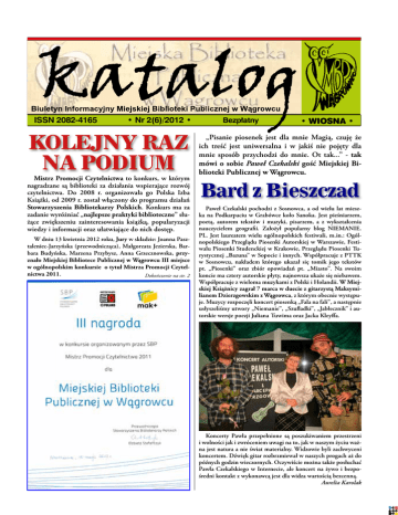 ISSN 2082-4165 • Nr 2(6)/2012 • KOLEJNY RAZ NA PODIUM Mistrz Promocji Czytelnictwa to konkurs, w którym nagradzane są biblioteki za działania wspierające rozwój czytelnictwa. Do 2008 r. organizowała go Polska Izba Książki, od 2009 r. został włączony do programu działań Stowarzyszenia Bibliotekarzy Polskich. Konkurs ma za zadanie wyróżniać „najlepsze praktyki biblioteczne” służące zwiększeniu zainteresowania książką, popularyzacji wiedzy i informacji oraz ułatwiające do nich dostęp. W dniu 13 kwietnia 2012 roku, Jury w składzie: Joanna Pasztaleniec-Jarzyńska (przewodnicząca), Małgorzata Jezierska, Barbara Budyńska, Marzena Przybysz, Anna Grzecznowska, przyznało Miejskiej Bibliotece Publicznej w Wągrowcu III miejsce w ogólnopolskim konkursie o tytuł Mistrza Promocji Czytelnictwa 2011. Dokończenie na str. 2 Bezpłatny • WIOSNA • „Pisanie piosenek jest dla mnie Magią, czuję że ich treść jest uniwersalna i w jakiś nie pojęty dla mnie sposób przychodzi do mnie. Ot tak...” - tak mówi o sobie Paweł Czekalski gość Miejskiej Biblioteki Publicznej w Wągrowcu. Bard z Bieszczad Paweł Czekalski pochodzi z Sosnowca, a od wielu lat mieszka na Podkarpaciu w Grabówce koło Sanoka. Jest pieśniarzem, poetą, autorem tekstów i muzyki, pisarzem, a z wykształcenia nauczycielem geografii. Założył popularny blog NIEMANIE. PL. Jest laureatem wielu ogólnopolskich festiwali, m.in.: Ogólnopolskiego Przeglądu Piosenki Autorskiej w Warszawie, Festiwalu Piosenki Studenckiej w Krakowie, Przeglądu Piosenki Turystycznej „Bazuna” w Sopocie i innych. Współpracuje z PTTK w Sosnowcu, nakładem którego ukazał się tomik jego tekstów pt. „Piosenki” oraz zbiór opowiadań pt. „Miasto”. Na swoim koncie ma cztery autorskie płyty, najnowsza ukaże się niebawem. Współpracuje z wieloma muzykami z Polski i Holandii. W Miejskiej Książnicy zagrał 7 marca w duecie z gitarzystą Maksymilianem Dzierzgowskim z Wągrowca, z którym obecnie występuje. Muzycy rozpoczęli koncert piosenką „Fala na fali”, a następnie usłyszeliśmy utwory „Niemanie”, „Szufladki”, „Jabłecznik” i autorskie wersje poezji Juliana Tuwima oraz Jacka Kleyffa. Koncerty Pawła przepełnione są poszukiwaniem przestrzeni i wolności jak i zwróceniem uwagi na to, jak w naszym życiu ważna jest natura a nie świat materialny. Widzowie byli zachwyceni koncertem. Dźwięk gitar rozbrzmiewał w naszych progach aż do późnych godzin wieczornych. Oczywiście można także posłuchać Pawła Czekalskiego w Internecie, ale koncert na żywo i bezpośredni kontakt z wykonawcą jest dla widza wartością bezcenną. Aurelia Karolak 2 Biuletyn Informacyjny Miejskiej Biblioteki Publicznej KOLEJNY RAZ NA PODIUM Doceniono nas za: • organizowanie wielu atrakcyjnych form popularyzacji czytelnictwa wśród wszystkich grup wiekowych: spotkania autorskie, lekcje multimedialne poświęcone historii, spotkania z poetami (cykl Seryjni Poeci), • ciekawe zajęcia przeznaczone dla najmłodszych (głośne czytanie, przedszkolaki w bibliotece, teatrzyki kukiełkowe, bajki w przychodniach dla dzieci). • organizowane konkursy: „Mistrz Recytacji”, „Z książką jak w niebie” – fotografie czytelników, Międzyszkolny Konkurs Pięknego Czytania, Wągrowieckie Dyktando, konkurs afiszy „W kręgu arcydzieł literatury polskiej”, • za akcje dzielenia się książką w urzędach, przychodniach, bankach, kinach, stacjach PKP i PKS, • realizację projektu „Czytelnik XXI wieku” motywującego do samokształcenia, skierowanego między innymi do bezrobotnych i seniorów, • organizacje imprezy podczas Święta Pieczonej Pyry”, oraz międzynarodowe spotkania esperantystów w ramach „Wielkopolskiego Esperanckiego Lata”. Jesteśmy dumni i szczęśliwi z uzyskanego tytułu, tym bardziej, że ten zaszczyt spotkał nas po raz drugi ( w 2010 roku uzyskaliśmy tytuł Mistrza Promocji Czytelnictwa 2009). Ewa Byczyńska „Mylne wzruszenia” 21. marca to długo wyczekiwany Pierwszy Dzień Wiosny, ale zarazem Światowy Dzień Poezji. I to właśnie z tej okazji co roku w Miejskiej Bibliotece Publicznej w Wągrowcu organizowany jest konkurs recytatorski. W tym roku został on poświęcony poezji Mirona Białoszewskiego, w związku z przypadającą właśnie 90. rocznicą urodzin poety. Poeta, prozaik, dramatopisarz i aktor teatralny, był jedną z najistotniejszych postaci literatury polskiej XX wieku, postacią wyjątkową i jedyną w swoim rodzaju, zarówno jeśli chodzi o poetykę, jak i filozofię życia. Poeta nieco zapomniany, ale bardzo ciekawy. Młodzież świetnie sobie poradziła z nie najłatwiejszą poezją. Zarówno dobór materiału, zrozumienie tekstu, jak i interpretacja nie sprawiły recytatorom problemu. Konkurs odbył się w dwóch kategoriach wiekowych: kl. V i VI szkoły podstawowej i młodzież szkół ponadpodstawowych. W konkursie wzięło udział 32 przedstawicieli następujących szkół: Szkoła Podstawowa nr 4 im. Marii Skłodowskiej-Curie w Wągrowcu, Zespół Szkolno-Przedszkolny w Łeknie, Gimnazjum nr 1 w Wągrowcu, Gimnazjum nr 1 Gminy Wągrowiec im. Marii Konopnickiej, Gimnazjum nr 3 Gminy Wągrowiec im. Henryka Sienkiewicza w Rąbczynie, I LO im. Powstańców Wielkopolskich w Wągrowcu, Zespół Szkół Ponadgimnazjalnych nr 2 im. ppłk. dr. Stanisława Kulińskiego w Wągrowcu. W kategorii szkół podstawowych zwycięzcą a zarazem Mistrzem Recytacji 2012 został Michał Ślązak z Zespołu Szkolno-Przedszkolnych w Łeknie, a wyróżnienie otrzymała Wiktoria Semmler ze Szkoły Podstawowej nr 4 w Wągrowcu. Wśród uczniów szkół ponadpodstawowych rywalizacja była wyjątkowo wyrównana i stała na bardzo wysokim poziomie. Po długiej debacie jury w składzie: Elżbieta Muszyńska, Bożena Skrentna, Ewa Byczyńska i Karol Kruś tytuł Mistrza Recytacji 2012 przyznało Agacie Ratajczak z Gimnazjum nr 1 Gminy Wągrowiec, II miejsce Kar