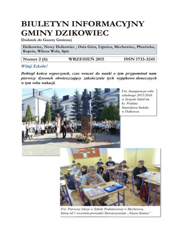 BIULETYN INFORMACYJNY GMINY DZIKOWIEC Dodatek do Gazety Gminnej Dzikowiec, Nowy Dzikowiec , Osia Góra, Lipnica, Mechowiec, Płazówka, Kopcie, Wilcza Wola, Spie Numer 2 (6) WRZESIEŃ 2015 ISSN 1733-3245 Witaj Szkoło! Dobiegł końca wypoczynek, czas wracać do nauki o tym przypominał nam pierwszy dzwonek obwieszczający zakończenie tych wyjątkowo słonecznych w tym roku wakacji. Fot. Inauguracja roku szkolnego 2015/2016 w Zespole Szkół im. ks. Prałata Stanisława Sudoła w Dzikowcu Fot. Pierwsze lekcje w Szkole Podstawowej w Mechowcu, którą od 1 września prowadzi Stowarzyszenie „Nasza Szansa” Co słychać w naszych szkołach Pierwszy dzwonek roku szkolnego 2015/2016 w Publicznej Szkole Podstawowej w Spiach i Zespole Szkolno-Przedszkolnym nr 1 w Mechowcu oznaczał początek nauki i pracy pod zarządem Stowarzyszenia Rozwoju Gminy Dzikowiec „NASZA SZANSA Z dniem 1 września 2015 r., aby nie zamknąć szkół z powodu braku pieniędzy Gmina Dzikowiec przekazała prowadzenie szkoły w Spiach oraz szkoły i przedszkola w Mechowcu stowarzyszeniu rodziców i mieszkańców wsi. Dzięki funkcjonowaniu szkół prowadzonych przez lokalne stowarzyszenie nasze szkoły mają szansę stać się wielofunkcyjnym ośrodkiem edukacji, kultury, pomocy społecznej, a nawet przedsiębiorczości, odpowiadającym na potrzeby całej społeczności wiejskiej. Stowarzyszenie może prowadzić szkoły znacznie taniej , gdyż nie obowiązują go przepisy min. karta nauczyciela i inne , które musi przestrzegać Gmina co znacznie podwyższa koszty prowadzenia szkoły. Stowarzyszenie ma także więcej swobody w układaniu programu i planu zajęć, dbałość o uczniów przekłada się zaś na jakość nauczania. Zaletą małych szkół jest to, że klasy nie są przepełnione, co pozwala nauczycielom na bezpośredni kontakt z uczniami i monitorowanie wyników każdego z nich. Ponadto nauczyciele w takich szkołach są zatrudniani na podstawie kodeksu pracy, a nie Karty nauczyciela, co pozwala na skuteczniejsze dobieranie kadr i szybkie reagowanie w sytuacji, kiedy nauczyciel się nie sprawdza. Rodzice angażują się w prowadzenie małej szkoły lub przedszkola – nawet dbają o sale, przygotowują posiłki, dbają o czystość w klasach. Od września w całej szkole podstawowej w Spiach uczy się łącznie 36 uczniów, w tym: 1) 2) 3) 4) 5) 6) w klasie I – 8 uczniów, w klasie II – 5 uczniów w klasie III- 5 uczniów w klasie IV – 8 uczniów klasy V – nie ma w klasie VI – 10 uczniów. Natomiast w oddziale przedszkolnym tzw. „zerówce” w Spiach uczy się 10 uczniów. Niezależnie od zerówki od 1 września 2015 r. w szkole w Spiach zorganizowano, w zmodernizowanej części szkoły dodatkowy oddział przedszkolny dla dzieci młodszych, do którego uczęszcza 13 przedszkolaków w wieku od 3 do 4 lat. Nasze małe darmowe przedszkole zaprasza wszystkich chętnych do zapisania się. Jest czynne od poniedziałku do piątku w godzinach od 7.00 do godziny 16.00. Może przyjąć jeszcze 12 przedszkolaków. Pobyt w tym 9 godzinnym przedszkolu jest bezpłatny. Rodzic ponosi, tylko koszt żywienia, który dziennie kosztuje 5,5 złotych, a składa się ze śniadania, obiadu dwudaniowego i podwieczorka. Do Zespołu Szkolno-Przedszkolnego w Mechowcu uczęszcza 30 uczniów. Klasa pierwsza liczy: 6 uczniów, kl. II 7 uczniów, do klasy III i V nie uczęszcza żaden uczeń, w klasie IV jest 5 uczniów, najliczniejszą klasą jest VI, bo jest 12 osobowa. Do 9 godzinnego przedszkola w Mechowcu zapisało się 20 przedszkolaków. Mamy jeszcze wolne miejsca w przedszkolu. Chętnych zapraszamy do zapisywania swoich dzieci. Koszt jednej godziny pobytu przedszkolaka wynosi 50 groszy. W przypadku 9 godzinnego pobytu dziecka w przedszkolu rodzic zapłaci za 4 godziny 2,00 złote, z tego względu, że 5 godzin zajęć przedszkolnych jest bezpłatne. Do tego należy doliczyć taki sam koszt wyżywienia przedszkolaka jak w przedszkolu w Spiach czyli 5,5 zł dziennie. W pozostałych szkołach na terenie gminy liczebność uczniów przedstawia się następująco Nazwa szkoły Szkoła Podstawowa w Dzikowcu Szkoła Podstawowa w Wilczej Woli Szkoła Podstawowa w Lipnicy Szkoła Podstawowa w Kopciach razem Gimnazjum w Dzikowcu Gimnazjum w Wilczej Woli razem Liczba uczniów Liczba dzieci w zerówkach 94 75 78 66 65 303 116 103 219 34 16 12 137 Nowy rok szkolny dobrze rozpoczęły także dwa przedszkola prowadzone przez Gminę. Do przedszkola w Dzikowcu uczęszcza 75 przedszkolaków, uczą się tam w trzech oddziałach przedszkolnych w tym 3-4 latków =35, 5-6 latków =40 Do przedszkola w Wilczej Woli zapisało się 34 przedszkolaków w tym: 2-5 latki =2 3-4 latki =16 5-6 latki =16 Aby nowe szkoły w Spiach i Mechowcu miały dobry start nie jako na wiano Gmina sfinansowała remont kompleksowy jednego skrzydła budynku szkoły w Spiach na kwotę ponad 100 tys. zł , a ponadto postawiła do dyspozycji szkoły kwotę 30 tys. zł na zakupy pomocy dydaktycznych. Szkoła wydała te pieniądze między innymi na zakup tablicy interaktywnej, projektora, mebli, wyposażenia i różnorakich pomocy dydaktycznych. Także Zespół Szkolno-Przedszkolny w Mechowcu został obdarowany na dobry start w sierpniu przez gminę dotacją w wysokości 22 500 złotych między innymi na remont pomieszczeń, zakup mebli i pomocy dydaktycznych. A ponadto ze środków budżetowych Gminy za zgodą sołectwa Mechowiec z funduszu sołeckiego sfinansowano profesjonalny monitoring szkoły. O 1 września 2015 r. znacznej zmianie uległa kadra pedagogiczna, szczególnie w szkole podstawowej i przedszkolu w Mechowcu. Nowymi pedagogami w Mechowcu są: nauczyciel matematyki, wychowania fizycznego, przyrody, języka polskiego, wychowania przedszkolnego i języka angielskiego (na zastępstwo nieobecnego nauczyciela). W Szkole Podstawowej w Spiach stowarzyszenie zatrudniło nowych nauczycieli o specjalności: matematyka, informatyka, język polski i wychowanie przedsz