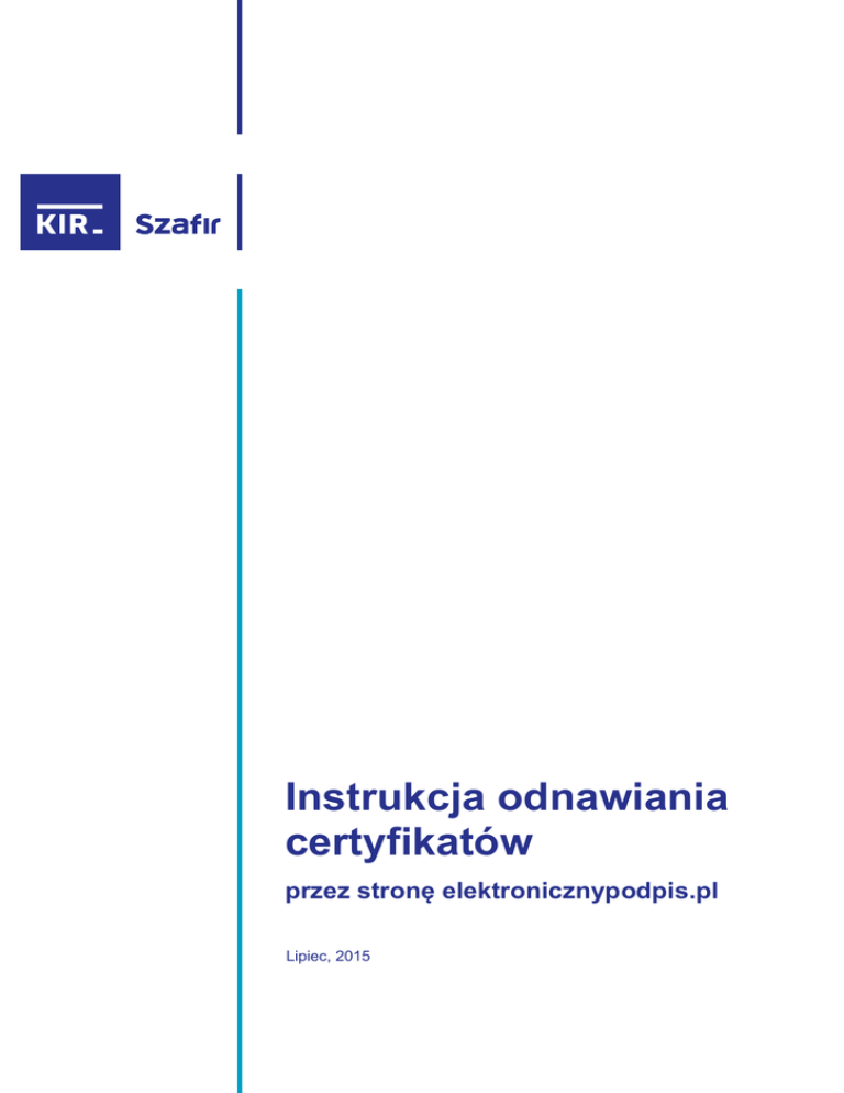 Instrukcja odnawiania certyfikatów przez stronę elektronicznypodpis.pl Lipiec, 2015 Spis treści 1. WPROWADZENIE .................................................................................................... 3 2. WYPEŁNIENIE FORMULARZA WWW ............................................................... 4 3. ODNAWIANIE CERTYFIKATU KWALIFIKOWANEGO .................................. 7 3.1 Generowanie certyfikatu kwalifikowanego przez www ........................................................ 7 3.2 Osadzanie certyfikatu kwalifikowanego na karcie .............................................................. 12 4. ODNAWIANIE CERTYFIKATU NIEKWALIFIKOWANEGO ........................ 15 4.1 Generowanie certyfikatu niekwalifikowanego przez www ................................................. 15 4.2 Osadzanie certyfikatu niekwalifikowanego na karcie ......................................................... 20 4.3 Zapis certyfikatu niekwalifikowanego w pliku .................................................................... 22 2 1. Wprowadzenie Niniejsza instrukcja dotyczy procesu odnawiania za pośrednictwem Internetu (odnowienie online) certyfikatów kwalifikowanych i niekwalifikowanych wydanych przez KIR zapisanych na kartach CryptoCard Carbon lub w przypadku certyfikatów niekwalifikowanych w pliku. Odbiór certyfikatu następuje elektronicznie bez konieczności wizyty w placówce KIR i bez osobistej weryfikacji tożsamości użytkownika. Uwaga: Odnowić certyfikat online można jedynie wtedy, gdy posiadany certyfikat jest ciągle ważny. Proces odnawiania jest możliwy do przeprowadzenia tylko w systemie Windows i w jednej z następujących przeglądarek: Internet Explorer w wersji 7.x lub wyższej lub Mozilla FireFox w wersji 16.x lub wyższej. Do przeprowadzenia procesu generowania żądania o odnowienie online certyfikatu i następnie zdalne wgranie certyfikatu na kartę konieczne jest również zainstalowanie środowiska: Środowisko .NET Framework w wersji 3.5 lub nowszej http://www.microsoft.com/pl-pl/download/details.aspx?id=21; Java Sun JRE w wersji Java 1.6.0_17-b04 lub nowszej (http://www.java.com/pl/download/); Aplikacji CryptoCard Suite http://www.elektronicznypodpis.pl/download/gfx/elektronicznypodpis/pl/defaultstronaopisowa/149/1/ 1/cryptocardsuite.exe UWAGA! - poprzednią wersję aplikacji należy odinstalować i dopiero zainstalować zalecaną; Podczas korzystania z aplikacji do osadzania certyfikatów uruchamiającej się samodzielnie w przeglądarce przy użyciu przeglądarki Mozilla Firefox, należy w przeglądarce w zakładce Narzędzia > Opcje > Aplikacje typ zawartości (type of contents) Aplikacja, ustawić "Czynność" na "zawsze pytaj". 3 2. Wypełnienie formularza www Odnowienie certyfikatu należy rozpocząć od złożenia zamówienia, które można stworzyć dzięki wypełnieniu formularza www dostępnego pod adresem: https://szafir.kir.com.pl/formularze/subscription-edit.action lub po kliknięciu na baner „Zamów/ odnów e-podpis”: Wypełnienie formularza www i kliknięcie przycisku „dalej” umieszczonego na jego końcu spowoduje pojawienie się podsumowania: 4 Po jego pojawieniu należy kliknąć link „dokumenty.pdf”, który pozwoli otworzyć zamówienie w formacie pdf. Należy ten dokument wydrukować i przekazać do podpisu osobom upoważnionym, a następnie przesłać do KIR na adres podany w podsumowaniu. Możliwe jest podpisanie ich bezpiecznym podpisem elektronicznym dla przedstawicieli firm posiadających zestaw z certyfikatem kwalifikowanym. W przypadku, gdy osoby upoważnione nie widnieją w oficjalnych rejestrach, takich jak KRS, CEiDG, należy do dokumentów dołączyć odpowiednie pełnomocnictwa potwierdzające ich uprawnienia do reprezentowania Zamawiającego. W ciągu 3 dni roboczych od dnia otrzymania przez KIR prawidłowo wypełnionego papierowego oryginału zamówienia, na adres e-mail podany w zamówieniu, zostanie wysłana wiadomość z potwierdzeniem złożenia zlecenia. W związku z powyższym prosimy o jak najwcześniejsze wysłanie dokumentów, tak aby proces generowania nowego certyfikatu mógł rozpocząć się w okresie ważności certyfikatu odnawianego. 5 Kliknięcie w powyższym liście przycisku „link”: spowoduje rozpoczęcie procesu generowania odnowienia. Uwaga: Dla certyfikatu niekwalifikowanego jest wysłany osobny e-mail z linkiem do specjalnej strony. 6 3. Odnawianie certyfikatu kwalifikowanego 3.1 Generowanie certyfikatu kwalifikowanego przez www Kliknięcie w link podany w e-mailu uruchomi okno: Należy wcisnąć przycisk „Run”. Pod oknem będzie się wyświetlała strona: 7 Wystarczy włożyć kartę z certyfikatem, który chcemy odnowić do czytnika i wcisnąć przycisk „Start”. Zostaną zaktualizowane komponenty niezbędne do przeprowadzenia tego procesu. Następnie aplikacja odczyta zawartość karty. 8 I zaprezentuje zawartość: Po sprawdzeniu danych, można kliknąć przycisk „Dalej”. Pojawi się okno, w którym po zapoznaniu się z treścią „Informacji prawnej” należy ją zaakceptować poprzez wciśnięcie przycisku „Akceptuj”. Przycisk „Akceptuj” jest dostępny dopiero po przeczytaniu „Informacji prawnej”. 9 Po zaakceptowaniu „Informacji prawnej” należy podać PIN do klucza i kliknąć przycisk „Odnów certyfikat”. Jeżeli zaprezentowany certyfikat nie jest certyfikatem, który chcesz odnowić należy kliknąć przycisk Anuluj. Po wygenerowaniu żądania o odnowienie certyfikatu i podpisaniu „Informacji prawnej” zostanie zaprezentowany ekran z komunikatem potwierdzającym prawidłowe zakończenie tej części procesu: 10 11 3.2 Osadzanie certyfikatu kwalifikowanego na karcie Kiedy certyfikat kwalifikowany będzie już gotowy użytkownik otrzyma e-mail: Uwaga: Konieczne jest zainstalowanie nowych zaświadczeń Narodowego Centrum Certyfikacji http://www.nccert.pl/files/nccert.crt oraz KIR http://www.elektronicznypodpis.pl/certyfikaty/ozk52.der gdyż