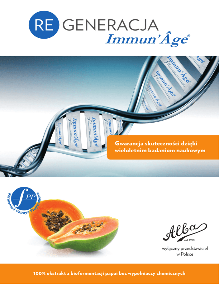RE GENERACJA Gwarancja skuteczności dzięki wieloletnim badaniom naukowym wyłączny przedstawiciel w Polsce 100% ekstrakt z biofermentacji papai bez wypełniaczy chemicznych Skuteczność potwierdzona w testach 4 paramentrów STRES OKSYDACYJNY 1. Glutation - wskaźnik poziomu energetycznego komórek Glutation to trójpeptyd o właściwościach przeciwutleniających (cysteina, glicyna i kwas glutaminowy). W formie zredukowanej, dzięki wolnej grupie tiolowej, służy do redukcji nadtlenków. Glutation jest główną substancją wykorzystywaną na poziomie komórkowym do obrony organizmu, jest najważniejszym nieenzymatycznym czynnikiem antyoksydacyjnym, jakim dysponuje organizm. Glutation jest produkowany przez samą komórkę. Aby podnieść poziom glutationu, trzeba dostarczyć organizmowi składniki potrzebne do jego syntezy. Niedobór glutationu prowadzi do sytuacji, w której organizm nie radzi sobie z usuwaniem wolnych rodników, co w efekcie powoduje uszkodzenia komórek. Jednocześnie glukoza komórkowa nie jest wykorzystana do produkcji ATP (adenozyno-5’-trifosforan - energia komórkowa), ale do odbudowy NADPH (dinukleotyd nikotynoamidoadeninowy). Poziom glutationu można zbadać za pomocą aparatury HPLC. 2. 8-oksy-2’-deoksyguanozyna (8-OHdG) - wskaźnik stanu DNA 8-OHdG to produkt utlenienia guaniny przez wolne rodniki. Guanina jest jedną z podstawowych jednostek budujących kwasy nukleinowe (DNA i RNA). Powstawanie patologii wieku starczego oraz zmian nowotworowych jest bezpośrednio związane z natężeniem stresu oksydacyjnego na poziomie komórkowym i szkodami wyrządzonymi kwasom nukleinowym w tym głównie DNA. Poziom 8-oxo-dG można określić poprzez proste badanie moczu (test immunoenzymatyczny). 3. Dialdehyd malonowy (MDA) - wskaźnik integralności błon komórkowych Wolne rodniki są przyczyną zapoczątkowania procesu peroksydacji lipidów w organizmie. MDA jest jednym z końcowych produktów procesu peroksydacji wielonienasyconych kwasów tłuszczowych w komórkach. Wzrost liczby wolnych rodników jest więc przyczyną zwiększonej ilości MDA. MDA modyfikuje właściwości fizyczne błon komórkowych, powodując zakłócenie hydrofobowości lipidowego wnętrza i naruszenie dwuwarstwowej struktury błony komórkowej. Poziom MDA można zbadać za pomocą testu TBA (kwas tiobarbiturowy). SYSTEM ODPORNOŚCIOWY 4. Tlenek azotu (NO) - wskaźnik aktywności makrofagów Podstawowa rola NO w układzie immunologicznym związana jest z aktywnością makrofagów. Są one potrzebne do obrony organizmu przed patogenami. NO nie tylko bierze udział w odpowiedzi immunologicznej, lecz także jest jej regulatorem, jest w pewnym sensie ‘informatorem’ międzykomórkowym. Poziom NO można określić pośrednio, obserwując wzrost koncentracji azotanów / azotynów. 2 Procesy starzenia. Alzheimer, Parkinson Choroby neurodegeneracyjne Zaburzenia układu krążenia Cukrzyca Nadmiar wolnych rodników i mechanizmów redoks w komórkach Nowotwory Choroby reumatyczne, choroby płuc Uszkodzenia DNA Niedokrwienie serca i mózgu Prof. Luc Antoine Montagnier (ur. 18 sierpnia 1932) wybitna postać świata naukowego to francuski wirusolog i laureat Nagrody Nobla w dziedzinie fizjologii i medycyny za odkrycie ludzkiego wirusa HIV (razem z z F. Barré-Sinoussi i H. zur Hausen). Podczas swojej długiej kariery zawodowej był pracownikiem naukowym Instytutu Pasteura w Paryżu, współzałożycielem Światowej Fundacji Badań nad AIDS, współdyrektorem Międzynarodowego Programu Współpracy nad Wirusami, założycielem i prezesem Światowej Fundacji Badań Medycznych i Prewencji w Huston. Zdobył ponad 20 najważniejszych nagród i wyróżnień, w tym odznaczenie Legią Honorową (Commandeur w 1994 r., Grand Officier w 2009 r.), Nagrodę Laskera (1986), Nagrodę Gairdnera (1987), King Faisal Foundation Award (1993) oraz nagrodę Księcia Asturii (2000). Jest także członkiem Académie Nationale de Médecine. Podczas audiencji 10 czerwca 2002 roku, prof. Montagnier zapisał papieżowi Janowi Pawłowi II preparat FPP® (Fermented Papaya Preparation) w celu przeciwdziałania chorobie Parkinsona. Watykan nie potwierdził stosowania FPP® przez Papieża jednakże stwierdzono, że po wizycie prof. Montagnier’a nastąpiła niezwykła poprawa zdrowia Papieża, szczególnie w czasie jego wizyty w Kanadzie i w Polsce. W wywiadzie udzielonym gazecie La Reppublica (21.03.2003r.) prof. Montagnier stwierdził: „W czerwcu pojechałem do Watykanu na audiencję (...) i z własnej inicjatywy przywiozłem suplement diety (z papai) o działaniu antyoksydacyjnym. (...) Porady, które przekazałem Papieżowi, mają głębokie podstawy naukowe. Wynika z nich, że wiele chorób neurodegeneracyjnych, w tym choroba Parkinsona, jest powiązanych z niszczeniem komórek nerwowych w wyniku procesu utleniania białek. Dzisiaj lepiej rozumiemy działanie takich suplementów.” www.utrzymajmlodosc.pl 3 i procesy starzenia się organizmu Podwyższony stres oksydacyjny i osłabienie systemu obrony przeciwwolnorodnikowej są w stanie wywołać produkcję substancji i cząsteczek, które prowadzą do stanu zapalnego typowego dla procesów starzenia komórkowego i chorób wieku starczego. Uruchamia się wtedy proces opisany w obecnej literaturze jako inflammaging, czyli starzenie związane ze stanem zapalnym. System immunologiczny i przeciwwolnorodnikowy Stres oksydacyjny INFLAMMAGING IL-6, TNF-, hydrokortyzon Genomika, niekorzystne polimorfizmy Uszkodzenia komórkowe i tkankowe Starzenie komórkowe i osłabienie systemu immunologicznego Inflammaging, czynnik starzenia komórkowego jest z naukowego punktu widzenia istotnym elementem etiologii wielu poważnych chorób. Inflammaging jest diagnozowany za pomocą identyfikacji wzrostu produkcji substancji zwanych mediatorami stanu zapalnego takich jak IL(interleukina)-1, IL-6 i TNF-. Inflammaging zwiększa stężenie tzw. “hormonów stresu” we krwi, w tym głównie hydr