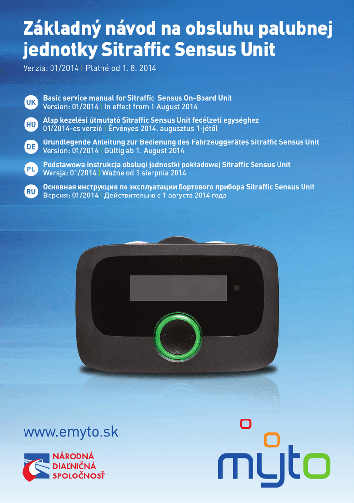 Základný návod na obsluhu palubnej jednotky Sitraffic Sensus Unit Verzia: 01/2014 | Platné od 1. 8. 2014 Basic service manual for Sitraffic Sensus On-Board Unit Version: 01/2014 | In effect from 1 August 2014 Alap kezelési útmutató Sitraffic Sensus Unit fedélzeti egységhez 01/2014-es verzió | Érvényes 2014. augusztus 1-jétől Grundlegende Anleitung zur Bedienung des Fahrzeuggerätes Sitraffic Sensus Unit Version: 01/2014 | Gültig ab 1. August 2014 Podstawowa instrukcja obsługi jednostki pokładowej Sitraffic Sensus Unit Wersja: 01/2014 | Ważne od 1 sierpnia 2014 Основная инструкция по эксплуатации бортового прибора Sitraffic Sensus Unit Версия: 01/2014 | Действительно с 1 августа 2014 года www.emyto.sk 2 Návod na obsluhu palubnej jednotky SK Základný návod na obsluhu palubnej jednotky Sitraffic Sensus Unit 1. Obsah balenia �������������������������������������������������������������������������������������������������������� 4 2. Všeobecné pokyny �������������������������������������������������������������������������������������������������� 4 3. Indikačné, signalizačné a ovládacie prvky �������������������������������������������������������� 5 4. Umiestnenie a inštalácia palubnej jednotky Sitraffic Sensus Unit ���������������� 6 5. Nastavenie palubnej jednotky Sitraffic Sensus Unit ���������������������������������������� 7 6. Používanie palubnej jednotky Sitraffic Sensus Unit �������������������������������������� 10 7. Základné bezpečnostné pokyny ������������������������������������������������������������������������ 12 3 1. Obsah balenia •Ak počas jazdy po vymedzených úsekoch ciest budete vo vozidle prepravovať aktivovanú palubnú jednotku, ktorá nemá byť v čase prepravy použitá na zaznamenanie mýtnych udalostí (tzv. transportný režim), ste povinný pred jazdou zavolať na zákaznícku linku alebo v prípade registrácie vozidla do elektronického mýtneho systému ste povinný pred jazdou informovať pracovníka zákazníckeho miesta. •V prípade, že ste uzatvorili zmluvu o používaní vymedzených úsekov ciest v režime následného platenia mýta, odporúčame vám, aby ste palubnú jednotku pripojili k elektrickej sústave vozidla prostredníctvom pevnej inštalácie. Využite napájací kábel na pevnú inštaláciu určený prevádzkovateľom systému a využite služby autorizovaných partnerov. Zoznam autorizovaných partnerov je zverejnený na každom kontaktnom mieste, distribučnom mieste a zároveň na internetovom portáli. •Každú poruchu, nesprávnu funkčnosť, krádež, stratu, zničenie a/alebo poškodenie palubnej jednotky oznámte bezodkladne prevádzkovateľovi systému na zákazníckej linke +421 2 3511 1111. Balenie palubnej jednotky Sitraffic Sensus Unit obsahuje tieto komponenty: • Palubnú jednotku Sitraffic Sensus Unit vrátane batérie; •Napájací kábel na inštaláciu do cigaretového zapaľovača s LED indikátorom napájania na konektore; •Držiak palubnej jednotky; •Tri prísavky držiaka palubnej jednotky; •Návod na obsluhu palubnej jednotky. Napájací kábel na pevnú inštaláciu palubnej jednotky do vozidla nie je súčasťou balenia palubnej jednotky Sitraffic Sensus Unit. 2. Všeobecné pokyny • Skontrolujte, či je obsah balenia palubnej jednotky Sitraffic Sensus Unit kompletný, vybaľte všetky komponenty a skontrolujte ich neporušenosť. • Vo vozidle používajte výlučne palubnú jednotku a príslušenstvo palubnej jednotky, ktoré sú k vozidlu priradené na základe platne uzatvorenej zmluvy o poskytnutí palubnej jednotky – palubná jednotka je neprenosná. 4 Návod na obsluhu palubnej jednotky 3. Indikačné, signalizačné a ovládacie prvky Na čelnej strane palubnej jednotky sa nachádzajú indikačné, signalizačné a ovláda3. Indikačné, signalizačné cie prvky. Ich význam je popísaný nižšie. a ovládacie prvky Indikačné, signalizačné a ovládacie prvky majú význam uvedený v nižšie priloženej tabuľke. Číslo Číslo 1 Význam 1 2 2 3 Význam Kategória vozidla Evidenčné číslo vozidla Kategória vozidla Štvorsmerové Evidenčné číslo vozidla navigačné tlačidlo určené pre: – nastavenie kategórie vozidla a počtu náprav určené na: 3 Štvorsmerové – navigačné aktiváciu tlačidlo a deaktiváciu akustickej signalizácie – kategórie vynútenie komunikácie elektronickým mýtnym systémom − nastavenie vozidla a počtusnáprav LED indikátor celkového − aktiváciu a deaktiváciu akustickejstavu signalizácie − vynútenie komunikácie s elektronickým mýtnym systémom 4 Zostatok predplateného mýta LED indikátor celkového stavu 4 5 Komerčný stav Pripojenie k externému napájaniu 5 6 Pripojenie k externému Stav batérie napájaniu 6 7 Stav batérieNastavenie reproduktora (zapnutý/vypnutý) Nastavenie reproduktora (zapnutý/vypnutý) 7 4. Umiestnenie a inštalácia palubnej jednotky Sitraffic Sensus Unit 5 • Pripevnite prísavky k držiaku (obrázok č.1). V prípade, ak nie je nap