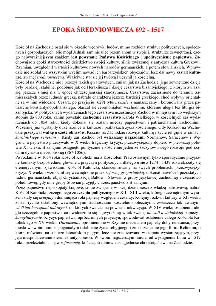 Historia Kościoła Katolickiego – tom 2 EPOKA ŚREDNIOWIECZA 692 - 1517 Kościół na Zachodzie ostał się w okresie wędrówki ludów, mimo rozbicia struktur politycznych, społecznych i gospodarczych. Nie mógł Jednak sam nie ulec przemianom w swoje j, strukturze zewnętrznej, czego najwyraźniejszym znakiem jest powstanie Państwa Kościelnego i upolitycznienie papiestwa. Zachowując z epoki starożytności dziedzictwo swojej kultury, silnie związanej z antyczną kulturą Greków i Rzymian, uwzględnił wartości kulturowe nowych narodów germańskich, a potem słowiańskich. Wprawdzie nie zdołał we wszystkim wyeliminować ich barbarzyńskich obyczajów, lecz dał nowy kształt kulturze, zwanej średniowieczną. Właściwie stał się jej twórcą i uczynił ją kościelną. Kościół na Wschodzie nie i przeżył takich gwałtownych, zmian, jak na Zachodzie, jego zewnętrzne dzieje były bardziej, stabilne, podobnie jak od Herakliusza I dzieje cesarstwa bizantyjskiego, z którym związał się, jeszcze silniej niż w epoce chrześcijańskiej starożytności. Cesarstwo, zacieśnione do terenów zamieszkałych przez ludność grecką, nabrało charakteru jeszcze bardziej greckiego, choć wpływy orientalne są w nim widoczne. Cesarz, po przyjęciu (629) tytułu basileus namaszczany i koronowany przez patriarchę konstantynopolitańskiego, otaczał się ceremoniałem wschodnim, któremu uległa też liturgia bizantyjska. W politycznych wydarzeniach tego cesarstwa uczestniczył Zachód w mniejszym lub większym stopniu do 800 roku, zanim powstało zachodnie cesarstwo Karola Wielkiego, w kościelnych zaś wydarzeniach do 1054 roku, kiedy dokonał się rozłam między papiestwem i patriarchatami wschodnimi. Wcześniej już wystąpiły duże różnice w kulturze i praktykach życia kościelnego. Gdy Kościół na Wschodzie przeżywał walkę o cześć obrazów, Kościół na Zachodzie rozwijał kulturę i życie religijne w ramach karolińskiego renesansu. Kiedy zaś Zachód był wstrząsany najazdami Normanów, Saracenów i Węgrów, a papiestwo przeżywało w X wieku tragiczny kryzys, przezwyciężony dopiero w pierwszej połowie XI wieku, Bizancjum osiągnęło politycznie i kościelnie jeden ze szczytów swego rozwoju pod rządami dynastii macedońskiej (867-1056). Po rozłamie w 1054 roku Kościół Katolicki ma z Kościołem Prawosławnym tylko sporadycznie przyjazne kontakty bezpośrednie, głównie z przyczyn politycznych, dlatego unie z 1274 i 1439 roku okazały się efemerycznymi zjawiskami. Kościół Katolicki, skoncentrowany na swych problemach, przezwyciężył kryzys X wieku i wzmocnił się wewnętrznie przez reformę gregoriańską, dokonał nawróceń pozostałych ludów germańskich, objął chrystianizacją Bałtów i Słowian z grupy językowej zachodniej i częściowo południowej, gdy inne grupy Słowian przyjęły chrześcijaństwo z Bizancjum. Przez papiestwo i episkopaty krajowe, silnie związane w swej działalności z władzą państwową, nabrał Kościół Katolicki szczególnego znaczenia politycznego w XII i XIII wieku, którego zewnętrznym wyrazem stały się krucjaty i dominująca rola papieży względem cesarzy. Kolejny rozkwit kultury w XII wieku został rychło osłabiony wewnętrznymi trudnościami kościelno-społecznymi, zwłaszcza tak zwanymi wielkimi herezjami ludowymi, do których zwalczania powstała inkwizycja. W XIV wieku osłabieniu uległo szczególnie papiestwo, co uwidoczniło się najwyraźniej w tak zwanej niewoli awiniońskiej papieży i koncyliaryzmie. Kryzys papiestwa, oprócz innych przyczyn, spowodował osłabienie całego Kościoła Katolickiego w XV wieku. Odrodzenie, opromienione w Rzymie mecenatem papieży doby renesansu, przyniosło w swoim nurcie spoganiałym osłabienie życia religijnego i zniekształcenie jego form. Reforma, o której mówiono na soborze laterańskim piątym, lecz nie zrealizowano w stopniu wystarczającym, przyjęła niespodziewanie kierunek antypapieski. W swoim najszerszym nurcie, od wystąpienia Lutra w 1517 roku, przekształciła się w reformację, kończąc średniowieczną jedność chrześcijaństwa na Zachodzie. Epoka średniowiecza 692 - 1517 1 Historia Kościoła Katolickiego – tom 2 I OKRES 692 – 772 PATRIMONIUM PIOTROWE 1. Zdobycze islamu, misje Kościoła Utrata Afryki i Hiszpanii. Misja we Fryzji. Bonifacy, Apostoł Niemiec. 2. Papieże i Bizancjum Grecy w Rzymie. Lojalność wobec cesarzy. Kościół na Wschodzie. Przyczyny ikonoklazmu. Zarządzenia cesarskie. Pierwsza faza walki. Synod w Hiereia. Opór mnichów. 3. Papieże i Frankonia Zagrożenie longobardzkie. Karol Martel i Pepin. Korona Pepina I (20). Pepin - Stefan III. Włoskie wyprawy Pepina. Państwo Kościelne. Synod laterański 769. Darowizna Konstantyna Wielkiego. Urzędy papieskie. Kościół frankoński. II OKRES 722 – 885 KAROLIŃSKA ODNOWA 4. Karol Wielki, Hadrian I, Leon III I wyprawa wioska. II i III wyprawa włoska. Wybór Leona III. Wznowienie cesarstwa zachodniego. 5. Ikouoklazm w Kościele Wschodnim Cesarzowa Irena. Sobór nicejski. Księgi karolińskie. Mnisi i bigamia cesarza. Wznowienie ikonoklazmu. Święto ortodoksji. Teologowie. 6. Nawrócenia i zniszczenia Nawracanie Sasów. Awarowie i Maurowie. Początki rekonkwisty hiszpańskiej. Zniszczenia normandzkie i saraceńskie. Chrystianizacja Bułgarów. Morawy - Cyryl i Metody. Chrzest Wiślan. 7. Reformy i renesans karoliński Kapitularze Karola. Renesans karoliński. Uczeni. Ośrodki i szkoły. Spory teologiczne. Jan Szkot z Eriugena. Reformator Benedykt z Aniane. Reformy Ludwika Pobożnego. Konstytucja rzymska. Opozycja Wali. Epoka średniowiecza 692 - 1517 2 Historia Kościoła Katolickiego – tom 2 8. Papieże i metropolici Układ w Verdun. Sprawy rzymskie. Dekrety pseudoizydoriańskie. Metropolita Hinkmar. Mikołaj I. 9. Papieże, Ignacy i Focjusz Patriarcha i studyci. Patriarcha Focjusz. Sprawa Focjusza w Rzymie. Sobór ósmy powszechny. Powrót 