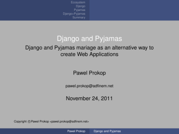 Ecosystem Django Pyjamas Django+Pyjamas Summary Django and Pyjamas Django and Pyjamas mariage as an alternative way to create Web Applications Pawel Prokop [email protected] November 24, 2011 c Copyright Pawel Prokop <[email protected]> Pawel Prokop Django and Pyjamas Ecosystem Django Pyjamas Django+Pyjamas Summary Introduction I’ll tell a story about some mariage... ...Django ...Pyjamas Pawel Prokop Django and Pyjamas Ecosystem Django Pyjamas Django+Pyjamas Summary Part I: Introduction but first... Ecosystem Pawel Prokop Django and Pyjamas Ecosystem Django Pyjamas Django+Pyjamas Summary ECOSYSTEM hosting applications Database systems Mantaining Web application architecture . Pawel Prokop Django and Pyjamas Ecosystem Django Pyjamas Django+Pyjamas Summary ECOSYSTEM hosting applications Database systems Mantaining Web application architecture Hosted on server... Pawel Prokop Django and Pyjamas Ecosystem Django Pyjamas Django+Pyjamas Summary ECOSYSTEM hosting applications Database systems Mantaining Web application architecture ...and accessed from clients Pawel Prokop Django and Pyjamas Ecosystem Django Pyjamas Django+Pyjamas Summary ECOSYSTEM hosting applications Database systems Mantaining Web application architecture ...from many browsers Pawel Prokop Django and Pyjamas Ecosystem Django Pyjamas Django+Pyjamas Summary ECOSYSTEM hosting applications Database systems Mantaining Web application architecture ...and many operating systems Pawel Prokop Django and Pyjamas Ecosystem Django Pyjamas Django+Pyjamas Summary ECOSYSTEM hosting applications Database systems Mantaining Hosting applications (servers & frameworks) Pawel Prokop Django and Pyjamas Ecosystem Django Pyjamas Django+Pyjamas Summary ECOSYSTEM hosting applications Database systems Mantaining Database systems Pawel Prokop Django and Pyjamas Ecosystem Django Pyjamas Django+Pyjamas Summary ECOSYSTEM hosting applications Database systems Mantaining Upgrading... ...the server ...client not involved Pawel Prokop Django and Pyjamas Ecosystem Django Pyjamas Django+Pyjamas Summary Introduction Installation Model Templates Viewer Part II: Django Django Ecosystem Pawel Prokop Django and Pyjamas Ecosystem Django Pyjamas Django+Pyjamas Summary Introduction Installation Model Templates Viewer Who the hell is... framework written in python talks: python HTTP JSONRPC Pawel Prokop Django and Pyjamas Ecosystem Django Pyjamas Django+Pyjamas Summary Introduction Installation Model Templates Viewer Philosophy Model - database objects Template - html rendering mechanism Viewer - bussiness rules Pawel Prokop Django and Pyjamas Ecosystem Django Pyjamas Django+Pyjamas Summary Introduction Installation Model Templates Viewer Django installation Get latest official - stable version 1 2 3 4 wget h t t p : / / www. d j a n g o p r o j e c t . com / download / 1 . 3 . 1 / t a r b a l l / t a r x z v f Django −1.3.1. t a r . gz cd Django −1.3.1 sudo python setup . py i n s t a l l Get latest from repository 1 svn co h t t p : / / code . d j a n g o p r o j e c t . com / svn / django / t r u n k / d j a n g o _ t r u n k Pawel Prokop Django and Pyjamas Ecosystem Django Pyjamas Django+Pyjamas Summary Introduction Installation Model Templates Viewer Verification Verify installation (from python console) 1 2 i m p o r t django django . g e t _ v e r s i o n ( ) Pawel Prokop Django and Pyjamas Ecosystem Django Pyjamas Django+Pyjamas Summary Introduction Installation Model Templates Viewer Project creation Create project filesystem 1 django−admin . py s t a r t p r o j e c t m y p o r t a l Files created: ./manage.py ./myportal ./myportal/urls.py ./myportal/settings.py Pawel Prokop Django and Pyjamas Ecosystem Django Pyjamas Django+Pyjamas Summary Introduction Installation Model Templates Viewer Create application Create application structure 1 python manage . py s t a r t a p p myapp Files created: ./models.py ./views.py ./tests.py Pawel Prokop Django and Pyjamas Ecosystem Django Pyjamas Django+Pyjamas Summary Pawel Prokop Introduction Installation Model Templates Viewer Django and Pyjamas Ecosystem Django Pyjamas Django+Pyjamas Summary Introduction Installation Model Templates Viewer Database create database manualy let django to generate database from django model Pawel Prokop Django and Pyjamas Ecosystem Django Pyjamas Django+Pyjamas Summary Introduction Installation Model Templates Viewer Django model models.py 1 2 3 4 5 6 7 8 from django . db i m p o r t models c l a s s Users ( models . Model ) : l o g i n = models . C h a r F i e l d ( max_length =32) name = models . C h a r F i e l d ( max_length =256) a c t i v i t y = models . B o o l e a n F i e l d ( d e f a u l t = False ) e x p i r e = models . D a t e F i e l d ( n u l l =True , b l a n k =True ) passwd = models . C h a r F i e l d ( max_length =256) Built-in field classes: AutoField,BigIntegerField,BooleanField, CharField,DateField,DateTimeField, DecimalField,EmailField,FileField, FloatField,ImageField,IntegerField, IPAddressField,SmallIntegerField,TextField, TimeField,URLField,XMLField ...and more... Pawel Prokop Django and Pyjamas Ecosystem Django Pyjamas Django+Pyjamas Summary Introduction Installation Model Templates Viewer Field arguments null - field can be null blank - field can be blank choices - choices will be displayed for field on admin panel db_column - customize column name db_index - create index for this field db_tablespace - defines name of tablespace default - default value for this field editable - specifies if field is editable via admin panel error_messages - allows to override default error message Pawel Prokop Django and Pyjamas Ecosystem Django Pyjamas Django+Pyjamas Summary Introduction Installation Model Templates Viewer ...field arguments, cont. help_text - specifies text that will be displayed next to field on admin panel primary_key - specifies if the field is primary key unique - specifies if the field is unique for the table unique_for_date - specifies DateFiel