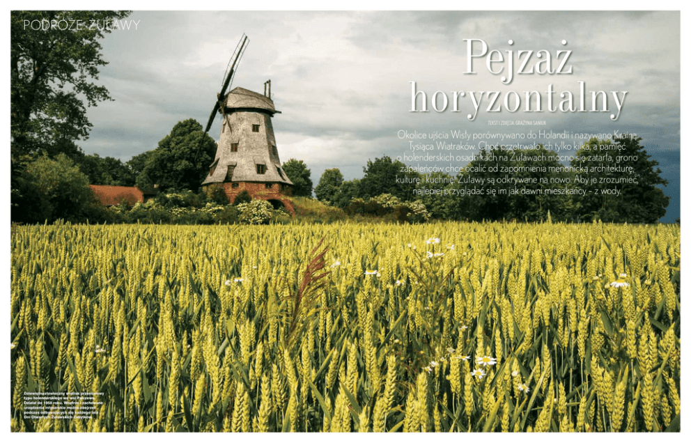 PODRÓŻE: ŻUŁAWY Pejzaż horyzontalny Tekst i Zdjęcia: grażyna saniuk Okolice ujścia Wisły porównywano do Holandii i nazywano Krainą Tysiąca Wiatraków. Choć przetrwało ich tylko kilka, a pamięć o holenderskich osadnikach na Żuławach mocno się zatarła, grono zapaleńców chce ocalić od zapomnienia menonicką architekturę, kulturę i kuchnię. Żuławy są odkrywane na nowo. Aby je zrozumieć, najlepiej przyglądać się im jak dawni mieszkańcy – z wody. Dziewiętnastowieczny wiatrak przemiałowy typu holenderskiego we wsi Palczewo. Działał do 1958 roku. Wnętrze i zachowane urządzenia młynarskie można obejrzeć podczas odbywających się każdego lata Dni Otwartych Żuławskich Zabytków. Z Zostali tu zaproszeni za zgodą króla Zygmunta Augusta, na obszary jałowe, bagniste i nienadające się do użytku. Płacąc wysoką cenę, zamienili je w żyzne i rodzące” – chwalił w 1642 roku król Władysław IV wkład olędrów w rozwój I Rzeczypospolitej. Sto lat wcześniej z Holandii i północnej Fryzji przybyli w deltę Wisły protestanci zwani mennonitami. Ruchowi przewodził Menno Simons, kaznodzieja, który głosił odrzucenie przemocy po tym, jak religijne waśnie w mieście Münster skończyły się krwawą rzezią. Mennonici byli pacyfistami. Odmawiali służby wojskowej, nie nosili broni i nie uznawali hierarchii kościelnej. W obawie przed pogromami uciekli do katolickiej Polski, będącej wówczas oazą tolerancji. Czuli się tu bezpieczni, a nasze niziny przypominały im rodzinne strony. Wyróżniali się mistycznym podejściem do pracy. Osuszając Żuławy, dokonali cudu gospodarczego. Mokradła przeobraziły się w żyzną krainę zamieszkaną z czasem przez kosmopolityczną społeczność: rolników, rzemieślników i kupców z całej Europy. Żuławy, których symbolem były wiatraki i odwadniające kanały, stały się jedną z zamożniejszych części Polski, a potem Prus. W 1945 roku żołnierze niemieccy zatopili poldery, a potomkowie olędrów po raz kolejny musieli opuścić własną ziemię. Od kilku lat odwiedzają ją coraz chętniej w ramach wycieczek 2 3 216 Twój STYL 4 swoich kongregacji z Holandii, Niemiec i Stanów Zjednoczonych. Wnukowie rodzin Klassenów, Siemensów i Wiebe’ów zaopatrzeni w stare mapy i fotografie wędrują szlakami dawnych olęderskich gospodarstw, cmentarzy i zborów. Usłyszeć ich śpiewających psalmy w starym kościółku – bezcenne. Z biegiem rzeki – W żuławskich wsiach funkcję drogi pełniła rzeka – tłumaczy Marek Opitz, fotograf i znawca regionu. – Łodzią płynęło się na targ, Żuławy najlepiej zwiedzać hausbootem, czyli... barką. Prowadzić może ją każdy. na pole i do kościoła. Z rzeki widać to, czego nigdy nie dostrzeżemy z lądu: żuławskie wsie były ulicówkami nadrzecznymi. Gospodarstwa miały przystanie i łódki – wyjaśnia. – By zrozumieć Żuławy, trzeba oglądać je z wody – przekonuje, manewrując sterem zwrotnego housboota, barki mieszkalnej do żeglugi śródlądowej. Wypływamy na wody Szkarpawy, leniwie podążając w stronę Zalewu Wiślanego. Mijamy przyrzeczne gospodarstwa, które wskutek podnoszenia się koryta rzeki fot. Wojciech WÓjcik/FORUM 1 wydają się znajdować poniżej lustra wody. To krajobraz całkowicie ukształtowany przez człowieka. Nawet charakterystyczne żuławskie wierzby nie rosną tu przez przypadek. Przywieźli je mennonici. To organiczne pompy – każda wysysa z ziemi kilkadziesiąt litrów wody dziennie, pochłaniając nadmiar wilgoci. Za ostatnią kameralną przystanią w Osłonce znikają wszelkie oznaki cywilizacji. Kończą się ukształtowane przez człowieka poldery, a zaczynają rozległe dzikie trzcinowiska i trudno oprzeć się wrażeniu, że jest się na końcu świata. To niepodzielne królestwo ptactwa wodnego. Odkąd w 2013 roku utworzono Pętlę Żuławską – drogę wodną łączącą szlaki Wisły, Szkarpawy i Nogatu – sekrety dorzecza Wisły może odkrywać każdy. Najwygodniej hausbootem, który można prowadzić bez wodniackich patentów. Start i meta trasy w Rybinie, malowniczej wsi w rozwidleniu Wisły Królewieckiej i Szkarpawy, która po latach marazmu stała się gwarnym węzłem komunikacyjnym. Rybina zawdzięcza również swój rozkwit pewnemu przedsiębiorczemu... Ślązakowi. Łukasz Krajewski, wodniak z Jaworzna, odkrywszy żuławskie szlaki wodne, postanowił założyć tu flotę hausbootów. Łodzie sam zaprojektował i wyprodukował. – Moja barka jest zwrotna, wygodna i łatwa w obsłudze – Krajewski wylicza jej zalety. – To połączenie przyczepy kempingowej i tramwaju wodnego. Żeby nią sterować – podkreśla armator – wystarczy trzygodzinne szkolenie. Jedna trzecia turystów, którzy do nas docierają, nigdy nie żeglowała – mówi. To całkiem jak ja. Cierpliwie ćwiczę więc cofanie i wiązanie cumowniczego węzła knagowego. Podejście barką do kei okazuje się łatwiejsze niż parkowanie auta. Energicznym ruchem „wstecznego” oczyszczam śrubę z wodorostów i można ruszać. Lektura na drogę? Locja, czyli księga zasad poruszania się po szlaku. Najważniejsze jednak to „czytać wodę”, czyli uważnie się jej przyglądać, by nie wpaść na podwodne przeszkody. 1. Wisła Królewiecka na wysokości Sztutowa. Ta odnoga Szkarpawy uważana jest za jedną z najpiękniejszych odcinków Pętli Żuławskiej. Kiedyś była to droga wodna prowadząca do Królewca, potem zdegradowana do roli kanału melioracyjnego. Od kilku lat znów jest żeglowna. 2. Mennonici z niemieckiej miejscowości Frankenthal w dawnym zborze w Elblągu. 3. Wnętrze domu podcieniowego w Trutnowach. Mieszkańcy okolicznych wsi dostarczyli eksponatów: narzędzi rolniczych, elementów wyposażenia domu i zdjęć. 4. Osiemnastowieczny dom podcieniowy Marka Opitza we wsi Żelichowo-Cyganek został tu przeniesiony deska po desce z Jelonek. 5. Rybina. Baza Żeglugi Wiślanej, floty czarterowyc