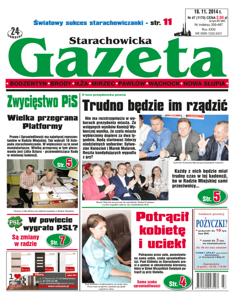 18. 11. 2014 r. Światowy sukces starachowiczanki - str. Nr 47 (1170) CENA 2,50 zł 11 (w tym 8% VAT) Nr indeksu 359-467 Rok XXIII NR ISSN 1232-2431 Starachowicka BODZENTYN BRODY IŁŻA MIRZEC PAWŁÓW WĄCHOCK NOWA SŁUPIA Zwycięstwo PiS Trudno będzie im rządzić II tura prezydencka pewna Wielka przegrana Platformy Prawo i Sprawiedliwość ma najwięcej reprezentantów w Radzie Miejskiej. Tak wybrali 16 listopada starachowiczanie. W większości są to nowi mandatariusze. Wielką przegraną w tym głosowaniu jest Lidia Dziura - przewodnicząca Rady w minionej kadencji. Str. 5 Nie ma rozstrzygnięcia w wyborach prezydenta miasta. Ze wstępnych wyników Komisji Wyborczej wynika, że szefa miasta wybierzemy dopiero za dwa tygodnie. Będą startować liderzy niedzielnych wyborów: Sylwester Kwiecień i Marek Materek. Reszta kandydujących wypadła z gry? Sylwester Kwiecień liderem prezydenckich wyborów Każdy z nich będzie miał trudny czas w tej kadencji, bo w Radzie Miejskiej sami przeciwnicy... Str. Marek Materek ma powody do satysfakcji. Zdobył II miejsce i za dwa tygodnie zmierzy się z kandydatem SLD Potrącił kobietę i uciekł Niestety, Lidia Dziura nie zdobyła mandatu w Radzie Miejskiej W powiecie wygrało PSL? Są zmiany w radzie Str. 7 Potrącona przez auto, pozostawiona sama sobie, szuka sprawiedliwości. Pani Elżbieta ze Starachowic prosi o pomoc w odnalezieniu kierowcy, który w Dzień Wszystkich Świętych potrącił ją przy Statoilu. Pani Elżbieta z trudem patrzy na swoje szwy. Przez rany na głowie, musiano jej zgolić częściowo włosy Sama szuka sprawiedliwości Str. 4 5 Strona GAZETA STARACHOWICKA 2 W trosce o bezpieczeństwo O częstszą kontrolę prędkości kierowców poruszających się ulicami Zgodną i Boczną wnioskował na ostatniej w kadencji sesji Rady Miejskiej Robert Sowula. NR 47 (1170) Dostarczyciele lekceważą swoje obowiązki Korespondencja trafia do... kałuż W przęśle od ogrodzenia, kałuży pod skrzynką, albo na trawie - w takich miejscach „odbierała” przesyłki mieszkająca w Wąchocku Danuta Promińska. Tak było nawet z korespondencją Zdaniem radnego, ustawienie w okolicach tych tras fotoradaru, z... banku. O problemie pisaliśmy wielokrotnie, informowani także przez starachowiczan. jakim dysponuje starachowicka Straż Miejska, po części rozwiązałoby problem, który jest poważny, bo doszło tam do dwóch śmiertelnych wypadków. Zasadność wniosku radnego Sowuli potwierdził komendant Straży Miejskiej Waldemar Jakubowski. Powiedział GAZECIE, że jakiś czas temu do komendy wpłynęło pismo od mieszkańców ul. Zgodnej interweniujących w tej samej sprawie. Strażnicy od zarządcy terenu dostali zgodę na ustawienie tam fotoradaru i często kontrolują prędkość, szczególnie w dni, kiedy ruch pieszych jest natężony. W związku z prośbą radnego W. Jakubowski obiecał też zwiększenie częstotliwości działań. - Aby było bezpiecznie na naszych drogach, potrzeba więcej ludzi zdrowo myślących, którzy nie ulegając medialnej nagonce czy też próbując zbić „kapitał polityczny”, spojrzą realnie na problem i dostrzegą jego istotę. Populistyczne jęki „piratów drogowych” nie powinny wpływać na ludzi odpowiedzialnych za stanowienie i kształtowanie prawa, bo ono ma chronić ludzi przed bezprawnym działaniem sprawców, a nie drogowych „zabójców” przed konsekwencjami. Wspólnie z prezydentem jasno określiliśmy zadanie naszego fotoradaru - ma pomóc mieszkańcom miasta, zgłaszającym się do nas z problemem „pirackich wyczynów” na starachowickich drogach. Nie po to, „by nabijać kasę” lecz by konsekwentnymi działaniami wyeliminować „pseudomistrzów” kierownicy, mających za nic przepisy ruchu drogowego. Kto jeździ prawidłowo nie musi obawiać się naszego fotoradaru - zapewnił W. Jakubowski. (Kas) Kartka świąteczna zaadresowana do sąsiada, list, który dotarł do nas po kilku miesiącach, zniszczona paczka - pocztowe pomyłki zdarzały się zawsze. Ale firmie „InPost”, która obsługuje coraz więcej przesyłek, zdecydowanie za często, co potwierdzają mieszkańcy. Ostatnio napisała do nas Danuta Promińska z Wąchocka, której bankowa korespondencja, zawierająca jej dane osobowe oraz wyciągi z konta, trafiała w coraz to dziwniejsze miejsca. Zamiast do skrzynki pocztowej przy ulicy Torowej 8 w Wąchocku, gdzie mieszka, znalazła się w kratce ogrodzenia pod numerem 40, przy budynku przeznaczonym do generalnego remontu. - Dobrze, że jego właściciel zabrał zmoczoną i zgniecioną przesyłkę i w ramach sąsiedzkiej uprzejmości dostarczył ją do mnie - opowiadała mieszkanka. Wcześniej znalazła inną w bajorku wody przy ogrodzeniu, pod skrzynką pocztową przy posesji. Innym razem zamiast do sklepu przy ulicy Kolejowej, list trafił na... trawę za płotem sklepu. - 31 października doręczycielka przekazała list i przesyłkę bankową w ręce przechodnia, by podał ją do klasztoru - opowiadała nam pani Danuta, sugerując, że takie doręczanie przesyłek powinno podlegać karze. . O komentarz poprosiliśmy firmę InPost, która zapewniła GAZETĘ, że podjęła wszelkie możliwe działania, aby wyjaśnić tę sytuację. Jednak z uwagi na brak numerów przesyłek, które znajdowały się na kopertach, przesłanych do banku wraz z reklamacją przez panią Danutę, pracownicy nie byli w stanie zweryfikować losów jej korespondencji, a co za tym idzie doszukać się również nieprawidłowości jej doręczenia. W najbliższym czasie mają zweryfikować, czy adresat posiada odpowiednią skrzynkę odbiorczą (jest to obowiązek ustawowy), gdyż właśnie jej brak - jak tłumaczono nam w Dziale Obsługi Klienta InPost - może być przyczyną nieskutecznej realizacji doręczeń. - Pracownicy InPost przechodzą odpowiednie szkolenia z zakresu sposobu doręczania przesyłek oraz dokładają wszelkich starań, aby dotrzymać określonych procedur. Stawiamy n