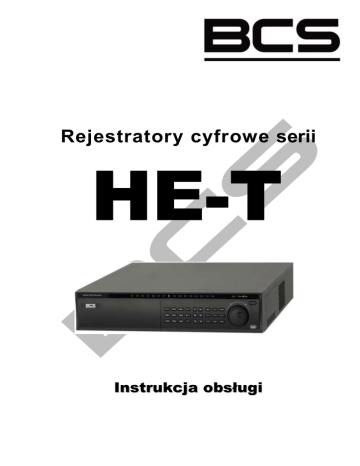 Rejestratory cyfrowe serii Instrukcja obsługi Witamy D z i ę k u j e m y z a z a k u p n a s z e g o r e j e s t r a t o r a c yf r o we g o ! N i n i e j s z a i n s t r u k c j a p o z wa l a n a z a p o z n a n i e s i ę z d z i a ł a n i e m, u r u c h o m i e n i e o r a z p r a wi d ł o wą o b s ł u g ę u r z ą d z e n i a . Z n a j d u j ą s i ę w n i e j i n f o r ma c j e o p o s z c z e g ó l n yc h f u n k c j a c h i s p o s o b a c h i c h w yk o r z ys t a n i a . Przed rozpoczęciem instalacji, z a l e c e n i a mi o r a z o s t r z e ż e n i a mi ! zapoznaj się z p o n i ż s z ym i UWAGA! Producent zastrzega sobie prawo dokonywania zmian parametrów i sposobu obsługi bez wcześniejszego poinformowania. Ze względu na ciągłą modyfikację i ulepszenia, niektóre funkcje opisane w niniejszej instrukcji mogą się nieznacznie różnić w rzeczywistości. Edycja: 20.01.2011 – 2. – SPIS TREŚCI WAŻNE ZALECENIA i OSTRZEŻENIA .............................................................. 6 1. 1.1. 1.2. CECHY I SPECYFIKACJE ............................................................................ 7 7 7 2. 2.1 2.2 WYGLĄD OGÓLNY I STEROWANIE ....................................................... Cechy ............................................................................................................ Specyfikacje ................................................................................................. Panel przedni ............................................................................................... Panel Tylny ................................................................................................... 11 11 12 Widok ogólny ................................................................................................... Przykład podłączenia ....................................................................................... 12 14 Pilot zdalnego sterowania ........................................................................... Sterowanie myszą komputerową ............................................................... Klawiatura wirtualna i panel przedni .......................................................... 14 16 17 Klawiatura wirtualna ......................................................................................... Panel przedni ................................................................................................... 17 17 INSTALACJA i PODŁĄCZENIA ................................................................. Zawartość opakowania ............................................................................... Instalacja dysku twardego .......................................................................... 18 18 18 Wybór dysku twardego ..................................................................................... Obliczanie pojemności dysków twardych .......................................................... Instalacja dysku twardego ................................................................................ Instalacja nagrywarki CD lub DVD ................................................................... 18 18 18 20 Wolnostojący lub montaż w szafie Rack ................................................... 21 Wolnostojący .................................................................................................... Montaż w szafie Rack ...................................................................................... 21 21 Podłączenie zasilania .................................................................................. Podłączanie urządzeń ................................................................................. 21 21 Podłączenie kamer ........................................................................................... Podłączenie monitorów .................................................................................... 22 23 Podłączenie toru Audio, wejść i wyjść alarmowych ................................. 23 Wejścia Audio / Wyjścia Audio ......................................................................... Wyjścia przelotowe Video ................................................................................. Wyjścia matrycowe .......................................................................................... Wejścia i wyjścia alarmowe .............................................................................. Wejścia alarmowe ............................................................................................ Wyjścia alarmowe ............................................................................................ Szczegóły połączeń wejść / wyjść alarmowych ................................................ Opis wyjść alarmowych .................................................................................... 23 24 24 25 25 26 26 28 3.7 3.8 3.9 Interfejs RS232 ............................................................................................. Interfejs RS485 ............................................................................................. Inne interfejsy .............................................................................................. 29 29 29 4 4.1 OBSŁUGA REJESTRATORA ..................................................................... Logowanie, Wylogowanie (wyłączenie) i Menu główne ........................... 31 31 Logowanie ........................................................................................................ Menu główne .................................................................................................... Wylogowanie .................................................................................................... Przywracanie systemu po zaniku zasilania ....................................................... Wymiana baterii podtrzymującej ..............................