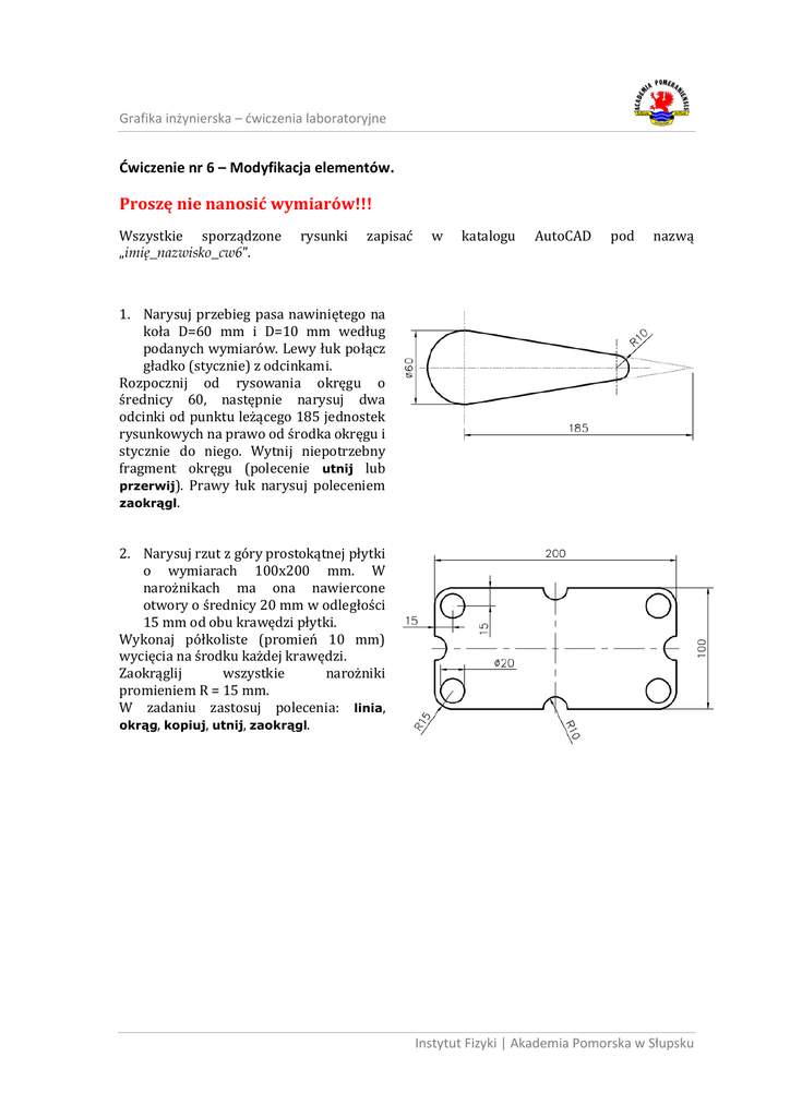 Grafika inżynierska – ćwiczenia laboratoryjne Ćwiczenie nr 6 – Modyfikacja elementów. Proszę nie nanosić wymiarów!!! Wszystkie sporządzone „imię_nazwisko_cw6”. rysunki zapisać w katalogu AutoCAD pod nazwą 1. Narysuj przebieg pasa nawiniętego na koła D=60 mm i D=10 mm według podanych wymiarów. Lewy łuk połącz gładko (stycznie) z odcinkami. Rozpocznij od rysowania okręgu o średnicy 60, następnie narysuj dwa odcinki od punktu leżącego 185 jednostek rysunkowych na prawo od środka okręgu i stycznie do niego. Wytnij niepotrzebny fragment okręgu (polecenie utnij lub przerwij). Prawy łuk narysuj poleceniem zaokrągl. 2. Narysuj rzut z góry prostokątnej płytki o wymiarach 100x200 mm. W narożnikach ma ona nawiercone otwory o średnicy 20 mm w odległości 15 mm od obu krawędzi płytki. Wykonaj półkoliste (promień 10 mm) wycięcia na środku każdej krawędzi. Zaokrąglij wszystkie narożniki promieniem R = 15 mm. W zadaniu zastosuj polecenia: linia, okrąg, kopiuj, utnij, zaokrągl. Instytut Fizyki | Akademia Pomorska w Słupsku Grafika inżynierska – ćwiczenia laboratoryjne 3. Narysuj kołnierz pokazany na rysunku (narysuj połowę kołnierza, a następnie skorzystaj z polecenia lustro). Rysunku nie należy Wymiary podane tylko utworzenia rysunku. wymiarować. na potrzeby Po narysowaniu wykonaj rzut kołnierza z góry, a następnie rozmieść 8 otworów pod śruby. Zastosuj polecenie szyk. Zapisz rysunek, będzie następnych zadaniach. użyty w 4. Narysuj nakrętkę sześciokątną o wymiarach pokazanych na rysunku. Elementy rysuj uwzględnieniem możliwości zastosowania odbicia lustrzanego. Rozpocznij od narysowania nakrętki w II stopniu uproszczenia w widoku z góry, a następnie przejdź do rysowania widoku czołowego. Fazy w obu powierzchniach czołowych nakrętki wykonaj pod kątem 300. Wymiar fazy uzyskaj z dolnego rzutu nakrętki. Do narysowania łuków użyj polecenia łuk z opcją pRomień. Następnie narysuj nkrętkę w położeniu pokazanym na rysunku b. Z widoku dolnego na rysunku a uzyskaj widok b za pomocą polecenia kopiowania i obrotu sześciokąta w uzyskanej kopii. Widok górny na rysunku b uzyskaj na podstawie narysowanych elementów z rysunku i widoku dolnego z rysunku b. (Istnieje możliwość odbicia lustrzanego połowy elementu.) Łuki widoczne na rysunku b rysuj metodą 3P (przez trzy punkty). Użyj poleceń: okrąg, wielobok, linia, łuk, kopiuj, obrót, lustro. Zapisz rysunek. Instytut Fizyki | Akademia Pomorska w Słupsku Grafika inżynierska – ćwiczenia laboratoryjne 5. Wykorzystując nakrętkę z zadania poprzedniego, narysuj śrubę o wymiarze M22 pokazaną na rysunku. Zastosuj polecenie skala. Zapisz rysunek. 6. Narysuj rysunek złożeniowy połączenia kołnierzowego (w przekroju). Użyj kołnierz z zadania 3 oraz śrubę i nakrętkę z zadań 4 i 5. Pomiędzy powierzchniami uszczelniającymi kołnierz umieść uszczelnienie spoczynkowe o grubości 2 mm i wymiarach Φ153 x Φ113. Pomiędzy nakrętką a kołnierzem umieść podkładkę o grubości 1,5 mm oraz wymiarach Φ46 x Φ24. Użyć poleceń: kopiuj, lustro. 7. Wykonaj poniższe rysunki (bez wymiarowania). 8. Zaprojektuj dno eliptyczne na zbiornik o średnicy wewnętrznej 250 mm i grubości 5 mm. Głębokość dna (jeden z promieni elipsy) wynosi 80 mm. Pokaż jego przekrój poprzeczny. Zastosuj polecenia: elipsa oraz odsuń. Instytut Fizyki | Akademia Pomorska w Słupsku Grafika inżynierska – ćwiczenia laboratoryjne 9. Zaprojektuj dno sitowe o Φ451 mm na pęczek rur o średnicy zewnętrznej 10 mm rozmieszczonych w prostokątnej siatce o podziałce 20 mm. Odległość rurek od ścianek zbiarnika nie może być mniejsza niż 10 mm. Policz liczbę rurek w dnie. W wersji II rurki rozmieszczone są w siatce heksagonalnej o podziałce 25 mm). Wygląd dna sitowego. Siatka heksagonalna oparta na trójkącie równobocznym o boku równym podziałce. Aby ją narysować trzeba razy zastosować polecenie szyk prostokątny. Instytut Fizyki | Akademia Pomorska w Słupsku