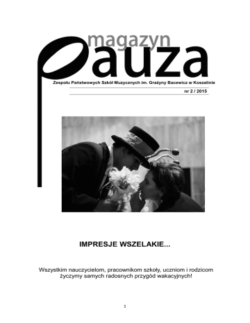 Zespołu Państwowych Szkół Muzycznych im. Grażyny Bacewicz w Koszalinie nr 2 / 2015 IMPRESJE WSZELAKIE... Wszystkim nauczycielom, pracownikom szkoły, uczniom i rodzicom życzymy samych radosnych przygód wakacyjnych! 1 WSTĘPNIAK Koncerty, konkursy, egzaminy, dyplomy… - jednym słowem: kolejny rok za nami! Czeka nas już tylko odebranie świadectw, rozstanie z kolegami i koleżankami, a później upragnione wakacje! Tymczasem, oddając to wydanie gazetki w Twoje ręce, Czytelniku, chciałabym zwrócić uwagę na kilka tematów poruszanych w numerze. Tegoroczny Dzień Otwarty zgromadził wielu przedszkolaków (i nie tylko), chcących dowiedzieć się czegoś więcej i poznać bardziej naszą szkołę. Zdamy relację zarówno z tego wydarzenia, jak i z projektu drugich klas gimnazjalnych pt. „Boska podróż w czasie”. Poznacie też bliżej nauczycieli, którzy - choć pracują w naszej szkole od wielu lat nie mieli jeszcze swojego miejsca w „Pauzie”. Postanowiliśmy zapytać, dlaczego zdecydowali się tutaj pracować i co daje im ta praca. Jak co roku, uczniowie naszej szkoły odnieśli liczne sukcesy na konkursach ogólnopolskich i międzynarodowych. Szczególnie wyróżnieni zostali ci, którzy w maju tego roku mieli okazję wystąpić w roli solistów z profesjonalną orkiestrą w Filharmonii Koszalińskiej. Dzięki nauczycielce religii, pani Emilii Raczyńskiej, wielu uczniów brało również czynny udział w rajdach PTTK. Ostatnio były to Rajd „Wiosna” oraz Rajd „Z wizytą u pomników przyrody”. W tym numerze przeczytacie też, gdzie warto pojechać i co zobaczyć podczas wakacji. Poznacie też laureatów konkursu „Magiczna moc sztuki” i będziecie mieli możliwość przeczytania nagrodzonych prac. *** Tak to już jest, że upływający czas stanowi, niestety, nieodłączny element naszego życia. Nie odkładajmy wszystkiego na później! Doceniajmy siebie, uwielbiajmy życie i czerpmy z niego całymi garściami! Życzę Wam, aby te wakacje były wspaniałą i niepowtarzalną przygodą, w której z ogromną przyjemnością i całkowitym zaangażowaniem weźmiecie udział całymi sobą. Do zobaczenia we wrześniu! Agata Czaplicka Redaktor naczelna: Agata Czaplicka Opiekun magazynu: p. Beata Piocha Oprawa graficzna: zespół; zdjęcia redakcji oraz z zasobów p. Ewy Gajdzis i p. Tomasza Tukajskiego, rysunki Hani Batyńskiej Skład i łamanie: p. Beata Piocha Redakcja tego numeru: Hania Batyńska, Marysia Busłowicz, Agata Czaplicka, Weronika Kulczycka, Zosia Mańczuk, Ola Mrzygłód, Natalia Nowak, Julia Omachel, Ola Omańska, Julia Szczawińska, Michalina Szwed, Krzysztof Niemiec, Łukasz Tyszecki, Gabriel Wasilewski. 2 DZIEŃ OTWARTY 11 kwietnia 2015 r. zorganizowano w naszej szkole Dzień Otwarty. Przywitaliśmy przybyłych gości wspaniałym koncertem, później zaś przyszli uczniowie mieli możliwość zapoznania się z każdym instrumentem, mogli też zadawać nurtujące ich pytania nauczycielom… Tradycyjnie koncert, przygotowany przez uczniów i nauczycieli, poprzedzony został prezentacją multimedialną na temat profilu, działalności i osiągnięć szkoły. Prowadząca koncert pani Lucyna Górska dzięki dowcipnym zapowiedziom i muzycznym zagadkom podtrzymywała zainteresowanie najmłodszych gości, przyszłych uczniów ZPSM. Największą atrakcją były jednak występy. Na przykład młodziutka wokalistka, Martynka Ćwik, akompaniując sobie na skrzypcach, przywołała piosenką nieobecną dyrygent orkiestry ZPSM „Kamerton”, panią Małgorzatę Kobierską, która następnie poprowadziła pełne energii wykonanie Uwertury do opery „Wilhelm Tell” Rossiniego. Goście mogli też zobaczyć postaci wprost z baśni: uczniów klas III Ogólnokształcącej Szkoły Muzycznej I stopnia w przedstawieniu tanecznym „Wróżka snów”, popisy najmłodszych solistek: Anny Piórkowskiej na maleńkim akordeonie, sześcioletniej Hani Mikołajczak na ksylofonie, skrzypaczki Julii Chojnackiej w przebraniu czarownicy oraz pianistki, Natalii Nowickiej. Tegoroczne dyplomantki z klasy śpiewu, Sylwia Gajdemska i Paulina Stawczyk odśpiewały w duecie „Barkarolę” z „Opowieści Hoffmanna” Jacquesa Offenbacha, rytmiczki z klas V i VI OSM II st. zaprezentowały układ przestrzenno-ruchowy do utworu Piazzolli „Concierto para Quinteto”. Natomiast zespoły złożone z barwnie poprzebieranych uczniów OSM I st. swoimi występami rozbawiły publiczność: flecistki i fleciści z klas II i III wystąpili w strojach żabek, klarneciści zagrali przebrani za postaci z „Gwiezdnych Wojen” Johna Williamsa, a trębacze rozkołysali wszystkich pogodnymi melodiami z filmu „Akademia Pana Kleksa”. Ukoronowaniem koncertu był tym razem popis szkolnego big-bandu, który pobudził najmłodszych gości do spontanicznych tańców na środku sali. Po zakończeniu koncertu goście odwiedzili sale dydaktyki ogólnej i wzięli udział w prezentacji instrumentów, na których można uczyć się gry w naszej szkole. Zachęcani przez nauczycieli i uczniów, próbowali sił w grze na przeróżnych instrumentach. A pod drzwiami Toku Nauczania jak co roku ustawiła się kolejka rodziców zainteresowanych rekrutacją do ZPSM. (red.) KONCERT UCZNIÓW NASZEJ SZKOŁY W FILHARMONII KOSZALIŃSKIEJ W piątek, 22 maja 2015 r., odbył się - jak co roku - koncert uczniów naszej szkoły, występujących w roli solistów z towarzyszeniem zawodowej orkiestry. Dziewięciu najzdolniejszych miało okazję zaprezentować swoje muzyczne umiejętności szerszej publiczności w pięknym gmachu Filharmonii Koszalińskiej. Jako pierwszy wystąpił Michał Kawecki, uczeń klasy fortepianu p. Pawła Murawskiego, grając Koncert fortepianowy a-moll op.16 cz.1 Edwarda Griega. Później zaś wysłuchaliśmy Koncertu na altówkę „Der Schwanendreher” Paula Hindemitha w wykonaniu Michała Juszczaka, z klasy p. Macieja Śmietańskiego. II Koncert klarnetowy Es-dur op. 74 cz. I Carla Marii von We