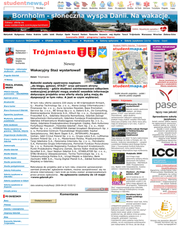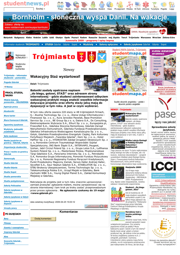 Szukaj ›› Praca Studia Języki Matura Studentka Student Kasa Po zajęciach Wiedza Hi-Tech Zdrowie Turystyka Pogoda Loguj Białystok Bydgoszcz Kielce Kraków Lublin Łódź Olsztyn Opole Poznań Radom Rzeszów Szczecin woj. śląskie Toruń Trójmiasto Warszawa Wrocław Zielona Góra Juwenalia 2009 - programy i opisy imprez Informator studencki TRÓJMIASTO • STUDIA Gdańsk Gdynia Sopot • Wydziały • Salony optyczne • Szkoły językowe Gdańsk Gdynia Sopot Student MAPA Gdańsk, Trójmiasto Najnowsze KONKURSY ! Studencka książka kucharska Trójmiasto - informator studencki - pomorskie Pogoda Gdańsk Newsy Wakacyjny Staż wystartował! Dział: Trójmiasto Newsy PRACA, STUDIA, NAUKA PRACA Gdańsk, pomorskie - OGŁOSZENIA Agencje pracy Baloniki zostały opatrzone napisem „do biegu, gotowi, STAŻ!" oraz adresem strony internetowej - gdzie studenci zainteresowani odbyciem wakacyjnej praktyki mogą znaleźć wszelkie informacje dotyczące projektu oraz oferty staży jaką mają do dyspozycji w tym roku. A jest w czym wybierać. W tym roku oferta zawiera 220 staży w 48 trójmiejskich firmach, tj.: Aluship Technology Sp. z o. o., Atena Us ługi Informatyczne i Biura karier Finansowe Sp. z o. o., Aura Jarosław Pawelak, Base Promotion Biura tłumacze ń Gdańsk Service Sp. z o.o., BE Group Sp.z o. o, Datera S.A., Ds Consulting, Elektrociepłownie Wybrzeże S.A., Elhurt Sp. z o. o., Europejskie.pl, Egzaminy językowe FreecoNet S.A., Gdańska Stocznia Remontowa, Gdański Zarząd Nieruchomości Komunalnych, Gdańska Fundacja Przedsiębiorczości, Wydzia ły, jednostki uczelniane Gdańska Infrastruktura Wodociągowo Kanalizacyjna Sp. z o. o., Gotyk, Gdańskie Przedsiębiorstwo Energetyki Cieplej, Park Kulturowy Koła naukowe Fortyfikacji Miejskich „Twierdza Gdańsk", Horn Sp. z o. o., Hotel Haffner Sp. z o. o., HYDROSTER Zakład Urządzeń Okrętowych Sp. z Nauka języków za granicą - Gdańsk, Gdynia o. o, Pomorskie Centrum Traumatologii Wojewódzki Szpital Specjalistyczny, ING Bank Śląski S.A., INTERVAPO_Peugeot, Organizacje studenckie Izohan, Jabil Circiut Poland Sp. z o. o., Grupa Lotos S.A., Lufthansa Praca i nauka za granicą System Poland Sp. z o. o., Masterlease Polska, Międzynarodowe Targi Gdańskie S.A., Panorama Internetu Sp. z o. o., Petrobaltic Gdańsk S.A, Pomorska Grupa Informatyczna, Pomorski Fundusz Pożyczkowy Samorz ądy Sp. z o. o, Pomorski Regionalny Fundusz Poręczeń Kredytowych, Punkt Przedszkolny Magiczny Zamek, Serwis Haller Andrzej Haller, Studia Gdańsk SeveNet S.A., Saur Neptun Gdańsk S.A., STABILATOR Sp. z o. o., Studia Gdynia STBU Brokerzy Ubezpieczeniowi, Terma Technologie Sp. z o. o, Telekomunikacja Polska S.A., Urząd Miejski w Gdańsku, Bank Studia Sopot Zachodni WBK S.A., Young Digital Planet S.A., Zakład Komunikacji Miejskiej w Gdańsku. Studia pomorskie Szkoły Policealne Szkoły językowe w Gdańsku Rekrutacja do projektu jest w tym roku znacznie uproszczonai: zamiast przesyłać zgłoszenie mailem, można zarejestrować się na stronie internetowej i tam krok po kroku zostać przeprowadzonym przez proces zgłoszenia . Na zgłoszenia czekamy do 19 maja! <www.gdansk.pl> Szkoły językowe w Gdyni Szkoły językowe w Sopocie data ostatniej modyfikacji: 2009-04-25 15:03:12 Urzędy pracy Komentarze PO ZAJĘCIACH Bary Fitness Gazety i czasopisma Imprezy Gda ńsk Kina Koncerty Gdańsk , Trójmiasto Kultura studencka Puby i Kawiarnie Szybki słownik angielsko - polski i słownik polsko-angielski NEWSY - Trójmiasto Akademiki Studia podyplomowe Kursy językowe w szkołach za granicą Wakacje z angielskim Obozy językowe Dodaj komentarz Wakacyjny Sta ż wystartował! Baloniki zostały opatrzone napisem „do biegu, gotowi, STAŻ!" oraz adresem strony internetowej - gdzie studenci zainteresowani odbyciem wakacyjnej praktyki mogą znaleźć wszelkie informacje dotyczące projektu oraz oferty sta ży jaką mają do dyspozycji w tym roku. A jest w czym wybierać. Wielka Lekcja Ekologii w Polskiej Księdze Rekordów i Osobliwości! Tego jeszcze nie było! To była najliczniejsza lekcja ekologii nie tylko w Europie, ale i na świecie. Jesteście rekordzistami! - oznajmił uczestnikom Wielkiej Lekcji Ekologii Dionizy Zejer z Towarzystwa Kontroli Rekordów Niecodziennych, który pełnił funkcję honorowego obserwatora tego wydarzenia. Sprawdzone szkoły językowe. Je żeli cenisz sobie nauk ę na najwy ższym poziomie, wybierz jedn ą ze szk ół z gwarancj ą jako ści PASE. Ka żda z nich zosta ła gruntownie sprawdzona przez niezale żnych inspektor ów, którzy m.in. obserwowali prowadzone zaj ę cia oraz badali kwalifikacje lektor ów. Poszukaj ich na www.pase.pl Medykalia 2009! Już 6-tego maja zaczynamy kolejną edycję dorocznych Dni Kultury Studenckiej - MEDYKALIA 2009. Przygotowania wrą. Będzie wiele niespodzianek, świetna zabawa i niesamowite wspomnienia. Studenci: „Do biegu gotowi...Staż” Od 22 kwietnia do 19 maja studenci wszystkich pomorskich uczelni (i nie tylko) mogą zgłaszać się do programu "Wakacyjny Staż" organizowanego przez Gdańskie Centrum Obsługi Przedsiębiorcy Urzędu Miejskiego w Gdańsku. Narodowy test z języka polskiego online Właśnie ruszył test, który pozwoli sprawdzić nasze umiejętności językowe. Czy umiemy poprawnie mówić po polsku? Może kaleczymy język i nawet o tym nie wiemy? Każdy może wziąć udział w teście i przekonać się, jak dobrze mówi po polsku. W teście znajdziemy pytania m.in. z ortografii, gramatyki i wymowy. Czterdzieści cztery pytania mają formę ankiety, na ich rozwiązanie przeznaczone jest maksymalnie 30 minut, ale tak długi czas nie jest potrzebny. Ruszyła sprzeda ż biletów na Festiwal LCCI International Qualifications Egzaminy Londy ńskiej Izby Przemys łowo-Handlowej s ą dost ę pne na rynku polskim ju ż w ponad 100 Akredytowanych Centrach Egzaminacyjnych . Stanowi ą presti żowe i rozpoznawalne na ca łym świecie świadectwo kompetencji ję zykowych w dziedz