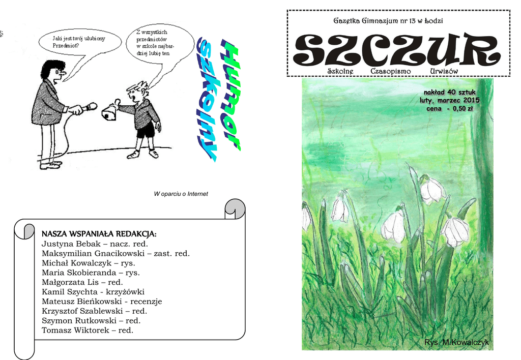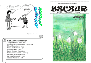 nakład 40 sztuk luty, marzec 2015 cena - 0,50 zł W oparciu o Internet NASZA WSPANIAŁA REDAKCJA: Justyna Bebak – nacz. red. Maksymilian Gnacikowski – zast. red. Michał Kowalczyk – rys. Maria Skobieranda – rys. Małgorzata Lis – red. Kamil Szychta - krzyżówki Mateusz Bieńkowski - recenzje Krzysztof Szablewski – red. Szymon Rutkowski – red. Tomasz Wiktorek – red. Rys. M.Kowalczyk 2 - SPIS TREŚCI I SŁOWO WSTĘPNE 2. SPIS TREŚCI I SŁOWO WSTĘPNE 3. WKŁADKA OKOLICZNOŚCIOWA 4. Z ŻYCIA SZKOŁY 5. WYWIADY 6. WYWIADY 7. Z ŻYCIA SZKOŁY 8. Z HARCERSKIM POZDROWIENIEM 9. Z ŻYCIA SZKOŁY 10. Z ŻYCIA SZKOŁY 11. Z ŻYCIA SZKOŁY 12. COMENIUS 13. COMENIUS 14. Z ŻYCIA SZKOŁY 15. Z ŻYCIA SZKOŁY 16. Z ŻYCIA SZKOŁY 17. Z ŻYCIA SZKOŁY 18. CZY WARTO PRZECZYTAĆ? 19. GIMNAZJALIŚCI TWORZĄ 20. KALENDARIUM 21. Z ŻYCIA SZKOŁY 22. Z ŻYCIA SZKOŁY 23. REFLEKSJE 24. HUMOR SZKOLNY Drodzy Czytelnicy, Uczniowie, Nauczyciele! Oddajemy w Wasze ręce lutowo-marcowy numer Szkolnego Czasopisma Urwisów. W tym numerze przeczytacie o przyjacielskich spotkaniach, konkursach, wycieczkach i wielu innych rzeczach... REDAKCJA REFLEKSJE... - 23 Wyposaż bibliotekę w nowe książki! Wystarczy zaliczyć kurs na bezpłatnej platformie e-learningowej, a zdobyte punkty wymienić na książki, które trafią do bibliotek szkolnych lub miejskich. To Ty zadecydujesz do której biblioteki wyślemy książkę! Darmowa platforma e-learningowa powstała w ramach projektu "Ambasadorzy Bezpiecznego Internetu". W jej skład wchodzi siedem szkoleń, z których dowiemy się m.in.: - jakie są zagrożenia i dobrodziejstwa Internetu, - co dzieje się w głowie dziecka w wieku wczesnoszkolnym, - dlaczego gry komputerowe uzależniają, - jak monitorować dostęp do Internetu na komputerze, tablecie czy telefonie komórkowym, - jakie zasady warto wpoić dziecku, zanim na dobre wsiąknie w cyberprzestrzeń. Każdy, kto przejdzie szkolenie na platformie, będzie mógł zdobyć nagrody w postaci atrakcyjnych książek i e-booków do szkolnych bibliotek. Do wygrania książki z wydawnictw: Znak, Prószyński, Akapit Press, Zielona Sowa, Afera, Nasza Księgarnia i Media Rodzina, w sumie prawie 600 tytułów! Udział w kursie Akademia Bezpiecznego Internetu jest bezpłatny. Wystarczy tylko się zalogować i postępować zgodnie z zamieszczonymi wskazówkami. Aby rozpocząć szkolenie wejdź na: ambasadorzy.kulturaonline.pl „Wyszperał” w Internecie – K. Szablewski 22 – Z ŻYCIA SZKOŁY WKŁADKA OKOLICZNOŚCIOWA - 3 POLSKA TRADYCJA? Czy warto kochać? Czy wiecie skąd pochodzi nazwa ‘Walentynki’’? Jest to święto zakochanych. Patronem walentynek jest św. Walenty. Był on biskupem, który udzielał ślubu młodym legionistom. Cesarz Klaudiusz II zabronił im wchodzenia w związki małżeńskie i nakazywał służyć w wojsku. Gdy biskup został nakryty, wtrącono go do więzienia. Walentynki przypominają nam o najbliższych. Nawet najmniejszy prezent lub kartka mogą sprawić drugiej osobie przyjemność. Nie zapominajmy o nich! Niestety Polacy bardzo często krytykują to „święto” jako zamerykanizowany zakupowy szał, który ma podnieść sprzedaż kwiatów lub misiów. CHWILA WSPOMNIEŃ Dnia 18 Grudnia 2014 roku Szkolne koło PCK miało ogromną przyjemność przygotować nową halę EXPO na Wigilię Dla Bezdomnych. Pod Opieką księdza Jacka Marciniaka i pani Joanny Domagały podopieczni mogli wykazać się sprytem oraz dobrym sercem. Wszyscy bardzo się starali, aby Ci ludzie też mieli swój piękny dzień, gdzie mogą wspólnym gronem zasiąść przy wigilijnym stole, podzielić się opłatkiem i zacząć spożywać potrawy. Wszyscy uczestnicy PCK okazali się być bardzo wrażliwymi ludźmi, ponieważ - robiąc przełom w stole sąsiedniego koła, oddali obiady dla wolontariuszy osobom bardziej potrzebującym. Uczestnikami uroczystości byli : ksiądz Jacek Marciniak, pani Joanna Domagała, Karolina Kryńska (kl. III c), Karolina Wojtysiak (kl. III c), Marta Jóźwiak (kl. III c), Magdalena Pisera (kl. II b), Ignacy Andrzejewski (kl. III a), Klaudia Stawińska ( kl. III c), Marek Kaczmarczyk (kl. III c), Anna Szrejter (kl. III c), Jan Pęczak (kl.IIIc), Julia Szulc (kl. III d), Karina Łaczkowska ( kl. III d), Julia Twardowska ( kl. III d), Maciek Kozłowski ( kl. III a), Dominik Szczerbicki (kl. III c). Magda Pisera Ostatki, czyli ostatni dzień karnawału, poprzedzający okres Wielkiego Postu. Zanim nadejdzie Środa Popielcowa, zgodnie ze staropolską tradycją, obchodzimy ostatki, w zależności od regionu kraju nazywane też mięsopustem, podkoziołkiem czy śledzikiem. Ostatni dzień karnawału na świecie jest nazywany często Mardi Gras, co znaczy „Tłusty wtorek”. Nazwa ta jest znana i używana w Stanach Zjednoczonych i Kanadzie (czasem też jako Pancake Tuesday, czyli „Naleśnikowy wtorek”), a także w Europie i Ameryce Łacińskiej. W Wielkiej Brytanii oraz Irlandii ostatki są nazywane „Shrove Tuesday”, w Niemczech – „Fasnacht”. Bliny królują na litewskim stole. W ostatki bliny je się w domu, w pracy, w szkołach i lokalach gastronomicznych. We wtorek świętu pożegnania zimy towarzyszą pochody przebierańców. Głównymi bohaterami są śmierć, diabeł, kozioł, Cygan i żebrak. Ich głośne zachowanie ma wystraszyć zimę i zmusić ją do ustąpienia. Karnawałowe i ostatkowe tradycje Związane z ostatkami przebieranie się w różne kostiumy, zwane w dawnej Polsce „maszkarami zapustnymi”, było popularne w zachodniej Europie już w średniowieczu. Najpopularniejszymi strojami w Polsce są : śmierć, cygan lub zwierzęta, np.niedźwiedzie Dni mięsopustne czyli ostatki miały też nazwę „dni szalonych”. W wiejskich gospodach odbywały się tańce i hulanki. My również w TRZYNASTCE przebraliśmy się, jak K. S sami widzicie na zdjęciu... 4 – Z ŻYCIA SZKOŁY Z ŻYCIA SZKOŁY - 21 Radosna GWIAZDKA w Domu Dziecka Ale macie prezentów, a j