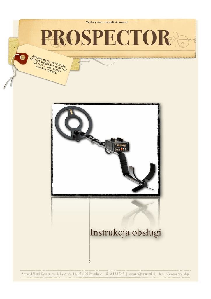 Wykrywacz metali Armand PROSPECTOR AR POL MAND M SKI E W E TA L D OD 1 9 8 Y K RY W E T E C T G WA 5 R . Z N A C Z E M O R S , AL RAN E T O W E Z I S K TA L I A ANE ! Instrukcja obsługi Armand Metal Detectors, ul. Ryszarda 44, 05-800 Pruszków | 512 138 545 | [email protected] | http://www.armand.pl ARMAND METAL DETECTORS! POLSKIE WYKRYWACZE METALI OD 1985 R. Instrukcja obsługi wykrywacza metali Armand Prospector Wyposażenie zestawu * Sonda z przewodem i rurką * Sterownik wykrywacza z rurką i podłokietnikiem * Rurka łącząca Przed uruchomieniem wykrywacza prosimy o przeczytanie instrukcji i zachowanie jej na przyszłość. Kompletny wykrywacz powinno się przechowywać w pomieszczeniu suchym, pozbawionym oparów kwasów i innych agresywnych substancji chemicznych. Jeżeli wykrywacz nie jest wykorzystywany przez dłuższy czas to należy wyjąć z niego baterie. Spis treści 1. Rozmieszczenie przełączników i elementów regulacyjnych 2. Montaż i uruchomienie wykrywacza 3. Opis elementów regulacyjnych wykrywacza 4. Praca z wykrywaczem 5. Zasady prowadzenia poszukiwań 6. Wymiana baterii 7. Rozwiązywanie problemów 8. Dane techniczne 9. Gwarancja 1. Rozmieszczenie przełączników i elementów regulujących a) na ściance przedniej wykrywacza Diody sygnalizujące poziom sygnału Przełącznik dyskryminacji Wyłącznik zasilania Przycisk zerowania Przełącznik kontroli stanu baterii Przełącznik rodzaju pracy statyczna - dynamiczna b) na ściance górnej wykrywacza Regulacja głośności Gniazdo słuchawek Regulacja dyskryminacji (odrzucania) Regulacja kompensacji wpływu gruntu Regulacja czułości Regulacja progu dźwięku c) na ściance tylnej wykrywacza Gniazdo wtyku sondy 2. Montaż i uruchomienie wykrywacza 1. Połączyć rurkę łączącą z sondą wykrywacza przez jej wsunięcie i zablokowanie zatrzasku sprężynującego w jednym z 5 otworów wywierconych w ściance rurki. Kulka zatrzasku sprężynującego powinna wystawać 2 – 3 mm ponad ściankę rurki. 2. Połączyć sondę z uchwytem wraz z zamontowanym na niej sterownikiem wykrywacza. Podobnie jak w pkt. 1 należy zablokować zatrzaskiem sprężynującym wzajemne położenie obu części. 3. Owinąć na rurce kabel sondy przy pomocy pasków rzepu tak, aby ściśle przylegał do rurki umożliwiając swobodne zmontowanie i zdemontowanie sondy. Wtyk kabla sondy wsunąć w gniazdo sterownika zwracając uwagę na zgodność klucza wtyku z wycięciem gniazda. Czynności te zabezpieczają wyrwanie kabla z sondy lub sterownika w trakcie eksploatacji oraz uszkodzenie gniazda. 4. Ustawić położenia: a) przełącznik dyskryminacji – dolne położenie (NIE) b) przełącznik rodzaju pracy – dolne położenie (DYN) I) przełącznik kontroli stanu baterii jest uchylny i ma: II) - położenie dolne, nieaktywne III) - położenie górne, aktywne, niestabilne d) wyłącznik zasilania – dolne położenie e) regulacja progu dźwięku – środkowe położenie (5 lub 6) f) regulacja głośności – prawe skrajne położenie (10) g) regulacja czułości – ustawić na (7) h) regulacja dopasowania do gruntu – środkowe położenie (0) i) regulacja dyskryminacji – środkowe położenie (5) 5. Unieść sondę nad gruntem pozbawionym przedmiotów metalowych i włączyć wyłącznik zasilania (górne położenie) 6. Regulacją „PRÓG DŹWIĘKU” osiągnąć ledwo słyszalny z głośnika wykrywacza. 7. Przesunąć na chwilę przełącznik „BAT” do góry – powinna świecić się niebieska dioda LED, co oznacza, że napięcie baterii jest poprawne. Wykrywacz jest gotowy do pracy. 3. Opis elementów regulacyjnych wykrywacza Funkcje poszczególnych elementów regulacyjnych i użytkowych 1. Włącznik zasilania – górne położenie oznacza włączenie wykrywacza. Jednocześnie z włączeniem świeci jedna z diod LED wskaźnika diodowego. 2. Przełącznik BAT służy do kontroli napięcia baterii. W momencie naciśnięcia przełącznika do góry sprawdzany jest poziom napięcia baterii sygnalizowany przez wskaźnik diodowy. Przy poprawnym napięciu baterii świeci się jedna z diod LED w kolorze niebieskim. Przy częściowo rozładowanej baterii świeci się dioda w kolorze żółtym. Przy całkowicie rozładowanych bateriach świeci się jedna z diod LED w kolorze czerwonym lub nie świeci się żadna dioda. Przy rozładowywaniu się baterii jest słyszalny przerywany dźwięk. Przy całkowitym rozładowaniu się baterii ten dźwięk nie jest słyszalny i żadna z diod się nie świeci. 3. Przycisk ZER służy do osiągania poprawnego poziomu sygnału w statycznym rodzaju pracy. Przy znacznych odstrojeniach wstępnych czas przyciśnięcia przycisku ZER powinien wynosić 2 – 3 s. Przycisku ZER używa się, gdy sonda wykrywacza znajduje się w otoczeniu neutralnym, pozbawionym przedmiotów metalowych przy gruncie (a nie w powietrzu). 4. Przełącznik rodzaju pracy STAT/DYN jest przeznaczony do ustawiania statycznego lub dynamicznego rodzaju pracy, których właściwości zostały opisane w dalszej części instrukcji. 5. Przełącznik dyskryminacji umożliwia załączenie układu eliminującego sygnały pochodzące od przedmiotów zawierających żelazo. Przełącznik jest aktywny w statycznym rodzaju pracy. Armand Metal Detectors, ul. Ryszarda 44, 05-800 Pruszków | 512 138 545 | [email protected] | http://www.armand.pl ARMAND METAL DETECTORS! 6. Regulacja PRÓG DŹWIĘKU służy do ustawienia wstępnego poziomu dźwięku przy sondzie umieszczonej w otoczeniu pozbawionym przedmiotów metalowych. Poprawne ustawienie progu to ledwo słyszalny dźwięk z głośnika wykrywacza. Ustawienie progu powinno być poprzedzone naciśnięciem przycisku ZER (w ustawieniu pracy statycznej). 7. Regulacja GŁOŚNOŚĆ określa poziom natężenia dźwięku pochodzącego z głośnika lub słuchawek. Ustawienie maksymalnego poziomu dźwięku wpływa na szybsze rozładowanie baterii. 8. Regulacja CZUŁOŚĆ ustawia żądany poziom zasięgu