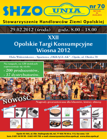 nr 70 SHZO Od 13.02 do 29.02.2012 Stowarzyszenie Handlowców Ziemi Opolskiej 29.02.2012 (środa) godz. 8.00 – 18.00 XXII Opolskie Targi Konsumpcyjne Wiosna 2012 Hala Widowiskowo – Sportowa „OKRĄGLAK” - Opole, ul. Oleska 70 Na targach, na 120 stoiskach zaprezentuje się około: - 200 producentów, - 37 dystrybutorów. Ć Ś O NOW 20 z wi amó eń Nagrody gwarantowane dla klientów, którzy zbiorą: 30 z wi amó eń 40 z wi amó eń Opole 45-565, ul. Obr. Stalingradu 66, tel. 77 456 78 50 w. 113, fax wew. 125 kom. 0 601 44 94 90 - 0 665 449 700 e-mail: [email protected], www.shzo.opole.pl od 1989r. Spółdzielnia Obrotu Towarowego przemysłu mleczarskiego agra Białystok 15-959, ul. Handlowa 4 filia cHORZÓW: Chorzów batory 41-506, ul.piekarska 1/3 tel. 032 349-90-12, 032 349-90-14 fax: 032 349-90-17, 032 349-90-18 agra oferta ważna 13.02 - 25.02 Agra Opole Telefon: +48 (0-77) 456 78 50, fax: +48 (0-77) 453-05-76 45-565 Opole, ul. Obrońców Stalingradu 66, [email protected], www.agra.opole.pl telefon kontaktowy do przedstawicieli handlowych: 608 59 29 83, 608 56 42 86 2,04 zł netto 2,18 zł netto MLEKO WIEJSKIE 2%, 3,2% 1L Śmietana 10%, 12%, 18%, 22% 200g mlekpol 1,60 zł netto 1,70 zł ceko 2,25 zł 16,40 zł netto netto netto 1,65 zł netto ŚMIETANKA ŁACIATA UHT 12%, 18%, 30% 250G 0,58 zł netto JOGURT MILKO NATURALNY 500G SER JAGNA KG łapy 1,25 zł JOGURT MULLER 125G ASORT. netto mÜller 0,96 zł netto KEFIR 0% 400G BUTELKA JOGURT FROOP 150G ASORT. MAŚLANKA NATURALNA 400G maspex mokry netto POLONIA IDC 1,25 zł agra 9,66 zł netto 11,88 zł brutto Kart. 1L czerwony grejpfrut Creme sensazione 100g słoik Nescafe Kart. 1L jabłko 100% netto netto brutto 3,33 zł 3,50 zł Kart. 1L cz. porzeczka, pomarańcz classic, pomar. czer. z Sycylii 2,16 zł 2,27 zł Kart. 1L jabłko-cynamon ! 1 + 0 1 CJA PROMO Ustronianka asortyment od 1989r. www.agra.opole.pl, Telefon: +48 (0-77) 456 78 50, fax: +48 (0-77) 453-05-76 www.agra.opole.pl, Telefon: +48 (0-77) 456 78 50, fax: +48 (0-77) 453-05-76 netto netto Kart. 1L pomidor classic brutto 2,98 zł brutto 2,65 zł Kubus Waterrr 0,5L Sport citrus, jagoda 2,84 zł Kart. 1L multiwitamina 1,92 zł 2,52 zł netto brutto Kub.WATER 0.5l cytryna, jabłko, truskawka, malina WODA 1,56 zł brutto netto 1,65 zł netto 2,65 zł 1,34 zł brutto 2,52 zł Ketchup Łagodny, Pikantny 425g netto 3,33 zł netto 3,17 zł brutto 3,37 zł netto netto 3,12 zł brutto brutto netto 1,34 zł brutto Kubuś 0.4L Play mar-czeres-limet., mar-cz. pom-lim., mar-mal-limetka, mar-trusk-limet., cz. Porzeczka, multiwitamina 1,09 zł od 1989r. 1,62 zł brutto netto 1,54 zł Kostka 60g*32 drobiowa, warzywna, wołowa 1,54 zł netto netto 6,69 zł brutto 6,19 zł Baton Kit Kat chunky 24x46g, Kit Kat carmel 36x42g, Kit Kat white 36x42g 1,43 zł 2,40 zł Musztarda sarepska 185g, rosyjska 180g, delikatesowa 185g Pies 1200g dziczyzna-wołowina, kurczak-szynka, wołowina puszka netto netto netto 0,97 zł Baton Lion 40x43g, Lion biały 40x43g, Lion Peanut 42*41g brutto brutto 0,79 zł 1,95 zł USTRONIANKA netto brutto Pies Junior 400g kurczak, jagnięcina puszka 2,25 zł Pomysl kurczak z papryką 48g, kurczak śmiet-ziołow 30g, zap.ziem.z kielb.i ceb., zap.ziem.z mies.miel 42g, zapiekanka serowa 49g, zapiekanka z szyn. 40g 1,65 zł Fel Kot kurczak, królik, łosoś, wołowina 100g saszetka brutto 3,23 zł 2,08 zł 1,53 zł netto netto Kot 400g kurczak, ryba, wołowina puszka Fix 2w1 chrupery + dip serowy, barbeque 2,99 zł brutto 2,07 zł OŚĆ! W NO brutto Pies 0,5kg kurczak, wołowina suchy Nudle z patelni curry, po chińsku, gulasz 62g 1,92 zł brutto 3,23 zł 1,45 zł Papryka ostra, słodka, Liście laurowe, Pieprz czarny mielony, ziarnisty, Ziele angielskie MASPEX MOKRY 2,99 zł 1,34 zł brutto netto Majonez czosnkowy 400ml netto Sos barbeque, chili, burger 250ml BUTCHERS 5,67 zł brutto 4,31 zł WINIARY 5,25 zł netto 3,99 zł brutto UNILEVER OŚĆ! W NO 1,47 zł Przyp do mięsa wieprzowego,mielonego, do bigosu i potraw z kapus, do flaków, Pieprz ziołowy, czosnek granulowany brutto H Minutka 28x2g dz.róża+mal+żur, jeż- Cap.Kart.Brandy, cherry, czekolada, z magnezem, orzechowe, rumowe, śmietankowe, waniliowe, po wiedeńsku 10x15g -mal-jag, mal-tru-granat, wiś-żur-granat 1,36 zł brutto netto 1,46 zł brutto brutto 0,50 zł netto netto 2,88 zł 1,19 zł brutto netto 0,41 zł brutto MOKATE 2,74 zł Minutka zielona z cytryną, maliną, opuncją 25+3 2,34 zł KAMIS 2,23 zł agra brutto 3,62 zł Seler 370ml Pieczarki marynowane 370ml netto brutto netto 3,77 zł netto 2,00 zł 3,49 zł brutto netto 3,35 zł Fasola biała, czerwona 425ml puszka brutto netto netto netto brutto Groszek kons. 200g 1,61 zł VERNET Kukurydza zł. 340g netto 2,00 zł 1,49 zł brutto netto 2,37 zł 1,85 zł 1,85 zł 1,64 zł herbata cytrynowa, jabłko-mięta, leśna, malina, multiwitamina, rum z miodem, zielona z limonką, earl gray, pu erh 300g brutto netto brutto 2,19 zł Pieczarki marynowane tradycyjne 750g brutto brutto netto brutto KRÜGER 1,52 zł 5,82 zł ROLNIK 2,75 zł 5,39 zł Pieczarki marynow lag z koperkiem, tradycyjne 280g Kukur.zł. + czerw.fasola 170g, Kukur.zl. + groszek 170g, Miesz.meksykanska MEXICO 170g 2,55 zł Wit mus Magnez+B6 86g, Calcium 84g, Multiwitamina 90g, „C” 84g 2,91 zł Sałatka szwedzka 500ml łagodna, ostra Piecz.LEKKIE 170G.”7”ziar.b/cuk., słonecznikowe, razowe z miodem, z orkiszem i dynią, słonecznikowe, żytnie b/cuk 4,16 zł 2,97 zł netto netto 3,37 zł 3,85 zł 2,69 zł brutto 3,12 zł Kasza 4*100g gryczana kart. 2,75 zł brutto brutto 3,31 zł netto 3,15 zł Ryż 4*100g biały kart. 2,05 zł Wafle ryżowe 100g 7 ziar.z ryz., 130g musli z kokos., 100g naturalne, słone, słonecznik, z pestek dyń, z popcornem, Multigrain brutto Ryż 4*100g naturalny brązowy netto netto 2,09 zł 1,95 zł brutto netto 2,36 zł 1,99 zł brutto 2,25 zł BONDUELLE SONKO WY! ENO HIT C Szparagi 370ml Zaprawa cytrynowa 1000ml 2,79 zł netto 3,01 zł brutto 1,83 zł netto 