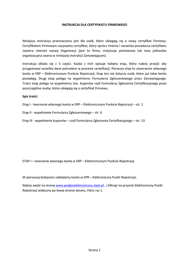 INSTRUKCJA DLA CERTYFIKATU FIRMOWEGO Niniejsza instrukcja przeznaczona jest dla osób, które ubiegają się o nowy certyfikat Firmowy. Certyfikatem Firmowym nazywamy certyfikat, który oprócz imienia i nazwiska posiadacza certyfikatu zawiera również nazwę Organizacji (jest to firma, instytucja państwowa lub inna jednostka organizacyjna zwana w niniejszej instrukcji Zamawiającym). Instrukcja składa się z 3 części. Każda z nich opisuje kolejny etap, który należy przejść aby przygotować wszelkie dane potrzebne w procesie certyfikacji. Pierwszy etap to utworzenie własnego konta w ERP – Elektronicznym Punkcie Rejestracji. Etap ten nie dotyczy osób, które już takie konto posiadają. Drugi etap polega na wypełnieniu Formularza Zgłoszeniowego przez Zamawiającego. Trzeci etap polega na wypełnieniu tzw. Kuponów czyli Formularzy Zgłoszenia Certyfikacyjnego przez poszczególne osoby, które ubiegają się o certyfikat Firmowy. Spis treści: Etap I - tworzenie własnego konta w ERP – Elektronicznym Punkcie Rejestracji – str. 1 Etap II - wypełnianie Formularza Zgłoszeniowego – str. 6 Etap III - wypełnianie kuponów – czyli Formularza Zgłoszenia Certyfikacyjnego – str. 13 ETAP I – tworzenie własnego konta w ERP – Elektronicznym Punkcie Rejestracji. W pierwszej kolejności zakładamy konto w EPR – Elektroniczny Punkt Rejestracji. Należy wejść na stronę www.podpiselektroniczny.slask.pl , i kliknąć na przycisk Elektroniczny Punkt Rejestracji widoczny po lewej stronie ekranu. Patrz rys 1. Strona 1 Rys. 1. Wtedy nastąpi przekierowanie do Elektronicznego Punktu Rejestracji, gdzie należy rozpocząć procedurę zakładania konta. Patrz rys. 2. Rys. 2. Przyciskamy myszką w miejscu wskazanym przez kursor na Rys. 2. Zostaniemy przekierowani do krótkiego formularza, który należy wypełnić w celu utworzenia konta z pozycji którego będzie można wypełnić Formularze. Wpisane do formularza hasło musi zawierać przynajmniej 8 znaków, w tym przynajmniej jeden raz musi występować wielka litera, mała litera, Strona 2 cyfra i symbol (np. !, @, #, $ itp.). Wpisane hasło proszę zapamiętać, gdyż będzie potrzebne w przyszłości np. do odnowienia certyfikatu. Procedura przypomnienia/zmiany hasła opisana jest w osobnej instrukcji. Wzór wypełnienia znajduje się na Rys. 3. Rys. 3. Strona 3 Po wypełnieniu formularza zgodnie z powyższym wzorem przyciskamy myszką w miejscu wskazanym przez kursor na Rys. 3. Po wciśnięciu tego przycisku pojawi się komunikat na żółtym tle - patrz Rys. 4. Rys. 4. Kod aktywacyjny przesyłany jest na adres e-mail niemal natychmiast, należy więc sprawdzić na swojej skrzynce pocztowej czy w poczcie przychodzącej pojawił się mail o tytule: Kod aktywacyjny – przykład na Rys. 5. Uwaga: jeżeli nie otrzyma się takiego maila, zaleca się po upływie np. 30 minut skontaktować się z infolinią Sigillum ( tel. 22 464 79 79 w godz. 7 – 15) celem wyjaśnienia przyczyny. Rys 5. W czasie do 12 godzin od przesłania formularza należy otworzyć ten e-mail i kliknąć na załączony link – patrz Rys. 6. Rys. 6. Kliknięcie spowoduje otwarcie się konta EPR z komunikatem na żółtym tle: „Aktywacja konta zakończyła się sukcesem”. Patrz Rys. 7. Rys 7. Strona 4 Na tym kończy się pierwszy etap załatwienia certyfikatu. Kolejnym etapem będzie zalogowanie się do założonego konta oraz wypełnienie stosownych formularzy. Przejdź do Etapu II. Uwaga: Aktywacja nie zakończy się sukcesem, jeżeli przekroczony został czas 12 godzin od założenia konta, zobaczymy wtedy następujący ekran – patrz Rys. 8. Rys. 8. Wtedy należy wpisać swój e-mail , hasło i wcisnąć przycisk: „Wyślij ponownie link aktywacyjny”. Patrz Rys. 9. Rys. 9. Po otrzymaniu nowego e-maila z kodem aktywacyjnym należy powtórzyć czynności pokazane na Rys. 6 i 7. Strona 5 ETAP II – wypełnianie Formularza Zgłoszeniowego. Należy zalogować się do utworzonego konta EPR wpisując swój e-mail oraz hasło. Patrz Rys. 10. Rys. 10. Po zalogowaniu się na konto, po lewej stronie zobaczymy menu, w sekcji „Certyfikat firmowy” przyciskamy opcję: „Nowy”. Patrz Rys. 11. Rys. 11. Na ekranie pojawi się tzw. przyjazna nazwa sprawy, którą możemy zmienić np. wpisując nazwę naszej Firmy. Pod nazwą sprawy zobaczymy listę nazw miast, w których znajdują się Punkty Rejestracji. Śmiało wybieramy Punkt Rejestracji w Bytomiu – patrz Rys. 12. Strona 6 Rys. 12. Następnie po prawej stronie pojawi się adres Punktu Rejestracji i nazwa firmy prowadząca ten Punkt – należy na ten tekst kliknąć i kiedy podświetli się na niebiesko przycisnąć przycisk „Dalej” – patrz Rys. 13. Rys. 13. Wtedy na ekranie wyświetli nam się FORMULARZ ZGŁOSZENIOWY – będzie on stanowił załącznik nr 2 do Umowy pomiędzy Zamawiającym a Polską Wytwórnią Papierów Wartościowych S.A. Treść umowy jest publikowana na stronach: www.podpiselektoniczny.slask.pl w zakładce: „Do pobrania” lub na stronie www.sigillum.pl w zakładce: „Repozytorium”. Zachęcamy do zapoznania się z jej treścią przed udaniem się do Punktu Rejestracji. Powyżej formularza znajduje się komunikat informacyjny. Patrz Rys. 14. Strona 7 Rys. 14. W przypadku pozostawienia pustymi pól oznaczonych gwiazdką podczas próby wysyłania formularza pojawią się komunikaty o błędach i będzie trzeba te pola uzupełnić, w przypadku gdy pole nie jest obowiązkowe np. nr faxu to jeżeli nie chcemy go wypełniać wpisujemy myślnik: „-„ ,w przypadku wątpliwości co mamy wpisać w dane pole korzystamy z pomocy (dostępnej po najechaniu myszką na dane pole). Część A – Formularza Zgłoszeniowego – DANE ZAMAWIAJĄCEGO. W tej części podajemy pełną nazwę i adres Zamawiającego. W przypadku, gdy nie jest to firma zapisana w odpowiednich rejestrach w polu A3 wpisujemy np. jednostka budżetowa, jednostka samorządu terytorialnego itd. w polu A4 i A5 n
