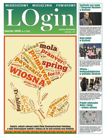 MŁODZIEŻOWY marzec 2016 nr 2 (52) MIESIĘCZNIK POWIATOWY GAZETA BEZPŁATNA ISSN 2081 – 7177 Spotkanie przy kawie z Tomaszem Raczkiem w Gryficach Dnia 9 marca 2016 roku o godzinie 18:00 w Miejskiej Bibliotece Publicznej w Gryficach gościem specjalnym był Tomasz Raczek. Kolejne „Spotkanie przy kawie” odbyło się ze znanym krytykiem filmowym, publicystą oraz autorem programów telewizyjnych i radiowych. STR. 9 Dzień Kobiet w Gryficach Dnia 8 marca obchodziliśmy Dzień Kobiet. Jak co roku obowiązkiem było, by panowie zadbali o drobne upominki dla pań. Oprócz tego Gryfice miały do zaoferowania wiele atrakcji. STR. 3 4Phone – miniprzedsiębiorstwo w gryfickim Chrobrym W Liceum Ogólnokształcącym im. Bolesława Chrobrego w Gryficach działa grupa uczniów, która wspólnymi siłami założyła firmę 4Phone. Ich celem jest wygranie ogólnopolskiego konkursu na najlepsze miniprzedsiębiorstwo. STR. 6 Projekt edukacyjny Dzieci z Kamp – kolejna odsłona Ciepłych, pełnych radosnej nadzei Świąt Zmartwychwstania Pańskiego, a także interesujących spotkań z budzącą się do życia przyrodą życzy Redakcja W ramach projektu edukacyjnego „Dzieci z Kamp” uczniowie klasy pierwszej pod opieką pani profesor Anny Kupczyk i pani profesor Joanny Żoły, odwiedzili naszych zachodnich sąsiadów. STR. 6 2 NR 2 (52) MARZEC 2016 AKTUALNOŚCI Drodzy Czytelnicy, z okazji zbliżających się ŚWIĄT WIELKANOCNYCH pragnę złożyć całej społeczności szkolnej oraz wszystkim czytelnikom LOgina świąteczne życzenia. Niech Zmartwychwstanie Pańskie napełni Was miłością, spokojem i nadzieją odradzającego się życia. Niech każdy świąteczny dzień przynosi wiosenny powiew radości, która będzie stanowiła pretekst do serdecznych spotkań w gronie rodziny i wśród przyjaciół. Jolanta Folwarska dyrektor Liceum Ogólnokształcącego im. Bolesława Chrobrego w Gryficach W tym niezwykłym czasie pragnę wraz z moimi współpracownikami życzyć wszystkim czytelnikom LOginu, młodym ludziom aby Święta Wielkanocne obudziły w Was uśpione marzenia, a czas spędzony w gronie najbliższych obfitował w wiarę, miłość i nadzieję. Życzę abyście mieli siłę powstać gdy upadniecie a każdy upadek był tylko kolejną lekcją życia. Przemek Kowalewski Zarządca Gryf Areny Sonda Wielkanocna Wielkanoc to najważniejsze święto w Kościele katolickim. To czas skupienia się nad męką i radosnym zmartwychwstaniem Chrystusa. Jak obchodzą je nasi nauczyciele i uczniowie? Oto odpowiedź: cja. Po śniadaniu świątecznym w niedzielę spędzamy czas z całą rodziną, która nas odwiedza. Pani Agnieszka Wielgus – nauczyciel języka polskiego w LO Chrobry Święta Zmartwychwstania Pańskiego spędzam z rodziną. Co roku z najbliższymi wyjeżdżam do moich rodziców, mieszkających na Dolnym Śląsku. Wszyscy razem uczestniczmy w obchodach Triduum Paschalnego w Kościele. W Niedzielę Zmartwychwstania Pańskiego zasiadamy do śniadania wielkanocnego, a następnie wraz z dziećmi szukamy prezentów pozostawionych przez zajączka w ogrodzie. Bartek Kmita kl. I d Wielkanoc obchodzę z rodziną. Razem uczestniczymy w liturgii Wielkiego Tygodnia. Wspólne przygotowywanie ozdób, malowanie pisanek, przystrajanie domu, to już nasza tradyMŁODZIEŻOWY MIESIĘCZNIK POWIATOWY Pan Dawid Siekierski – nauczyciel historii w LO Chrobry W Święta Wielkiej Nocy z najbliższymi przygotowujemy ozdoby, malujemy pisanki, przystrajamy dom, a w Niedzielę Zmartwychwstania po wspólnym śniadaniu odwiedzamy rodzinę i spędzamy z nimi czas. Anita Braun kl. I f W Święta Wielkiej Nocy zawsze uczestniczę w liturgii Triduum Paschalnego. Odkąd pamiętam, zawsze przygotowywałam mnóstwo ozdób, malowałam pisanki, stroiłam koszyczki do święcenia pokarmów. W niedzielę za- LOgin – młodzieżowy miesięcznik powiatowy Adres redakcji: 72-300 Gryfice, ul. Wałowa 18 e-mail: [email protected] wsze uczestniczę w Rezurekcji, po której z najbliższymi zasiadamy przy świątecznym stole. Później jest czas na odwiedziny najbliższych. Edyta: Zawsze siadamy do śniadania o 10.30, po kościele. Zawsze też jest sałatka jarzynowa. Mama obowiązkowo sama robi stroik świąteczny na stół. Pani Anna Staliś – nauczyciel geografii oraz biologii w LO Chrobry W moim rodzinnym domu podczas przygotowań świątecznych wykonujemy wspólnie tradycyjnymi sposobami pisanki. Święta spędzam wyłącznie w gronie najbliższej rodziny. Jestem typową domatorka, dlatego nigdzie nie wyjeżdżam, a wręcz przeciwnie, sama chętnie zapraszam rodzinę do siebie. Korzystając z okazji, wszystkim czytelnikom Loginu składam najserdeczniejsze życzenia świąteczne. Pan Tomasz: Idziemy ze święconką do kościoła, a później wszyscy na śniadanie do teściowej. Pani Anna: tradycje świąteczne związane są przede wszystkim z rezurekcją, świątecznym śniadaniem, stukaniem się jajkami. Wydawca: Liceum Ogólnokształcące im. Bolesława Chrobrego w Gryficach (NIP 857-14-96-576) 72-300 Gryfice, ul. Wałowa 18 tel. 91 384 26 70 Redaktor naczelny: Joanna Kubera Korekta: Joanna Supernak-Bielicka Agnieszka Wielgus Aleksandra Maliborska Redaktorzy: Aleksandra Iwańczak Damian Rynkiewicz Dorota Gryta Daniel Tomicki Daria Karina Szalast Pani Beata: Robimy razem pisanki, niesiemy koszyczek do święcenia, zasiadamy wspólnie do śniadania, stukamy się jajkami. Pani Krystyna: tradycyjnie na święta wędzimy kiełbasę, szynkę, święcimy potrawy, malujemy jajka. W sobotę zawsze obowiązuje u nas absolutny post, do dzieci przychodzi zajączek, no i oczy- Grzegorz Gawlik Joanna Zapaśnik Julia Manturuk Karolina Czerwonka Kevin Ziętek Klaudia Szarwarzyn Klaudia Tylus Magdalena Górska Martyna Szawarska Sandra Łochoziak Szymon Eliasz Wiktoria Mazur wiście oblewamy się wodą w śmigus-dyngus. Szymon Eliasz, Kevin Ziętek, ZSP im. Z. Herberta w Trzebiatowie Paulina Zając Piotr Karelus Druk: Drukarnia Prasowa GRUPY W