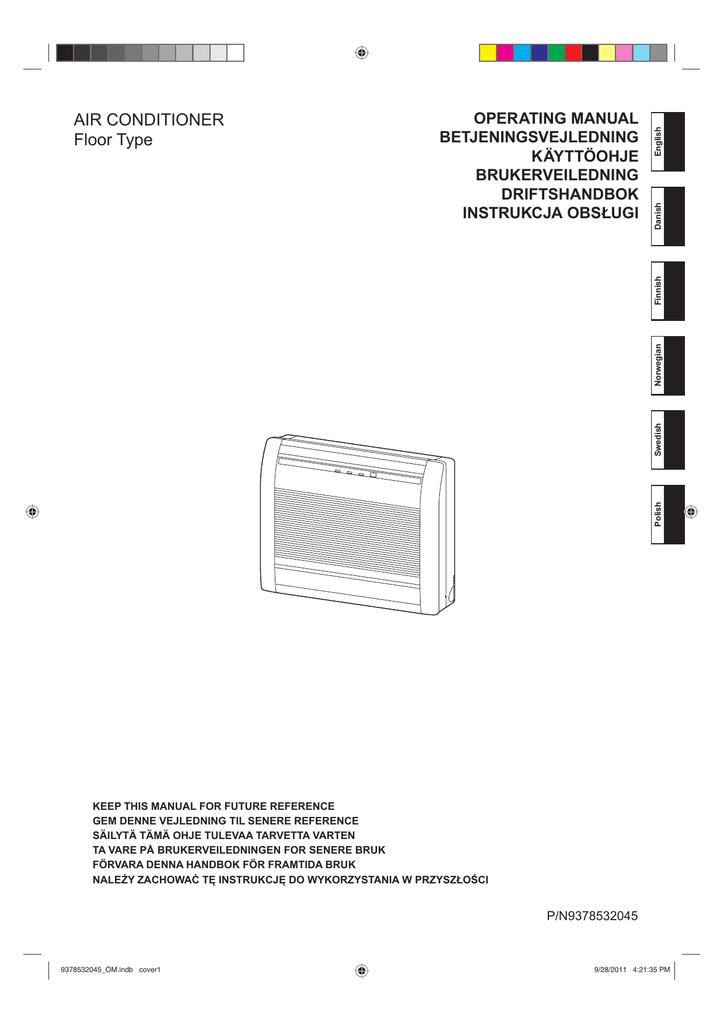 English Danish OPERATING MANUAL BETJENINGSVEJLEDNING KÄYTTÖOHJE BRUKERVEILEDNING DRIFTSHANDBOK INSTRUKCJA OBSŁUGI Polish Swedish Norwegian Finnish AIR CONDITIONER Floor Type KEEP THIS MANUAL FOR FUTURE REFERENCE GEM DENNE VEJLEDNING TIL SENERE REFERENCE SÄILYTÄ TÄMÄ OHJE TULEVAA TARVETTA VARTEN TA VARE PÅ BRUKERVEILEDNINGEN FOR SENERE BRUK FÖRVARA DENNA HANDBOK FÖR FRAMTIDA BRUK NALEŻY ZACHOWAĆ TĘ INSTRUKCJĘ DO WYKORZYSTANIA W PRZYSZŁOŚCI P/N9378532045 9378532045_OM.indb cover1 9/28/2011 4:21:35 PM CONTENTS SAFETY PRECAUTIONS........................................En-2 FEATURES AND FUNCTIONS ...............................En-3 NAME OF PARTS ...................................................En-4 PREPARATION .......................................................En-6 OPERATION............................................................En-7 TIMER OPERATION ...............................................En-9 SLEEP TIMER OPERATION .................................En-10 ADJUSTING THE DIRECTION OF AIR CIRCULATION ............................................... En-11 AIR OUTLET SELECTION ....................................En-12 10°C HEAT OPERATION ......................................En-13 ECONOMY OPERATION ......................................En-13 SWING OPERATION ............................................En-14 MANUAL AUTO OPERATION ...............................En-14 CLEANING AND CARE .........................................En-15 TROUBLESHOOTING ..........................................En-17 OPERATING TIPS .................................................En-18 SAFETY PRECAUTIONS ● Before using the appliance, read these “PRECAUTIONS” thoroughly and operate in the correct way. ● The instructions in this section all relate to safety; be sure to maintain safe operating conditions. ● “WARNING” and “CAUTION” have the following meanings in these instructions: WARNING This mark indicates procedures which, if improperly performed, might lead to the death or serious injury of the user. CAUTION This mark indicates procedures which, if improperly performed, might possibly result in personal harm to the user, or damage to property. WARNING ● Do not attempt to install this air conditioner by yourself. ● This unit contains no user-serviceable parts. Always consult authorized service personnel for repairs. ● When moving, consult authorized service personnel for disconnection and installation of the unit. ● Do not become excessively chilled by staying for lengthy periods in the direct cooling airflow. ● Do not insert anything into the Airflow direction. ● Do not start and stop air conditioner operation by disconnecting the power supply cord. ● Take care not to damage the power supply cord. ● In the event of a malfunction (burning smell, etc.), immediately stop operation, disconnect the power supply plug, and consult authorized service personnel. ● If the power supply cord of this appliance is damaged, it should only be replaced by the authorized service personal, since special purpose tools and specified cord are required. ● In the event of refrigerant leakage, be sure to keep away from fire or any flammables. (consult an authorized service personnel) CAUTION ● Provide occasional ventilation during use. ● Do not direct airflow at fireplaces or heating apparatus. ● Do not climb on, or place objects on, the air conditioner. ● Do not hang objects from the indoor unit. ● Do not set flower vases or water containers on top of air conditioners. ● Do not expose the air conditioner directly to water. ● Do not operate the air conditioner with wet hands. ● Do not pull power supply cord. ● Turn off power source when not using the unit for extended periods. ● Check the condition of the installation stand for damage. ● Do not place animals or plants in the direct path of the airflow. ● Do not drink the water drained from the air conditioner. ● Do not use in applications involving the storage of foods, plants or animals, precision equipment, or art works. ● Connection valves become hot during Heating; handle with care. ● Do not touch the aluminum fins of heat exchanger built-in the indoor or outdoor unit to avoid personal injury when you install or maintain the unit. ● Do not apply any heavy pressure to radiator fins. ● Operate only with air filters installed. ● Do not block or cover the intake grille and outlet port. ● Ensure that any electronic equipment is at least 1 m away from either the indoor or outdoor units. ● Avoid installing the air conditioner near a fireplace or other heating apparatus. ● When installing the indoor and outdoor unit, take precautions to prevent access to infants. ● Do not use inflammable gases near the air conditioner. ● Do not sit and place anything on the unit. En-2 9378532045_OM.indb 2 ● This appliance is not intended for use by persons (including children) with reduced physical, sensory or mental capabilities, or lack of experience and knowledge, unless they have been given supervision or instruction concerning use of the appliance by a person responsible for their safety. Children should be supervised to ensure that they do not play with the appliance. 9/28/2011 4:21:41 PM FEATURES AND FUNCTIONS ■ Energy saving and Comfortable function ■ Clean function INVERTER MILDEW-RESISTANT FILTER At the start of operation, large amount of power is used to bring the room quickly to the desired temperature. Afterwards, the unit automatically switches to a low power setting for economic and comfortable operation. AUTO CHANGEOVER The operation mode (cooling, dry, heating) is switched automatically to maintain the set temperature, and the temperature is kept constant at all times. 10°C HEAT OPERATION The room temperature can be maintained at 10°C so as to prevent the room temperature from falling too far. SUPER QUIET OPERATION When the FAN button is used to select QUIET, the unit begins super