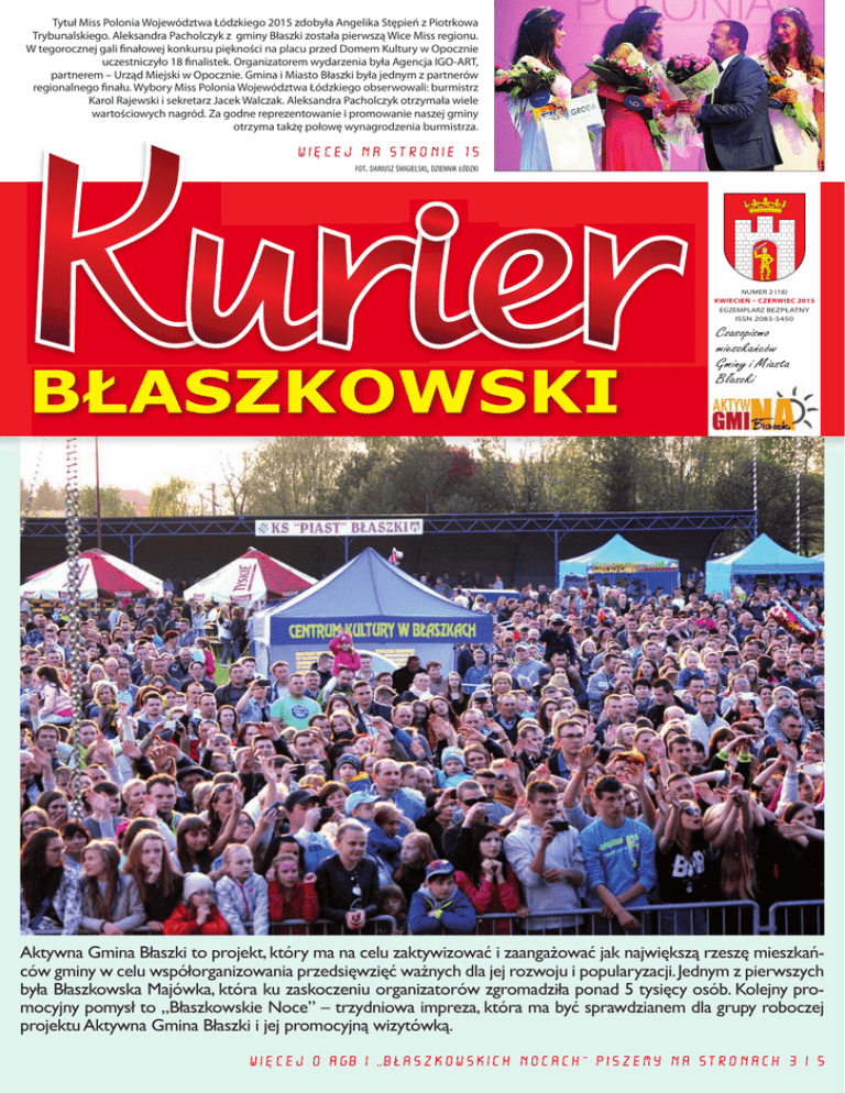 Tytuł Miss Polonia Województwa Łódzkiego 2015 zdobyła Angelika Stępień z Piotrkowa Trybunalskiego. Aleksandra Pacholczyk z gminy Błaszki została pierwszą Wice Miss regionu. W tegorocznej gali finałowej konkursu piękności na placu przed Domem Kultury w Opocznie uczestniczyło 18 finalistek. Organizatorem wydarzenia była Agencja IGO-ART, partnerem – Urząd Miejski w Opocznie. Gmina i Miasto Błaszki była jednym z partnerów regionalnego finału. Wybory Miss Polonia Województwa Łódzkiego obserwowali: burmistrz Karol Rajewski i sekretarz Jacek Walczak. Aleksandra Pacholczyk otrzymała wiele wartościowych nagród. Za godne reprezentowanie i promowanie naszej gminy otrzyma takżę połowę wynagrodzenia burmistrza. fot. dariusz śmigielski, dziennik łódzki nUMeR 2 (18) kwiecień – czerwiec 2015 eGZeMPLARZ BeZPŁATnY ISSn 2083-5450 Błaszkowski Czasopismo mieszkańców Gminy i Miasta Błaszki Aktywna Gmina Błaszki to projekt, który ma na celu zaktywizować i zaangażować jak największą rzeszę mieszkańców gminy w celu współorganizowania przedsięwzięć ważnych dla jej rozwoju i popularyzacji. Jednym z pierwszych była Błaszkowska Majówka, która ku zaskoczeniu organizatorów zgromadziła ponad 5 tysięcy osób. Kolejny promocyjny pomysł to „Błaszkowskie Noce” – trzydniowa impreza, która ma być sprawdzianem dla grupy roboczej projektu Aktywna Gmina Błaszki i jej promocyjną wizytówką. KWARTALNIK GMINY I MIASTA BŁASZKI Od Redakcji… Serdecznie dziękujemy za nadesłane informacje. Tym razem było ich tak dużo, że nie zdołaliśmy wszystkich zamieścić, mimo zwiększenia liczby stron. Zapewniamy, że znajdą się w następnym wydaniu Kuriera Błaszkowskiego, który ukaże się w połowie września. Do końca sierpnia czekamy na kolejne informacje, relacje i zdjęcia pod adresem: [email protected] lub [email protected]. Jubilatka z Orzeżyna kwiecień – czerwiec 2015 3 Maja w Błaszkach O bchody 224 rocznicy uchwalenia Konstytucji 3 Maja rozpoczęły się w Błaszkach od mszy świętej w intencji Ojczyzny w kościele parafialnym p.w. Św. Anny. W nabożeństwie wzięli udział mieszkańcy Błaszek, poczty sztandarowe organizacji społecznych, szkół, OSP, radni gminni i powiatowi, harcerze, księża oraz przedstawiciele policji. Uczestnicy złożyli wiązanki kwiatów pod Pomnikiem Bohaterom Tej Ziemi. Po południu na boisku LKS Piast w Błaszkach rozpoczęła się druga część obchodów Święta Narodowego w formie pikniku rodzinnego (o czym piszemy na stronie 8). Wraz z tysiącami mieszkańców miasta i gminy w festynie uczestniczyli m.in. poseł Cezary Tomczyk i zastępca prezydenta Sieradza Rafał Matysiak. kw 5. rocznica Katastrofy Smoleńskiej U U roczysta msza z okazji 100 urodzin pani Zofii Sałaty została odprawiona 1 maja w Kościele p.w. św. Wawrzyńca w Tubądzinie. Pani Zofia urodziła się 28 kwietnia 1915 roku w Orzeżynie i mieszka tam do dnia dzisiejszego z synem Jerzym. Nigdy nie zmieniała miejscazamieszkania. W uroczystości uczestniczyła najbliższa rodzina oraz przedstawiciele Urzędu Gminy i Miasta Błaszki. Do życzeń dalszych lat w zdrowiu dołączono bukiet kwiatów, pamiątkowy dyplom i funkcjonalny prezent. ep wydawca: Gmina i Miasto, 98-235 Błaszki, pl. niepodległości 13, tel. 43 829 24 91 e-mail: [email protected] www.blaszki.pl redaktor naczelna: Bożena Skarżyńska, tel. 509 685 788 e-mail: [email protected] Projekt i opracowanie DTP: PRInTSZOP Arkadiusz Wydrzyński tel. 517 629 441 e-mail: [email protected] roczystości rozpoczęła msza święta w kościele parafialnym p.w. św. Anny w Błaszkach w intencji ofiar Katastrofy Smoleńskiej i Zbrodni Katyńskiej. Uczestniczyli w niej mieszkańcy Błaszek, poczty sztandarowe organizacji społecznych i szkół, strażacy z OSP, zastępca prezydenta Sieradza Rafał Matysiak oraz pracownicy Urzędu Gminy i Miasta Błaszki. Po nabożeństwie pod Pomnikiem Ofiar Katastrofy Smoleńskiej i Zbrodni Katyńskiej złożono wiązanki kwiatów i zapalono 96 zniczy, symbolizują- cych ofiary z 10 kwietnia 2010 roku. Krótkie przemówienie wygłosił Piotr Rolirat, dyrektor Szkoły Podstawowej im. Stanisława Staszica w Błaszkach. Patronat nad obchodami 5. Laureaci w teatrze N agrodą dla uczestników konkursu na pisankę wielkanocną był wyjazd do Teatru Lalek „Arlekin” w Łodzi na spektakl „Złodziej czasu”. Po przedstawieniu na uczniów czekała kolejna niespodzianka: zwiedzanie teatru i rozmowy z aktorami. Na zakończenie dnia pełnego wrażeń uczniowie wraz z opiekunami udali się na pyszne lody oraz posiłek do restauracji McDonald's w Łódzkiej Manufakturze. Sponsorem nagrody był burmistrz Karol Rajewski. Opiekunami wyjazdu byli: Karolina Bożek, Magdalena Salamon i Sebastian Bożek. Urząd Gminy i Miasta Błaszki zapewnił darmowy transport dla dzieci. ms rocznicy Katastrofy Smoleńskiej objął burmistrz Karol Rajewski, natomiast stroną organizacyjną zajęła się Szkoła Podstawowa im. Stanisława Staszica w Błaszkach. kw V Sztafeta Pamięci W połowie kwietnia Błaszki gościły uczestników V Sztafety Pamięci Generała Broni Tadeusza Buka. Sztafeta ma swój start w Spale, gdzie znajduje się grób Generała, a kończy w Żaganiu w ramach obchodów święta 34 Brygady Kawalerii Pancernej. 14 kwietnia sztafeta dotarła do Zespołu Szkół Ponadgimnazjalnych w Błaszkach. Pałeczka, przed startem do czwartego etapu, została symbolicznie zdeponowana w sejfie szkoły. Następny dzień rozpoczął się od spotkania z młodzieżą. Po hucznym starcie sztafeta ruszyła do Ostrowa Wielkopolskiego. W tym roku uczestnicy sztafety mieli do pokonania prawie 500 kilometrów. ms kwiecień – czerwiec 2015 KWARTALNIK GMINY I MIASTA BŁASZKI KWARTALNIK GMINY I MIASTA BŁASZKI kwiecień – czerwiec 2015 Z fotela burmistrza Podsumowanie pół roku pracy Minęło sześć miesięcy mojej pracy na stanowisku burmistrza gminy i miasta Blaszki. Był to okres 